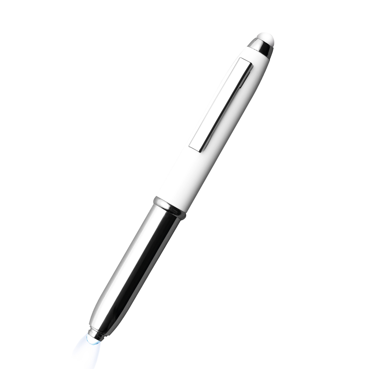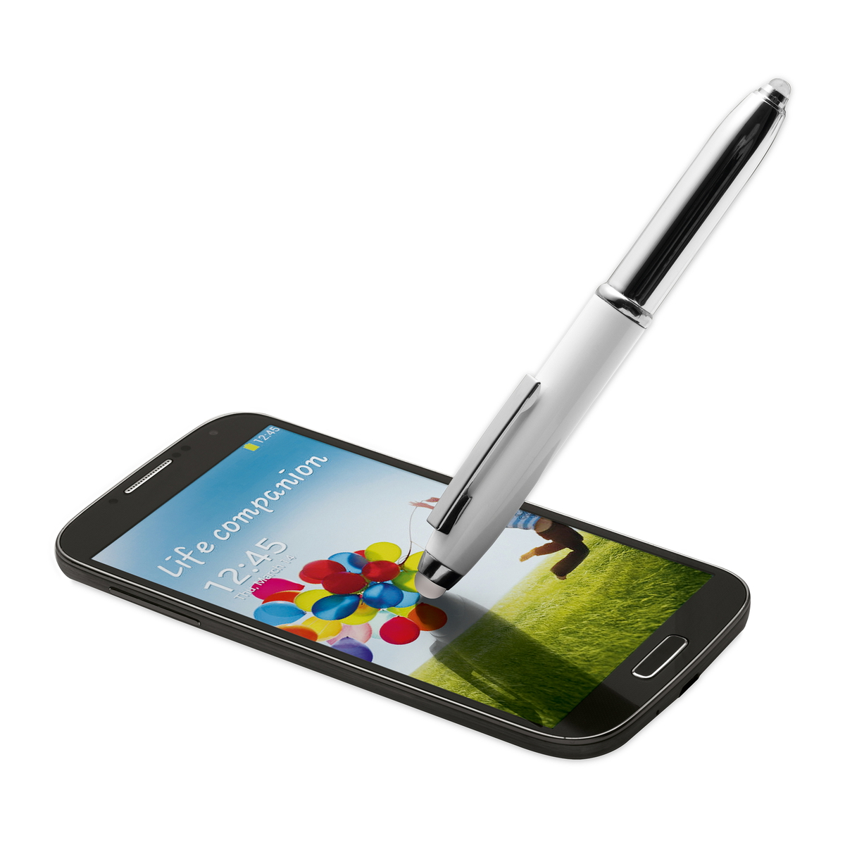 Ein Kombination aus Eingabestift für kapazitive Displays von Smartphones und Tabletcomputern, LED-Leuchte und Schreibgerät.