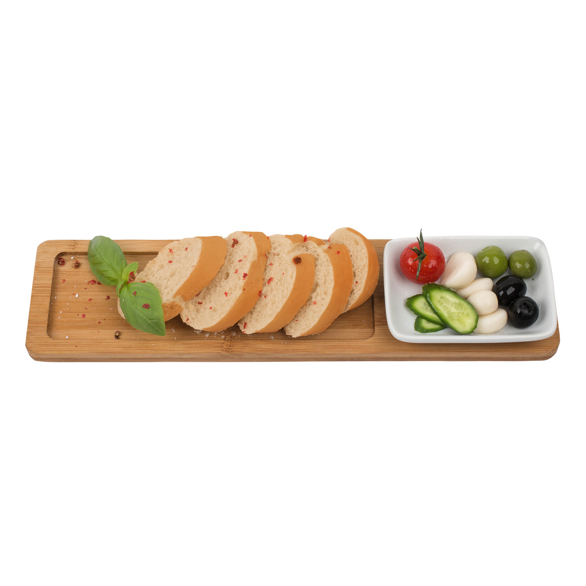 Schönes, stilvolles Bambus-Set für das Amuse gueule vorab, für Baguette, Olivenöl und Salz oder für Naschereien zwischendurch.
