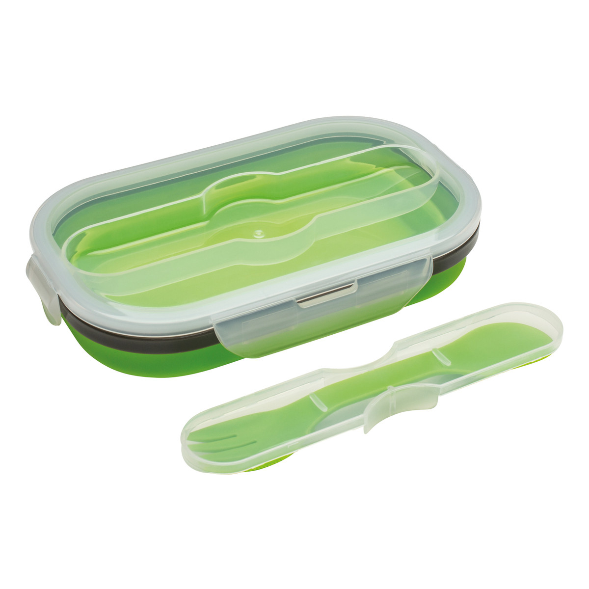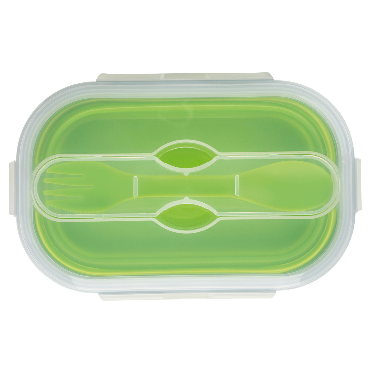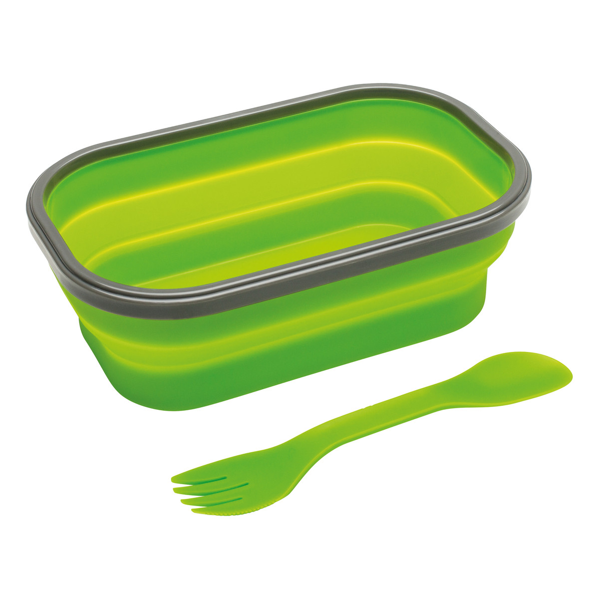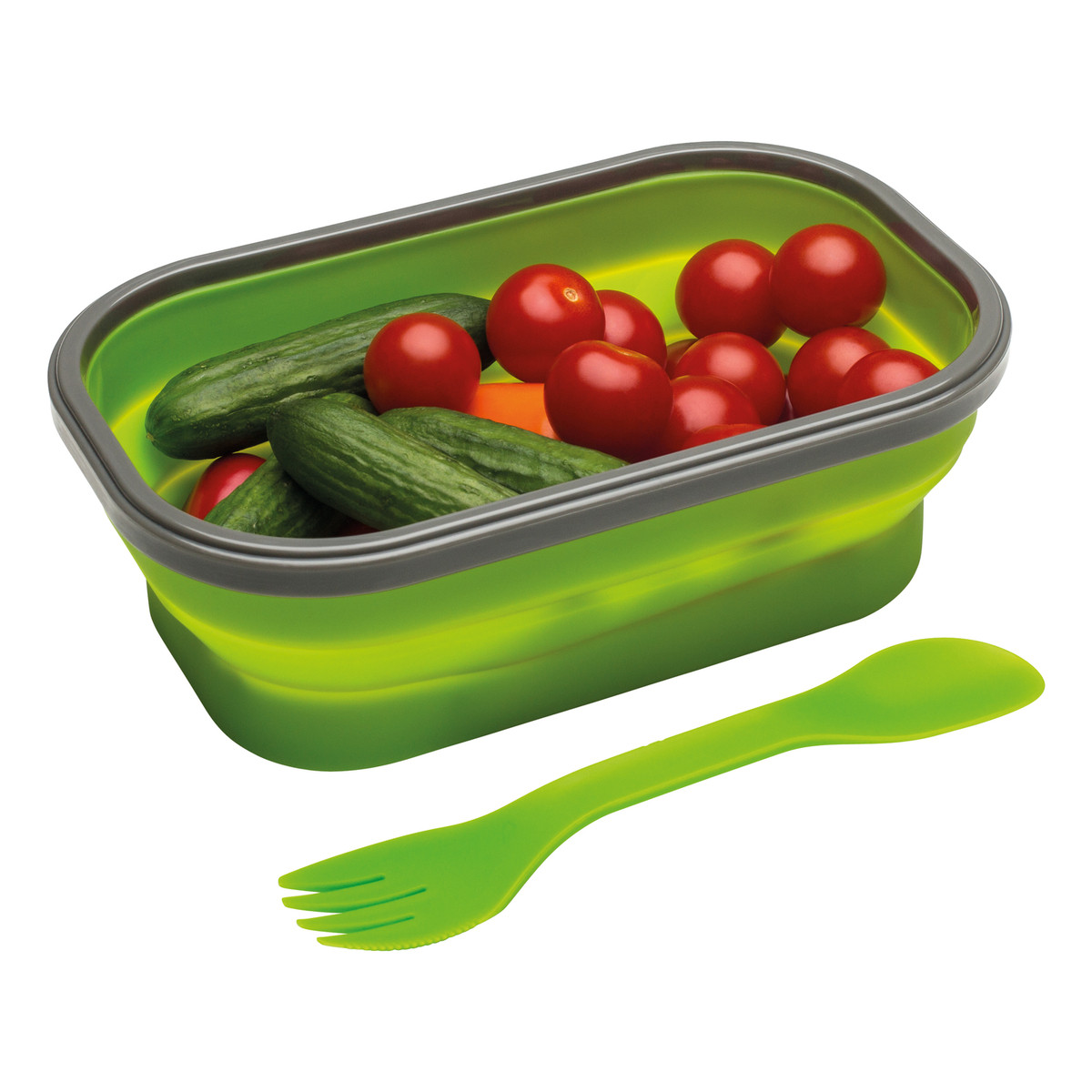 Für die Pausenmahlzeit oder fürs Picknick: Platzsparender, faltbarer Speisenbehälter aus Silikon mit Einzelfach und Löffel und Gabel in Besteckhalterung. Mikrowellengeeignet.