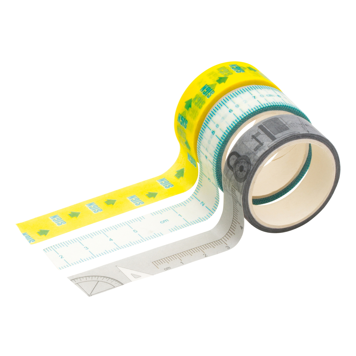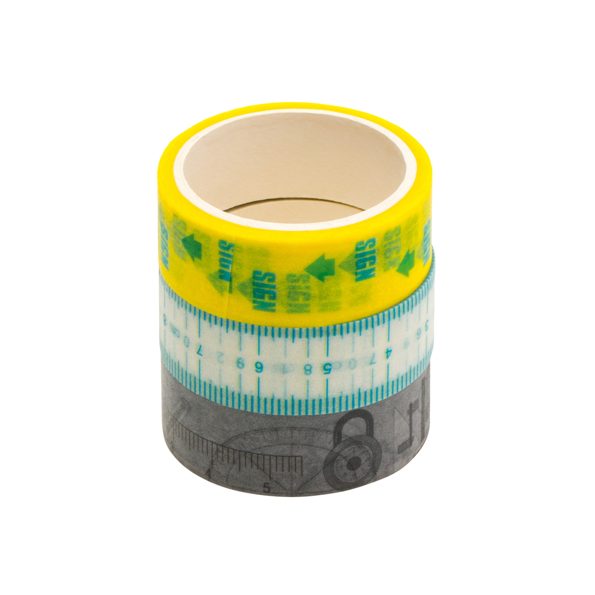 Schaffen Sie den grauen Büroalltag ab. Drei verschiedene Motive auf selbstklebendem Band verschönern Aktenordner, Büroaccessoires, nehmen Maß und helfen beim Markieren wichtiger Unterlagen.