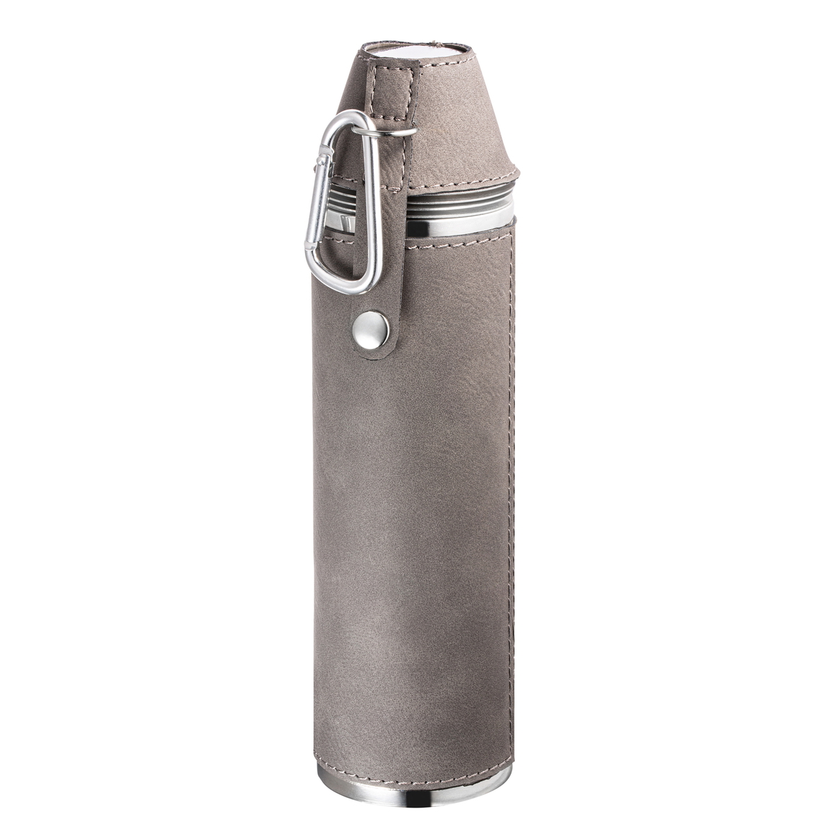 Dieser Flachmann in Flaschenform wird zusammen mit 4 kleinen Pinnchen geliefert und ist somit perfekt für unterwegs. Mit dem seitlich angebrachten Karabiner lässt er sich einfach und sicher befestigen. Das PU Material ist strapazierfähig und hat eine besonders edle Haptik. Durch die darunter liegende Farbfolie kann per Lasergravur eine besonders eindrucksvolle Veredelung mit eigenem Logo erreicht werden.