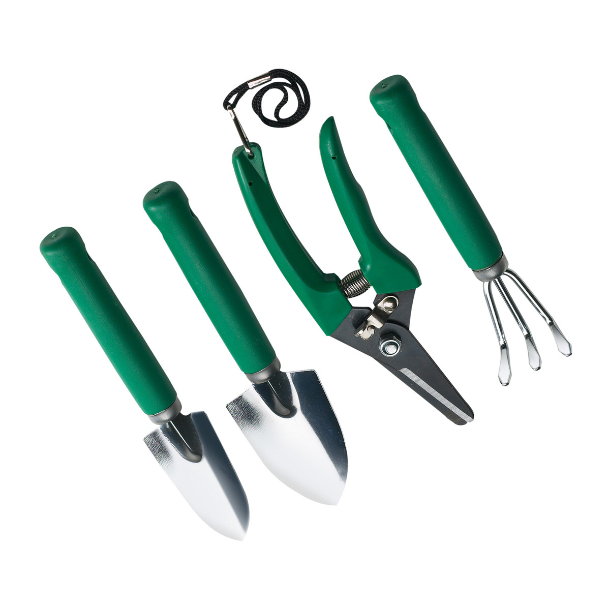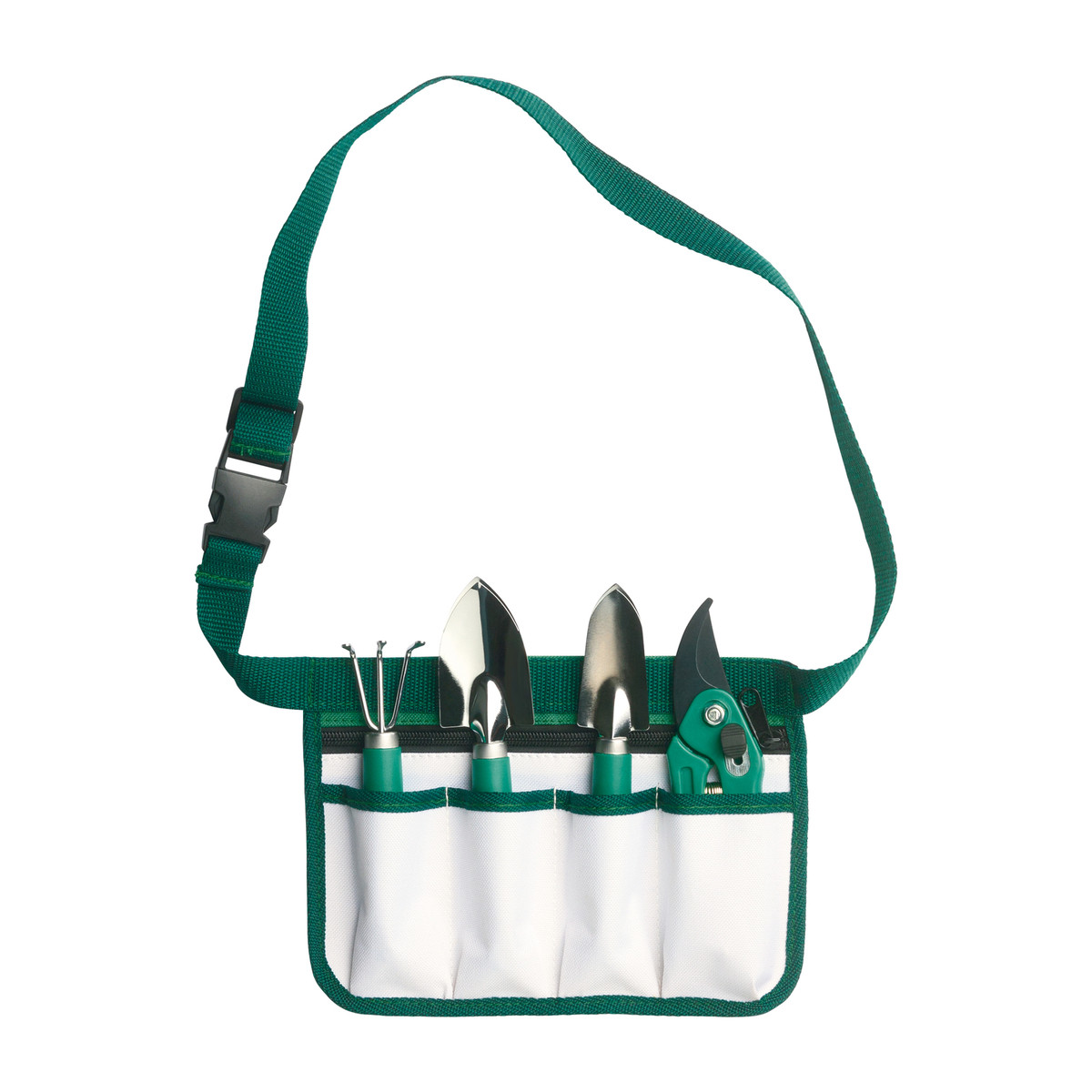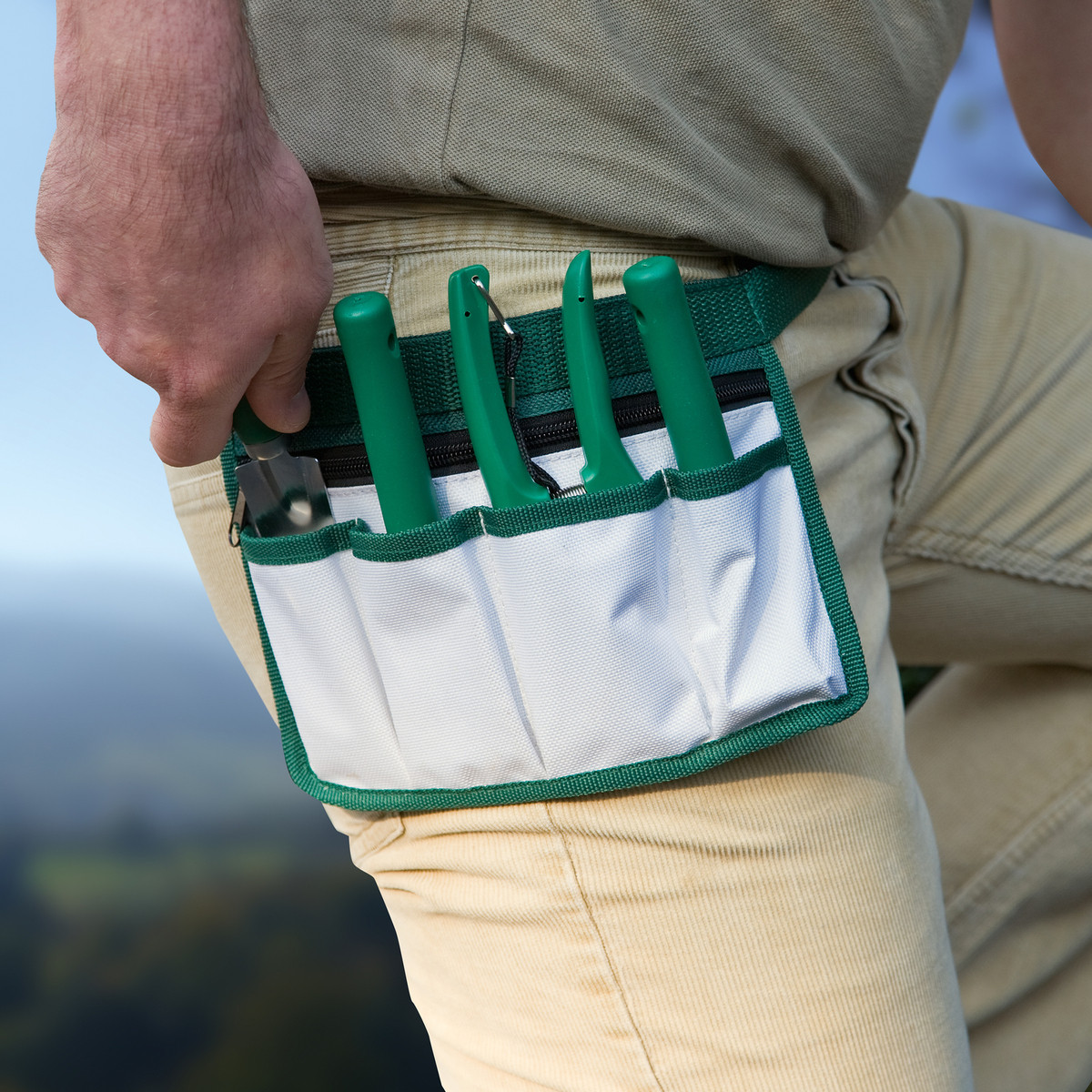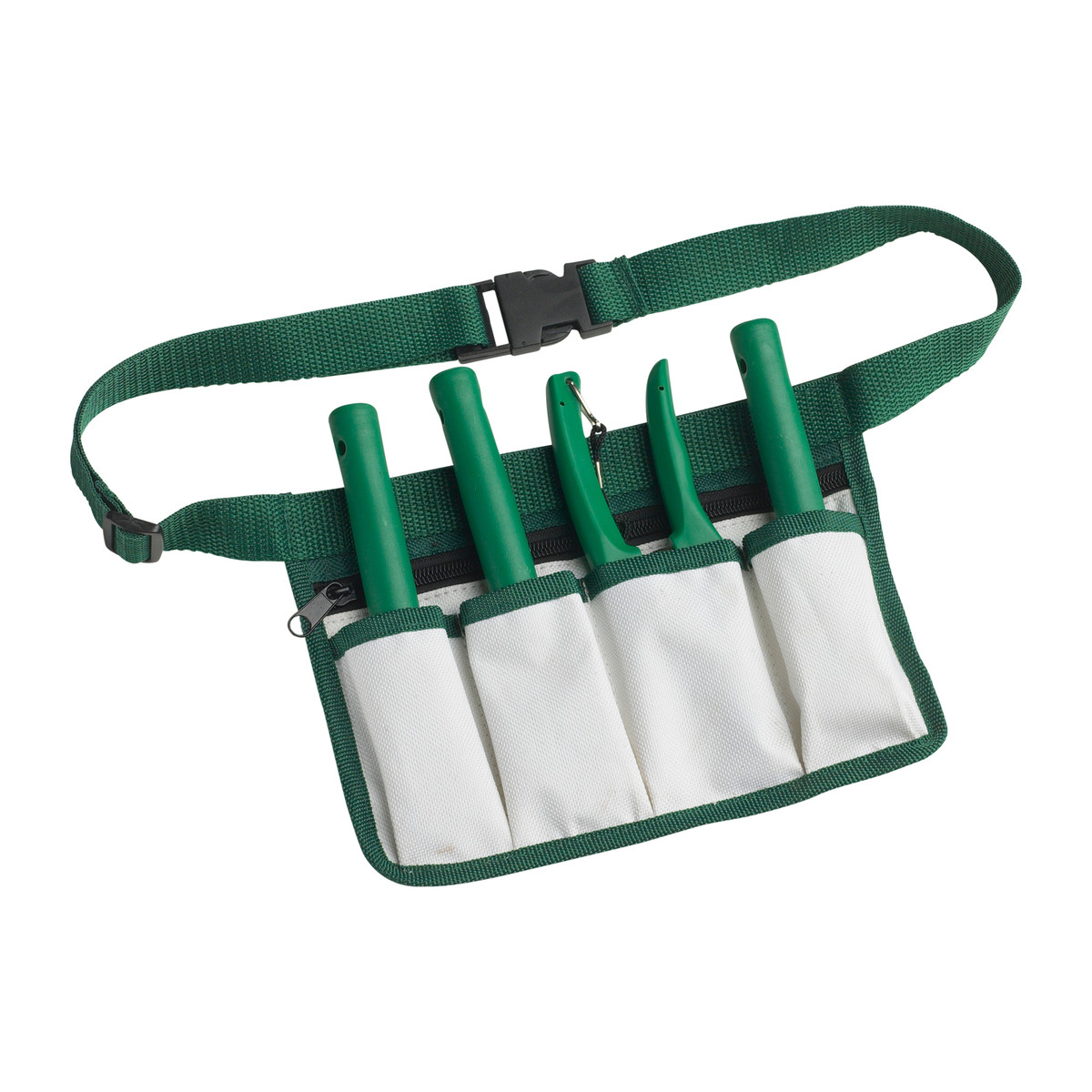 Die schöne Gartenschürze zum Umschnallen beherbergt zwei Blumenkellen, eine Harke und eine Gartenschere mit Kunststoffgriff. In der integrierten Reißverschlusstasche ist Platz für weitere wichtige Utensilien.