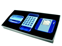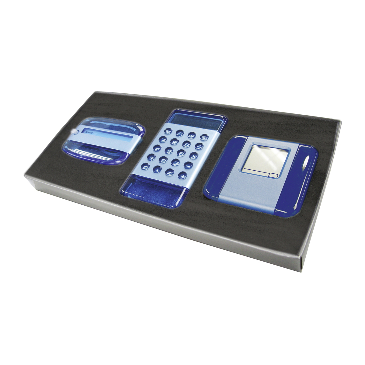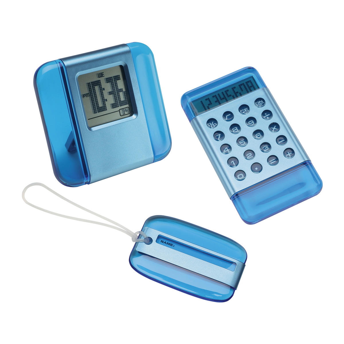 Das angesagte, transparente Acrylset, bestehend aus Rechner, Uhr und Kofferanhänger ist ein perfekter Reisebegleiter für Businessmenschen.