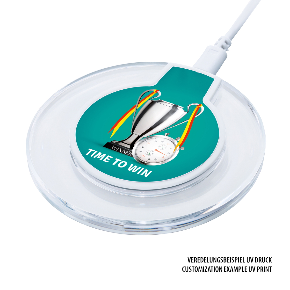 Ohne Verpackung betragen die Artikelmaße 98 x 98 x 10 mm. Die maximale Werbefläche beträgt 59 x 73 mm. Die kabellose Ladestation bietet viel Platz für Ihre Werbebotschaft, da die gesamte Weißfläche bedruckbar ist. Veredelungen sind möglich mit Tampondruck und UV Druck.