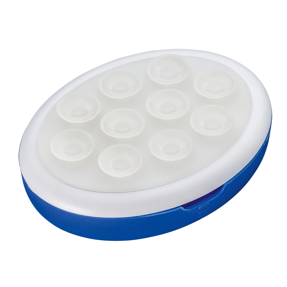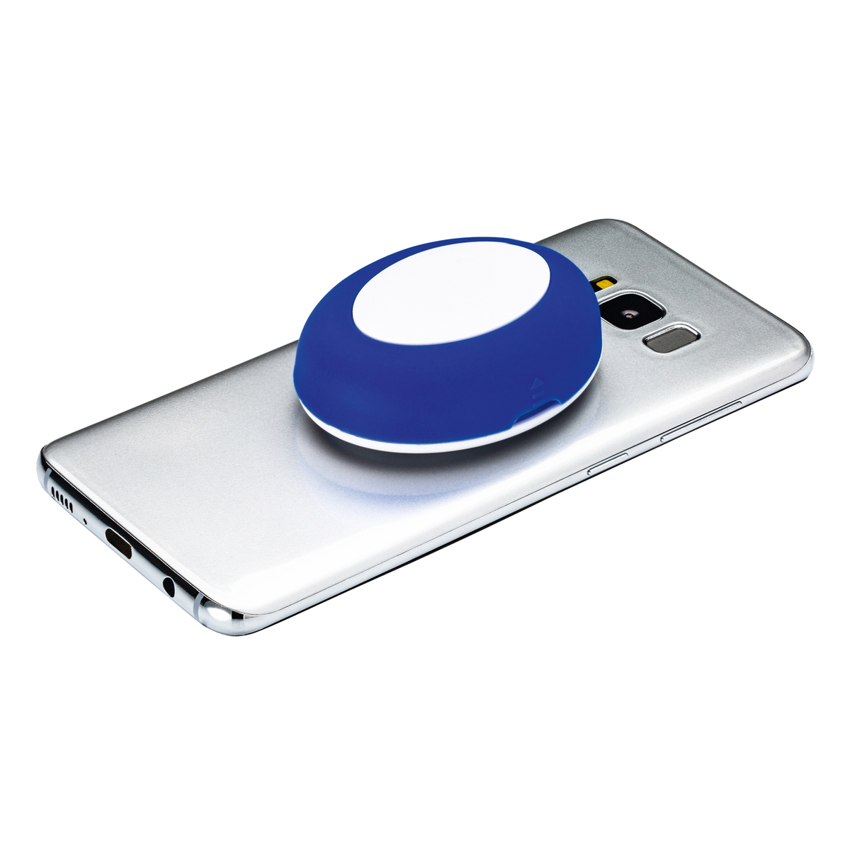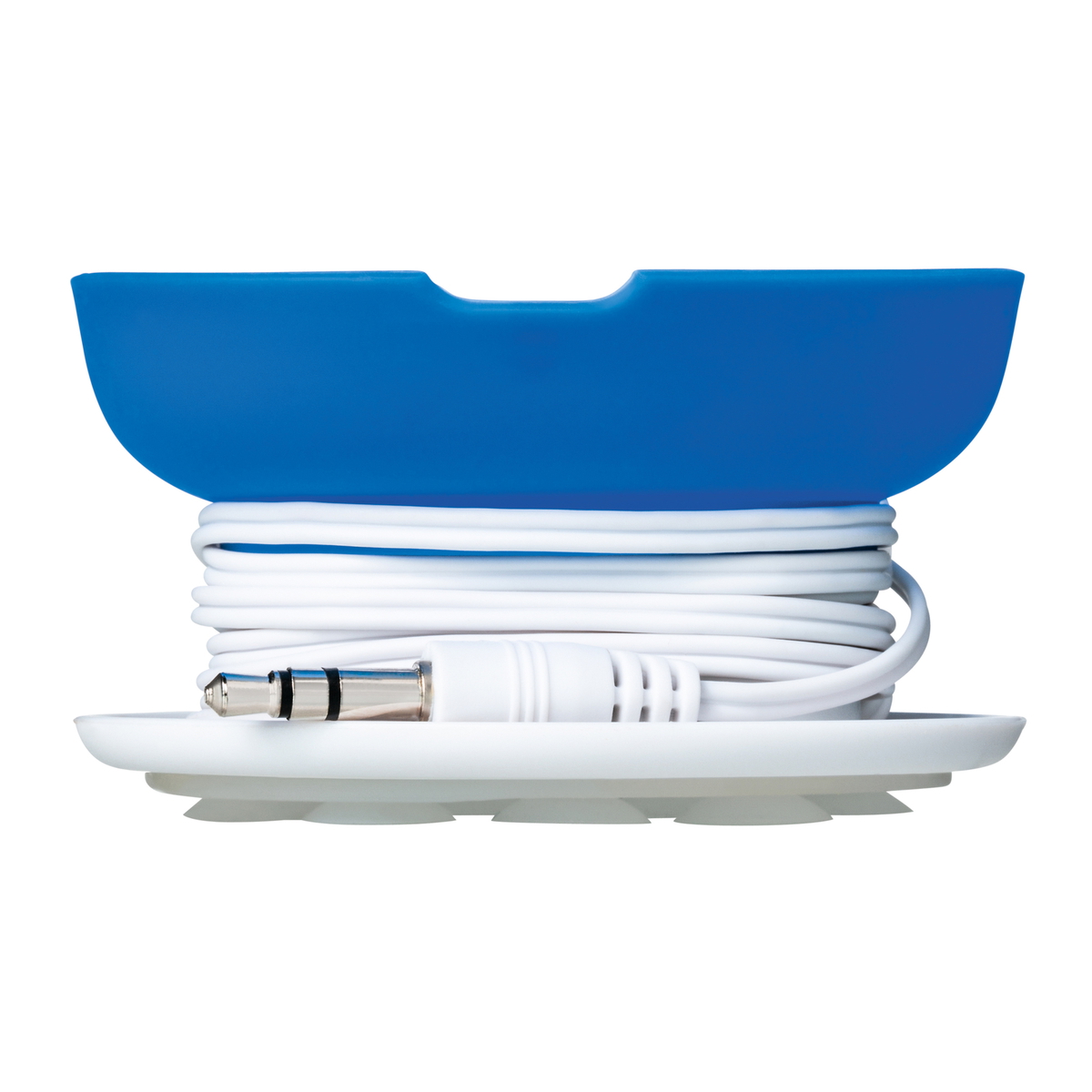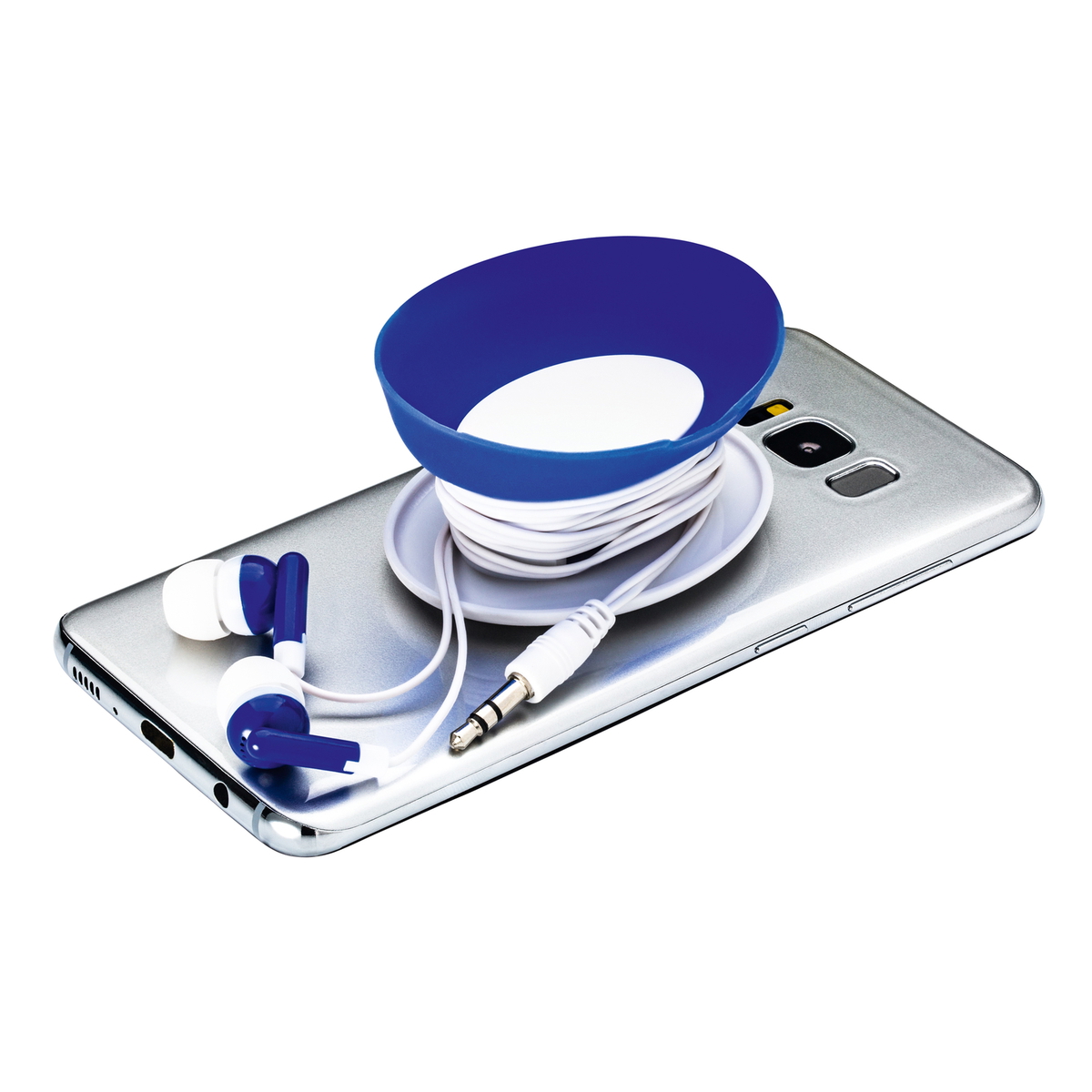 In dieser kleinen Box befindet sich ein Set Kopfhörer mit farblich passend abgesetzten Stöpseln. Die Box wird mit Saugnäpfen direkt am Smartphone befestigt und kann durch Ausklappen als Ständer fürs Gerät genutzt werden. Per UV-Druck veredelt, wirkt es besonders eindrucksvoll.