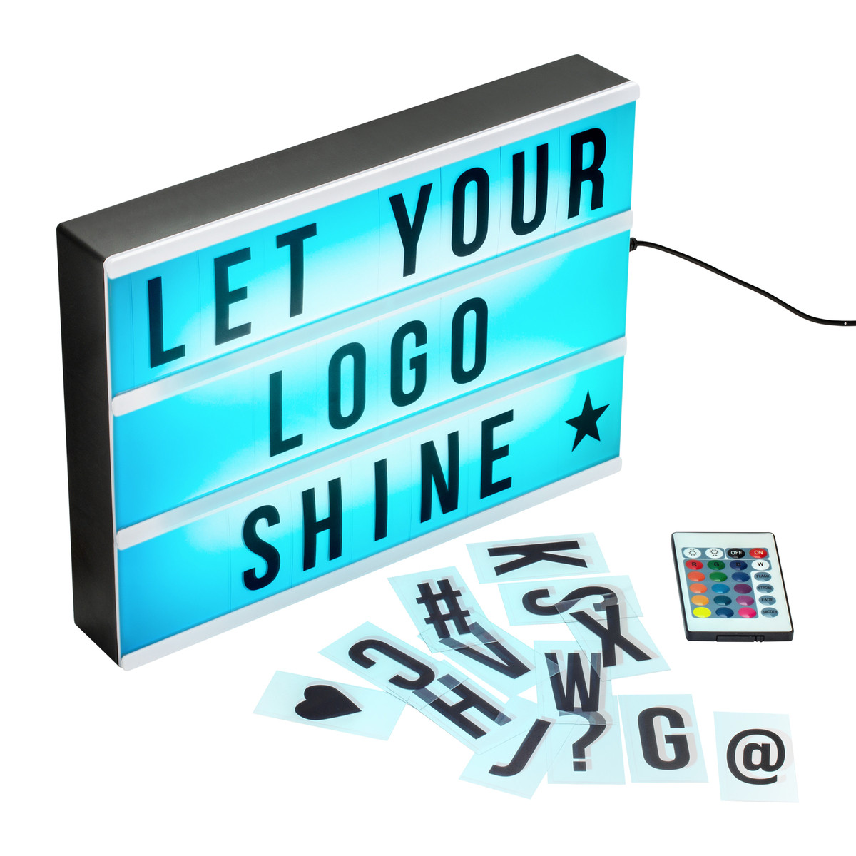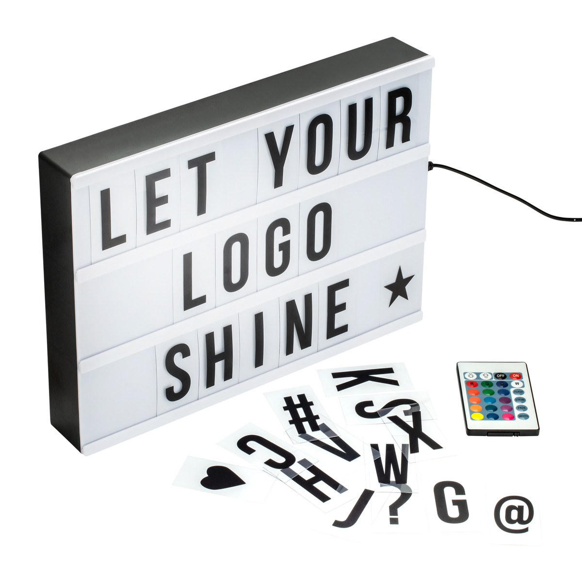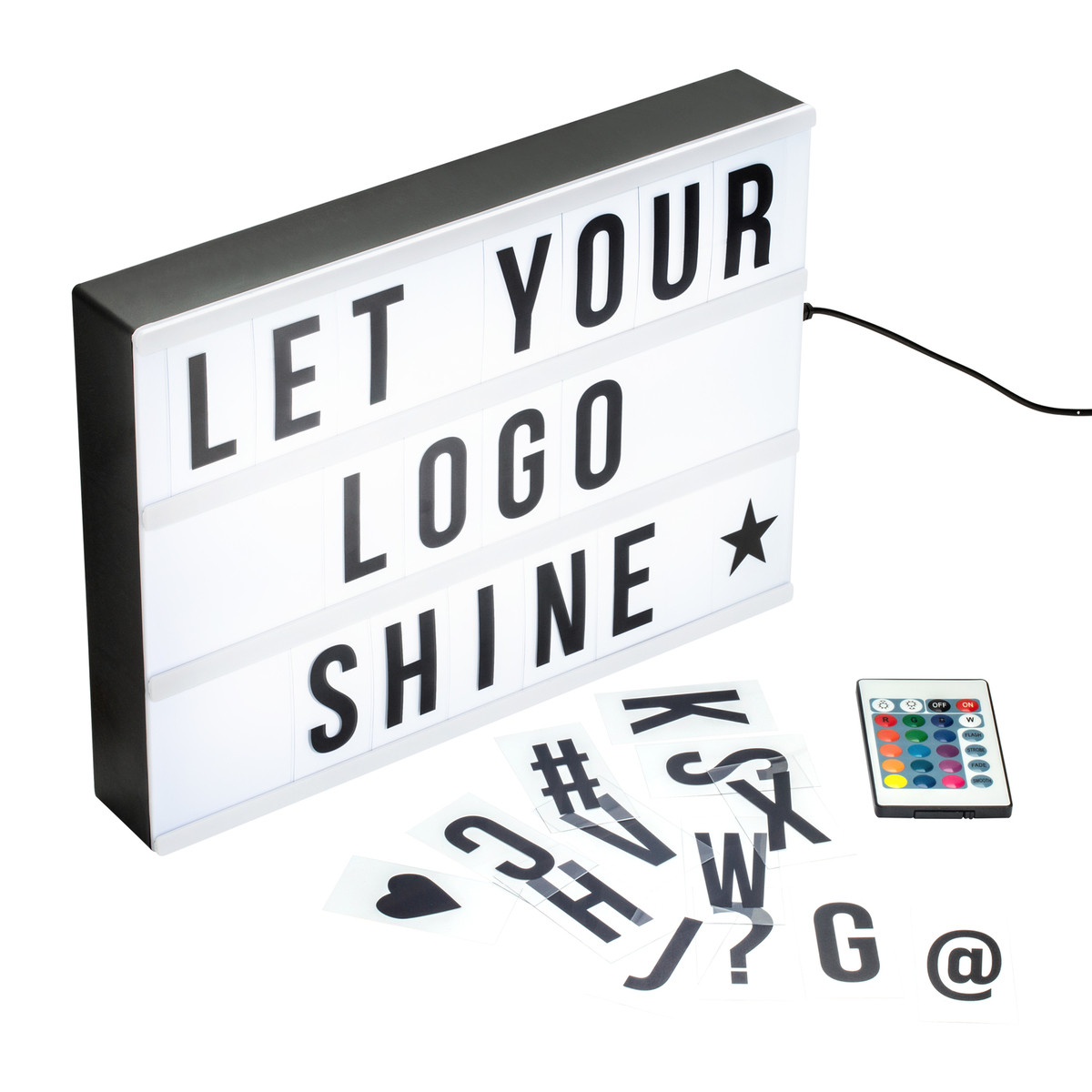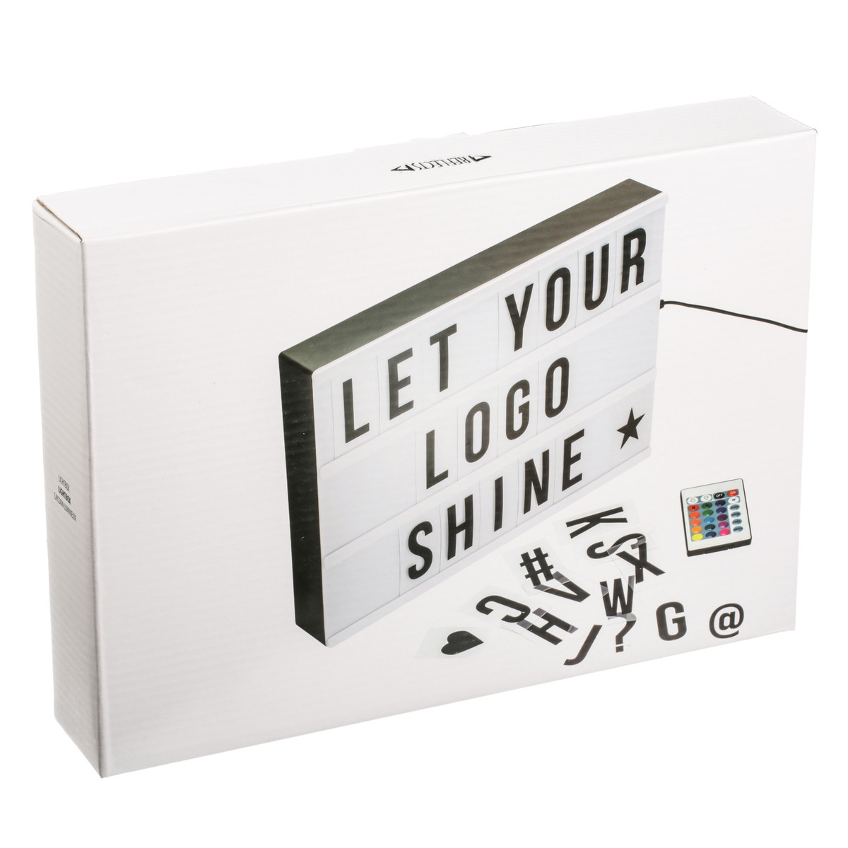 Hier kommt Ihre Botschaft ganz groß raus! Die Lightbox im A4 Format hat eine Fernbedienung fürs Licht, wechselt auf Wunsch die Farbe oder leuchtet in nur einem von Ihnen fest eingestellten Ton. Das Licht kann eingeblendet oder auf Blinkmodus umgestellt werden. Messages lassen sich mit insgesamt 85 Buchstaben gestalten. Die Leuchttafel kann per mitgeliefertem USB-Kabel über den PC, eine Powerbank oder ein Netzteil betrieben werden. Alternativ läuft der Betrieb über Batterie.
