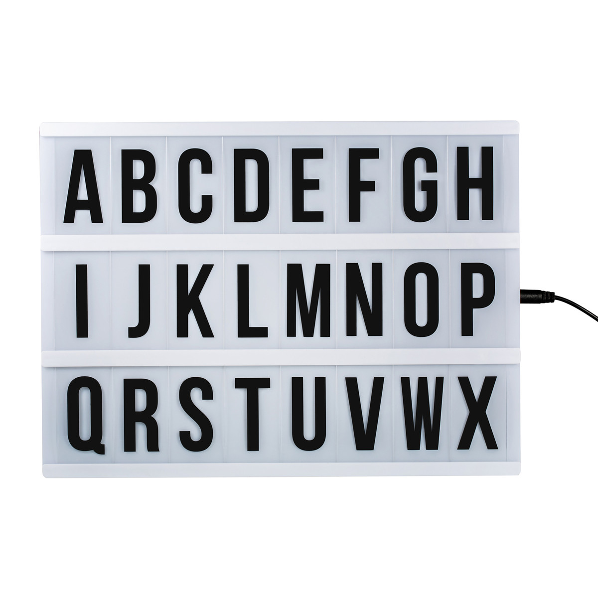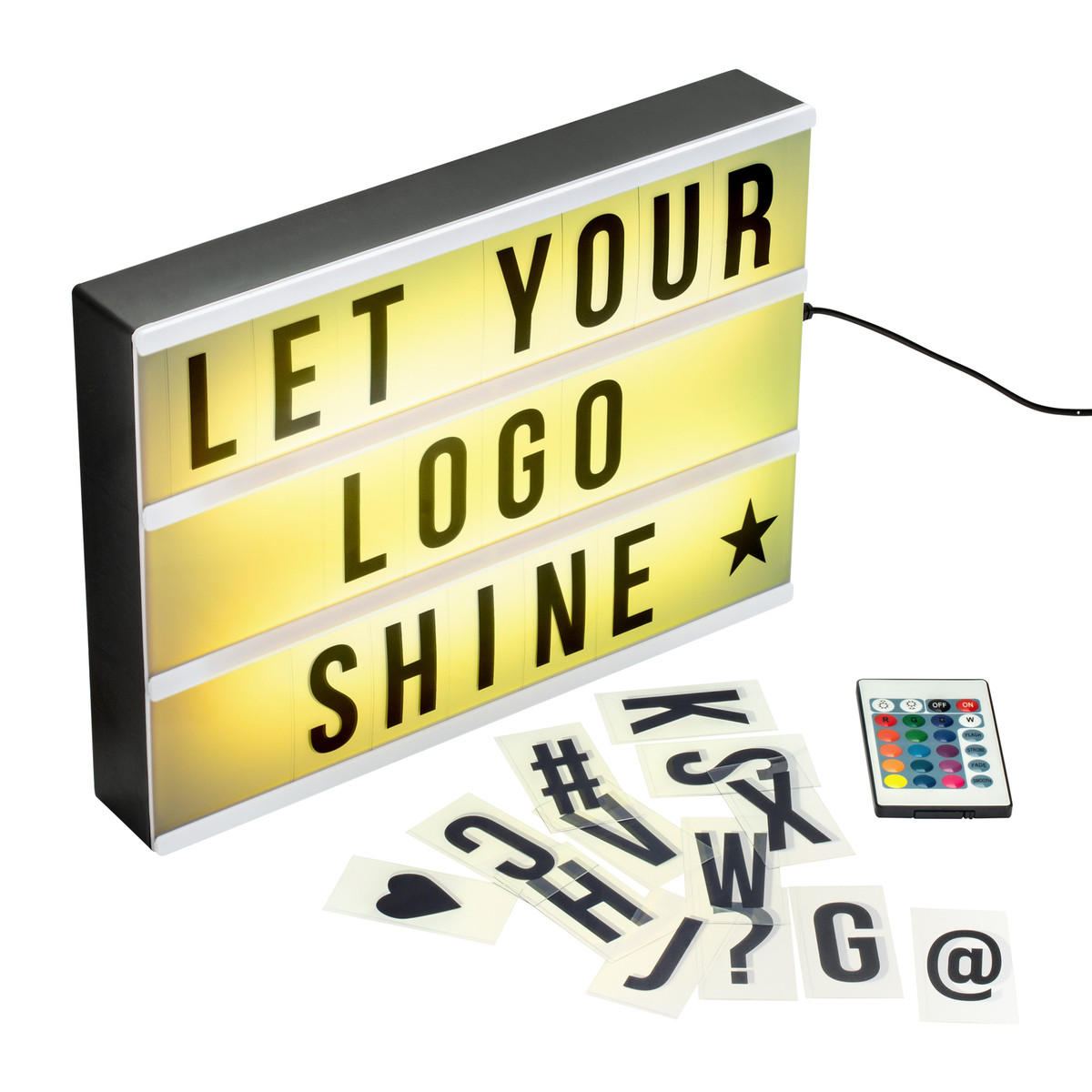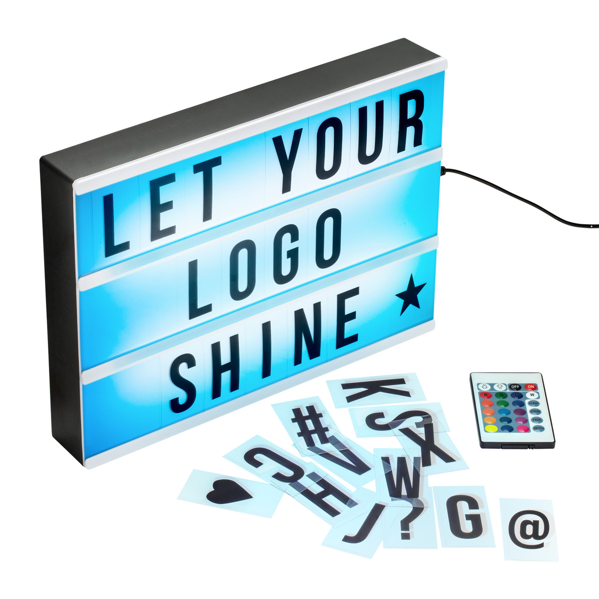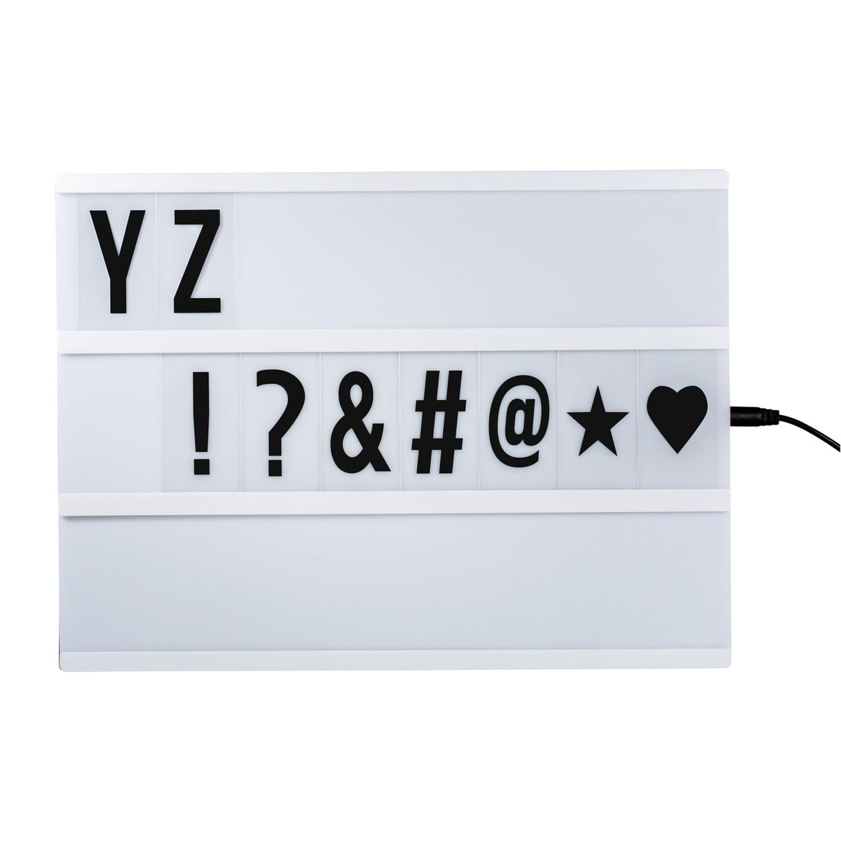 Hier kommt Ihre Botschaft ganz groß raus! Die Lightbox im A4 Format hat eine Fernbedienung fürs Licht, wechselt auf Wunsch die Farbe oder leuchtet in nur einem von Ihnen fest eingestellten Ton. Das Licht kann eingeblendet oder auf Blinkmodus umgestellt werden. Messages lassen sich mit insgesamt 85 Buchstaben gestalten. Die Leuchttafel kann per mitgeliefertem USB-Kabel über den PC, eine Powerbank oder ein Netzteil betrieben werden. Alternativ läuft der Betrieb über Batterie.