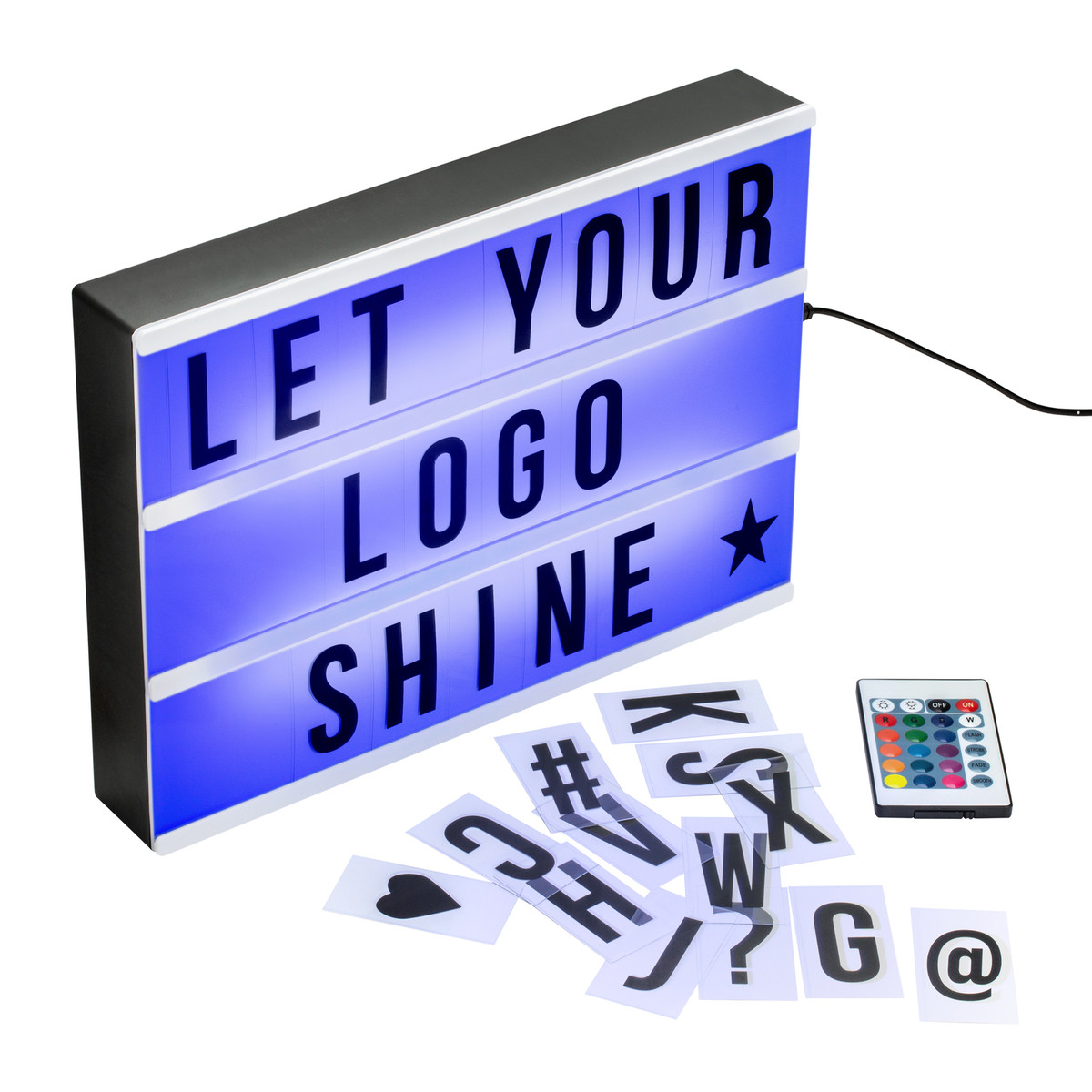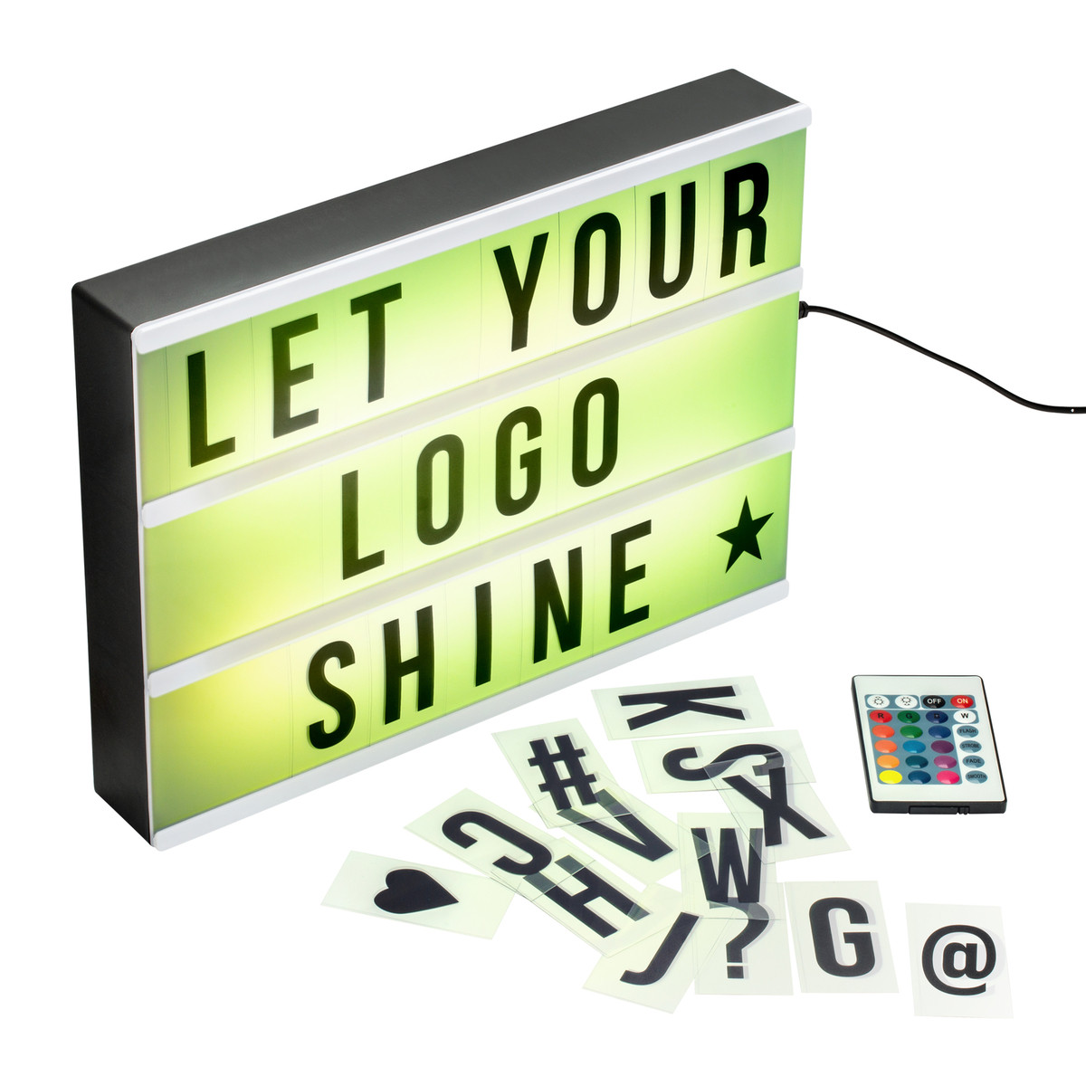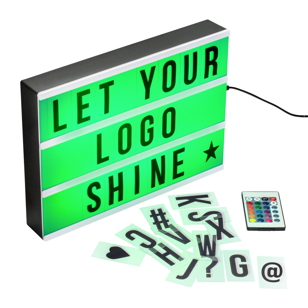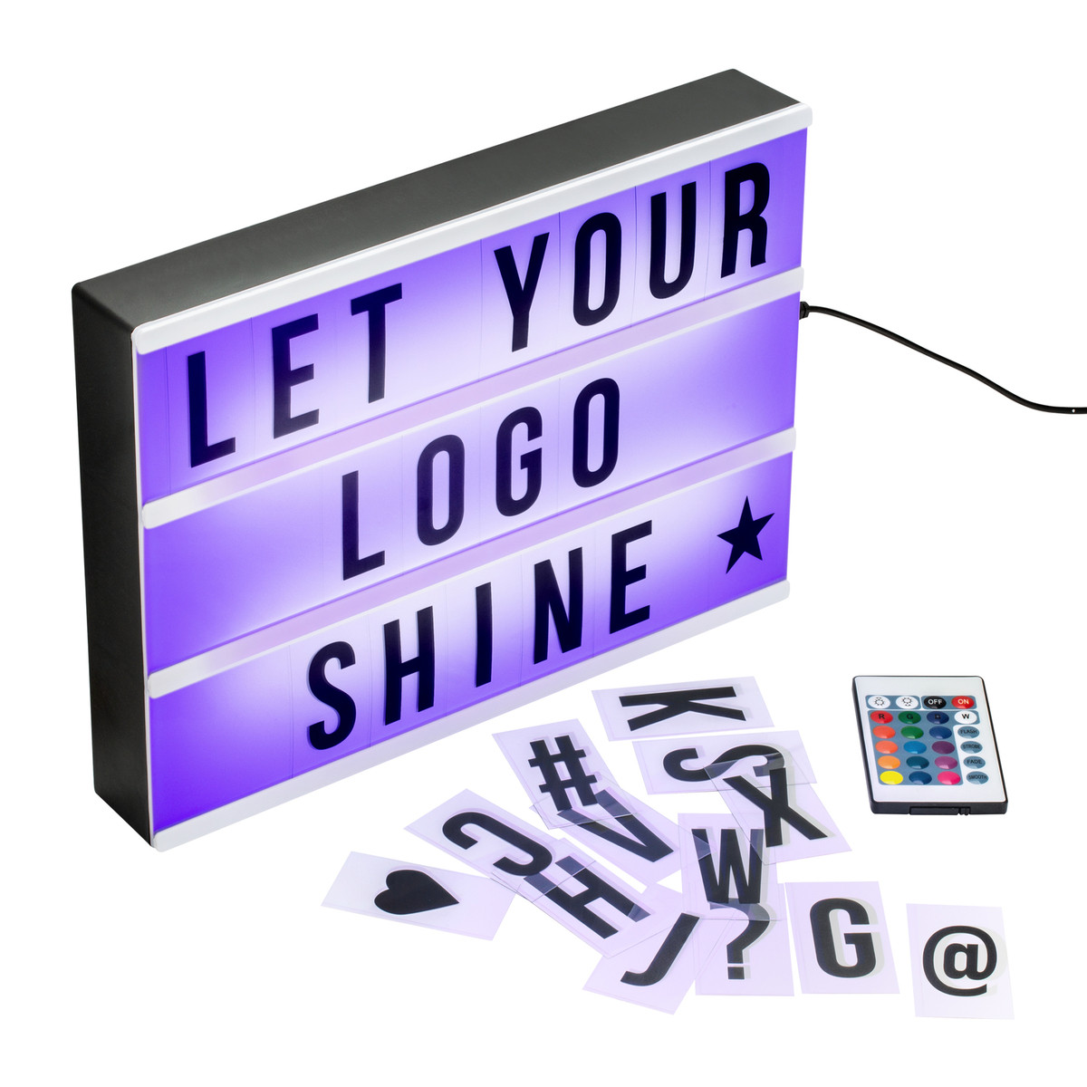Hier kommt Ihre Botschaft ganz groß raus! Die Lightbox im A4 Format hat eine Fernbedienung fürs Licht, wechselt auf Wunsch die Farbe oder leuchtet in nur einem von Ihnen fest eingestellten Ton. Das Licht kann eingeblendet oder auf Blinkmodus umgestellt werden. Messages lassen sich mit insgesamt 85 Buchstaben gestalten. Die Leuchttafel kann per mitgeliefertem USB-Kabel über den PC, eine Powerbank oder ein Netzteil betrieben werden. Alternativ läuft der Betrieb über Batterie.