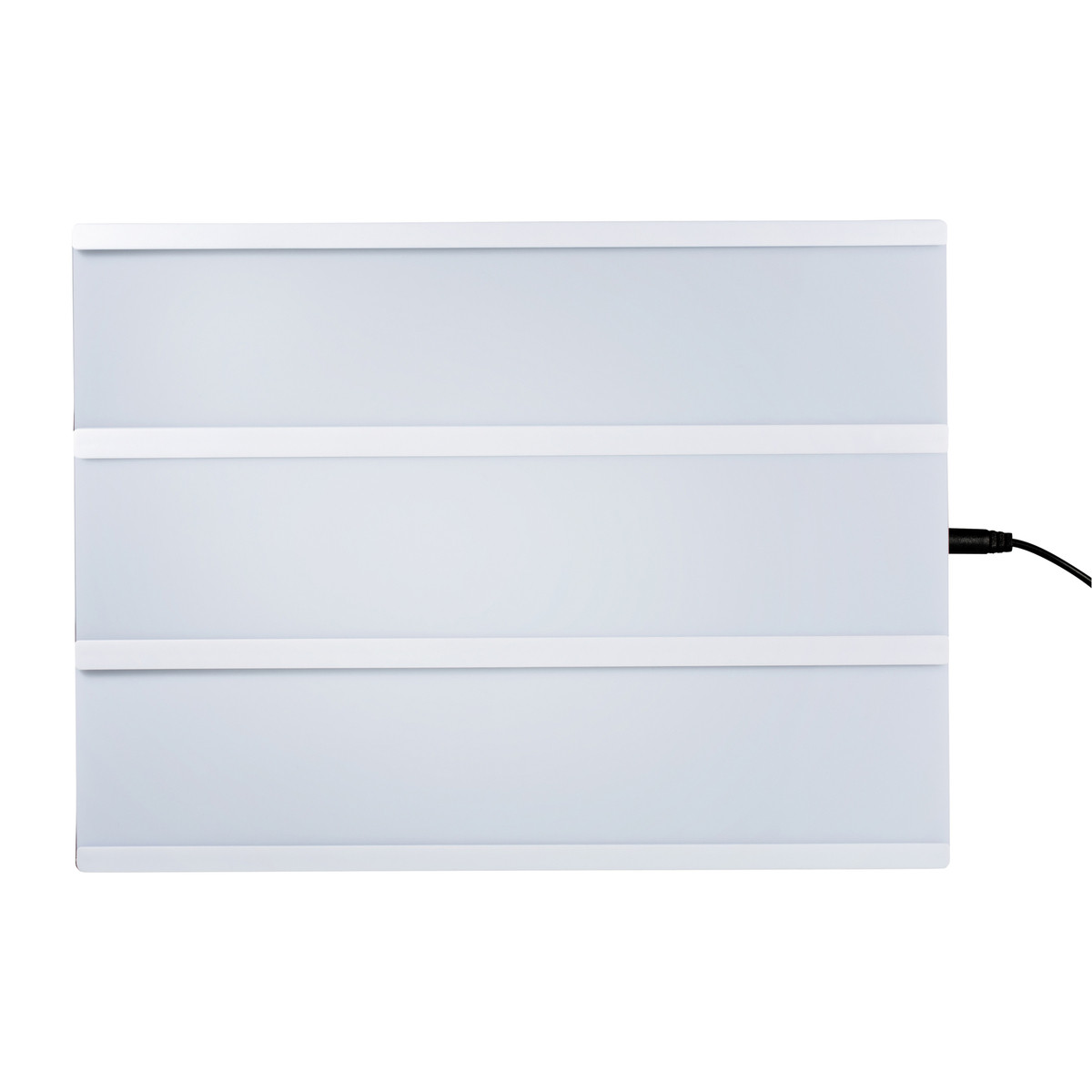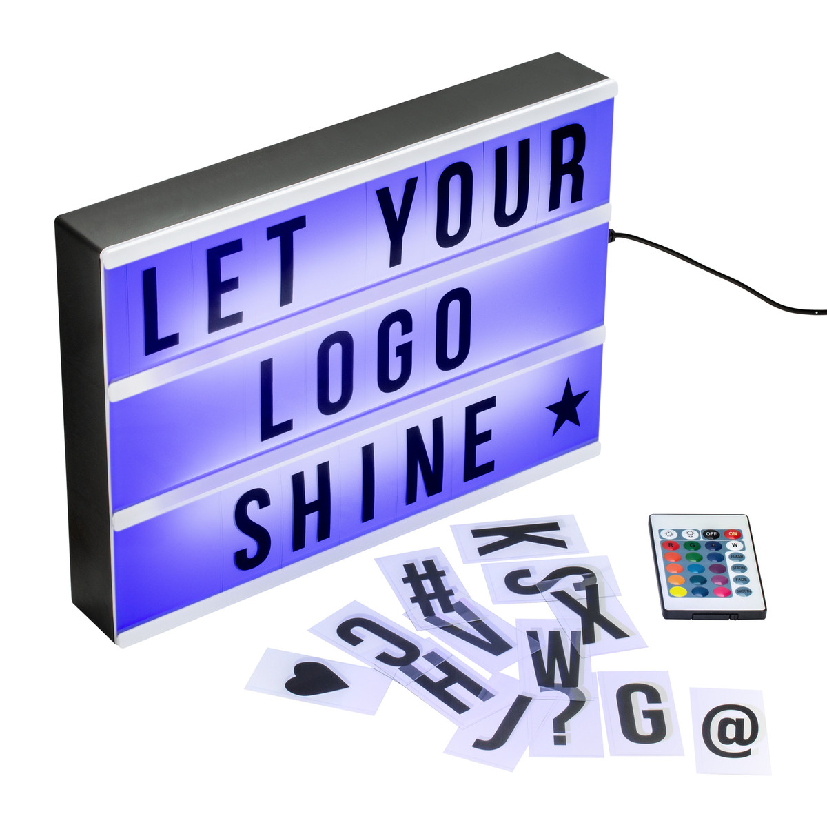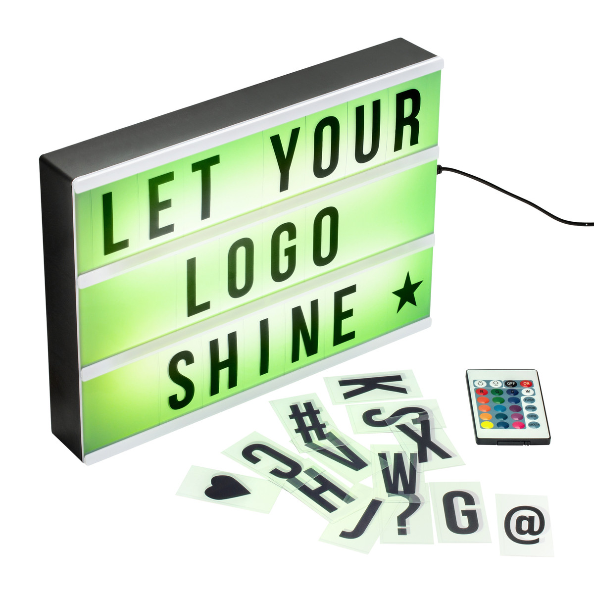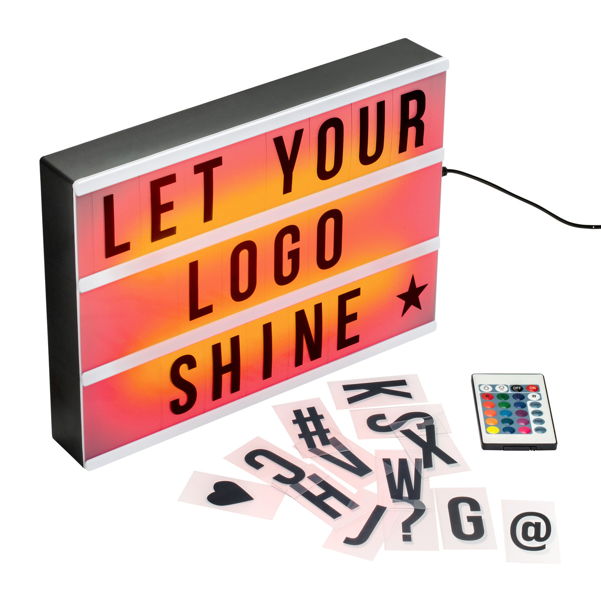 Hier kommt Ihre Botschaft ganz groß raus! Die Lightbox im A4 Format hat eine Fernbedienung fürs Licht, wechselt auf Wunsch die Farbe oder leuchtet in nur einem von Ihnen fest eingestellten Ton. Das Licht kann eingeblendet oder auf Blinkmodus umgestellt werden. Messages lassen sich mit insgesamt 85 Buchstaben gestalten. Die Leuchttafel kann per mitgeliefertem USB-Kabel über den PC, eine Powerbank oder ein Netzteil betrieben werden. Alternativ läuft der Betrieb über Batterie.