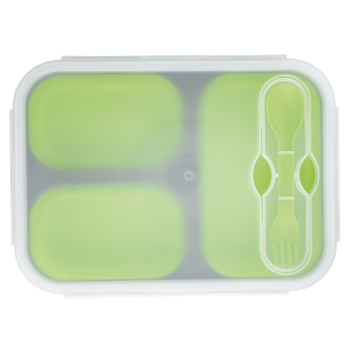Hier passt viel rein! Faltbarer, platzsparender Speisenbehälter aus Silikon mit drei Fächern für den Pausensnack und Mittagessen. Inklusive Löffel und Gabel im Besteckhalterung. Mikrowellengeeignet.