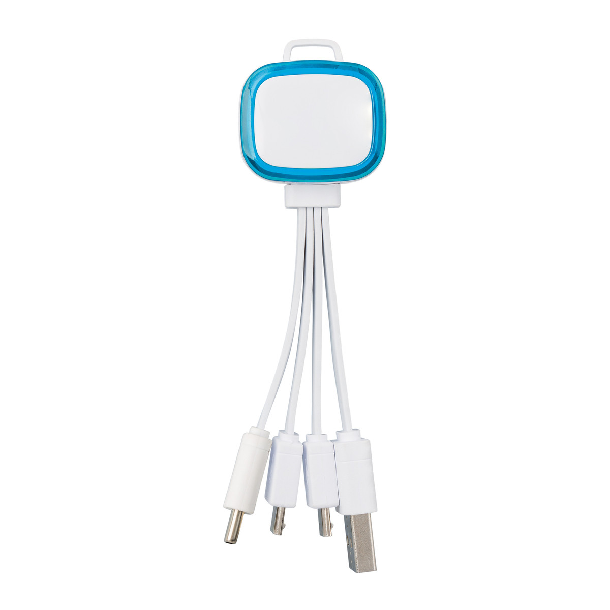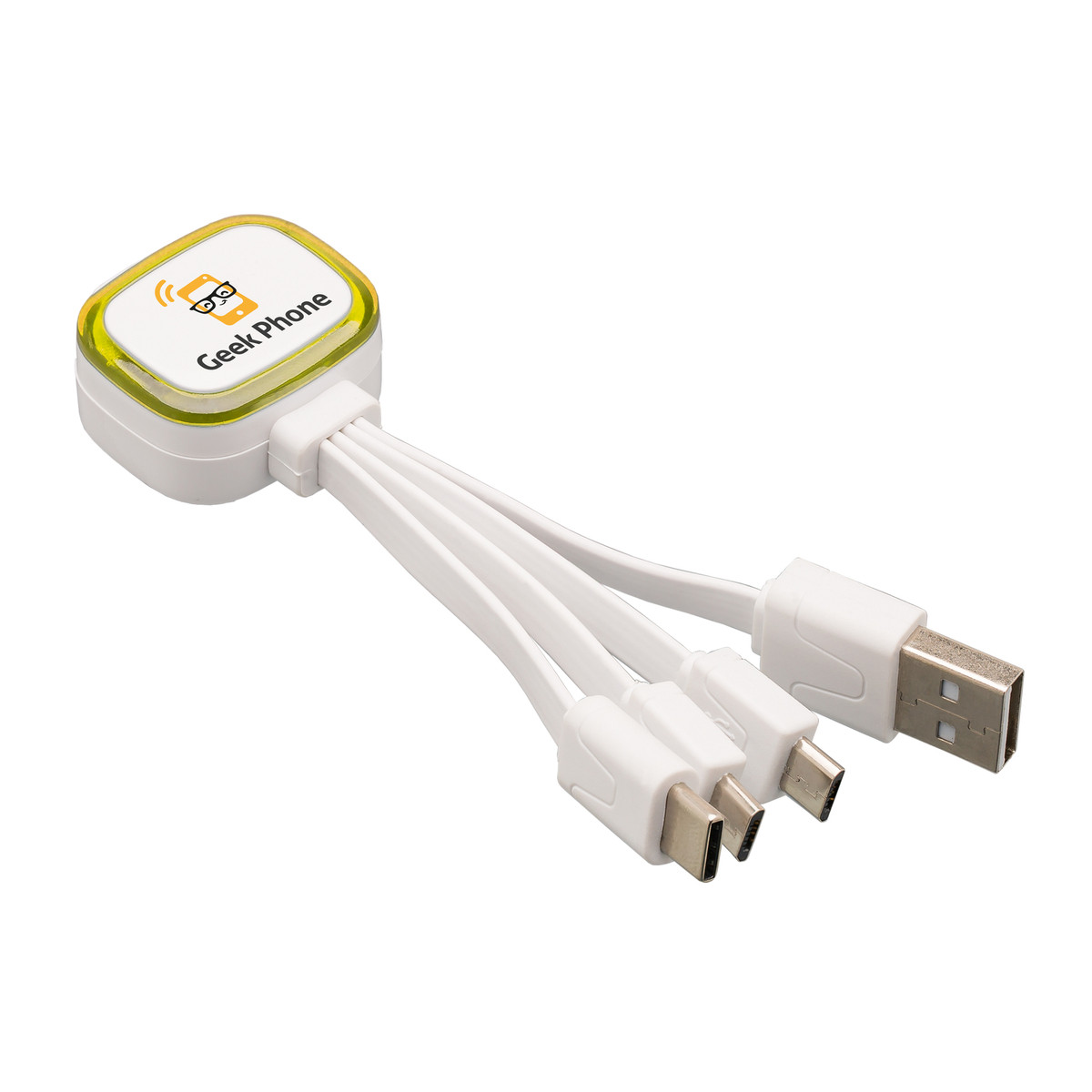 Mit dem 3-in-1 USB-Ladekabel können Sie mehrere Geräte von einer einzigen Stromquelle aus gleichzeitig laden. Es hat einen USB-Anschluss, 2x Mikro-USB-Anschlüsse und einen USB-C-Anschluss. Der umlaufende Farbring an der Werbefläche wird per LED hinterleuchtet.