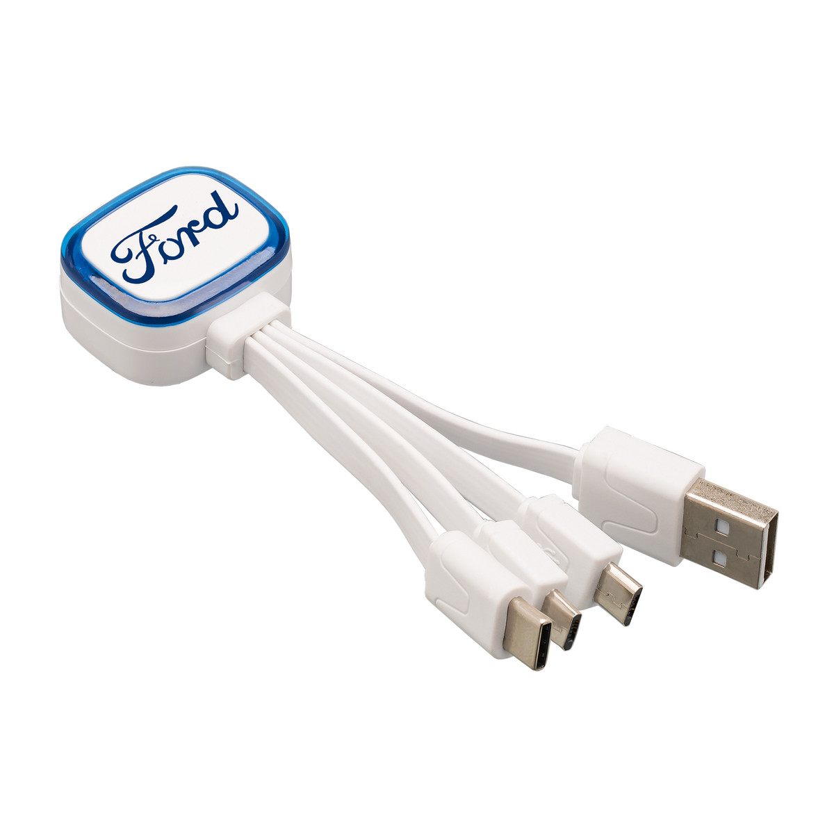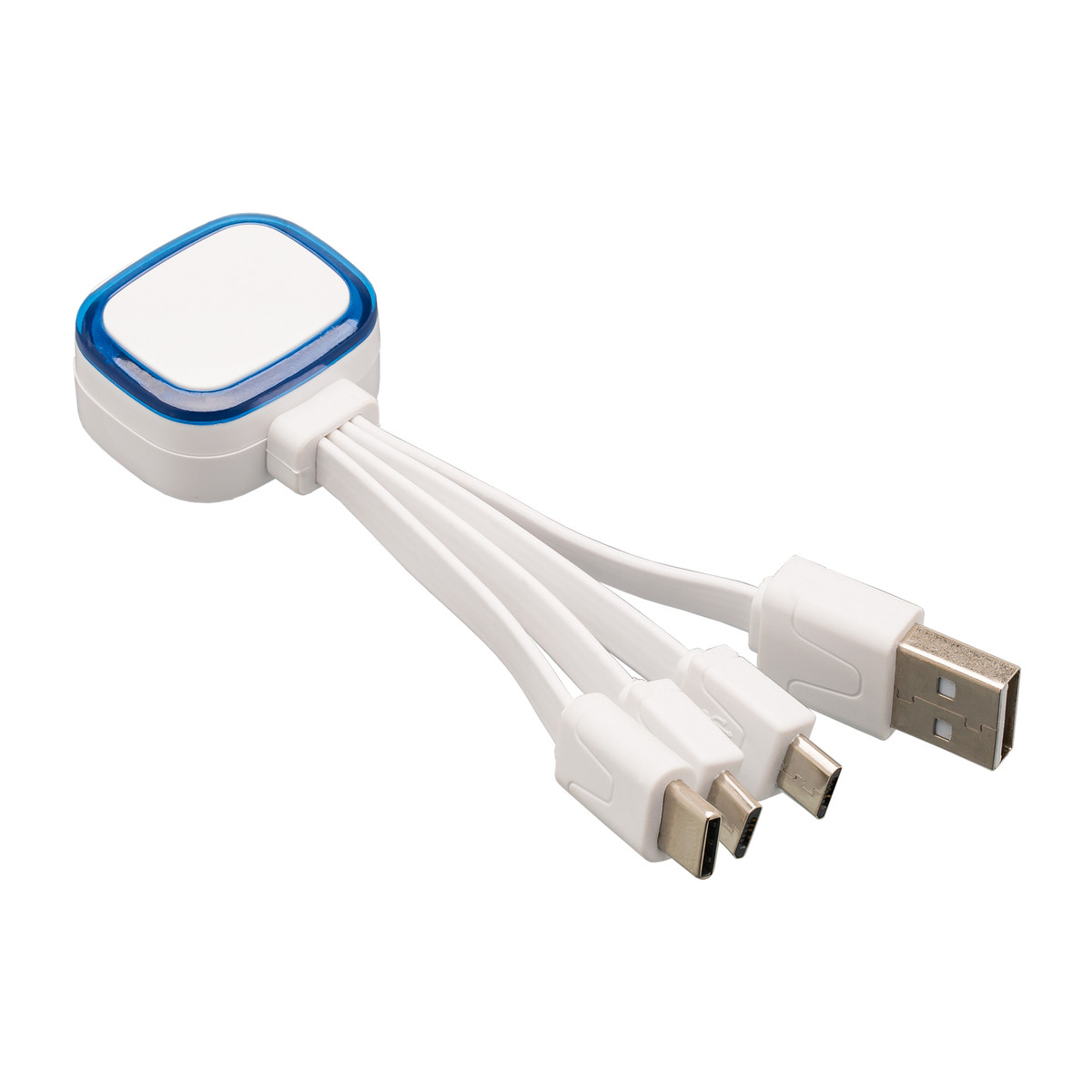 Mit dem 3-in-1 USB-Ladekabel können Sie mehrere Geräte von einer einzigen Stromquelle aus gleichzeitig laden. Es hat einen USB-Anschluss, 2x Mikro-USB-Anschlüsse und einen USB-C-Anschluss. Der umlaufende Farbring an der Werbefläche wird per LED hinterleuchtet.