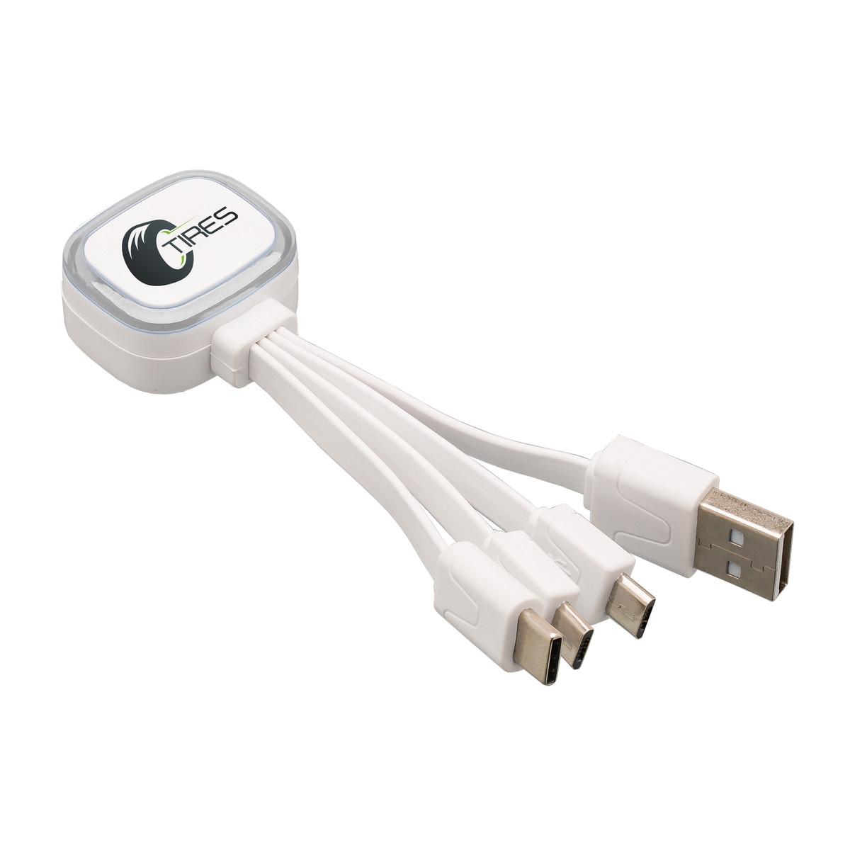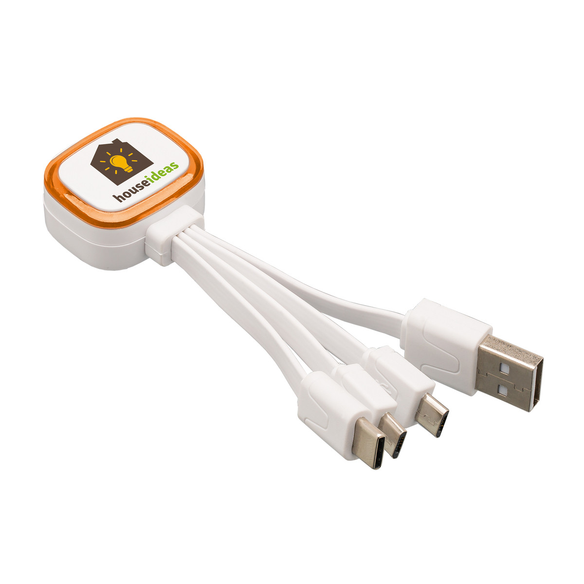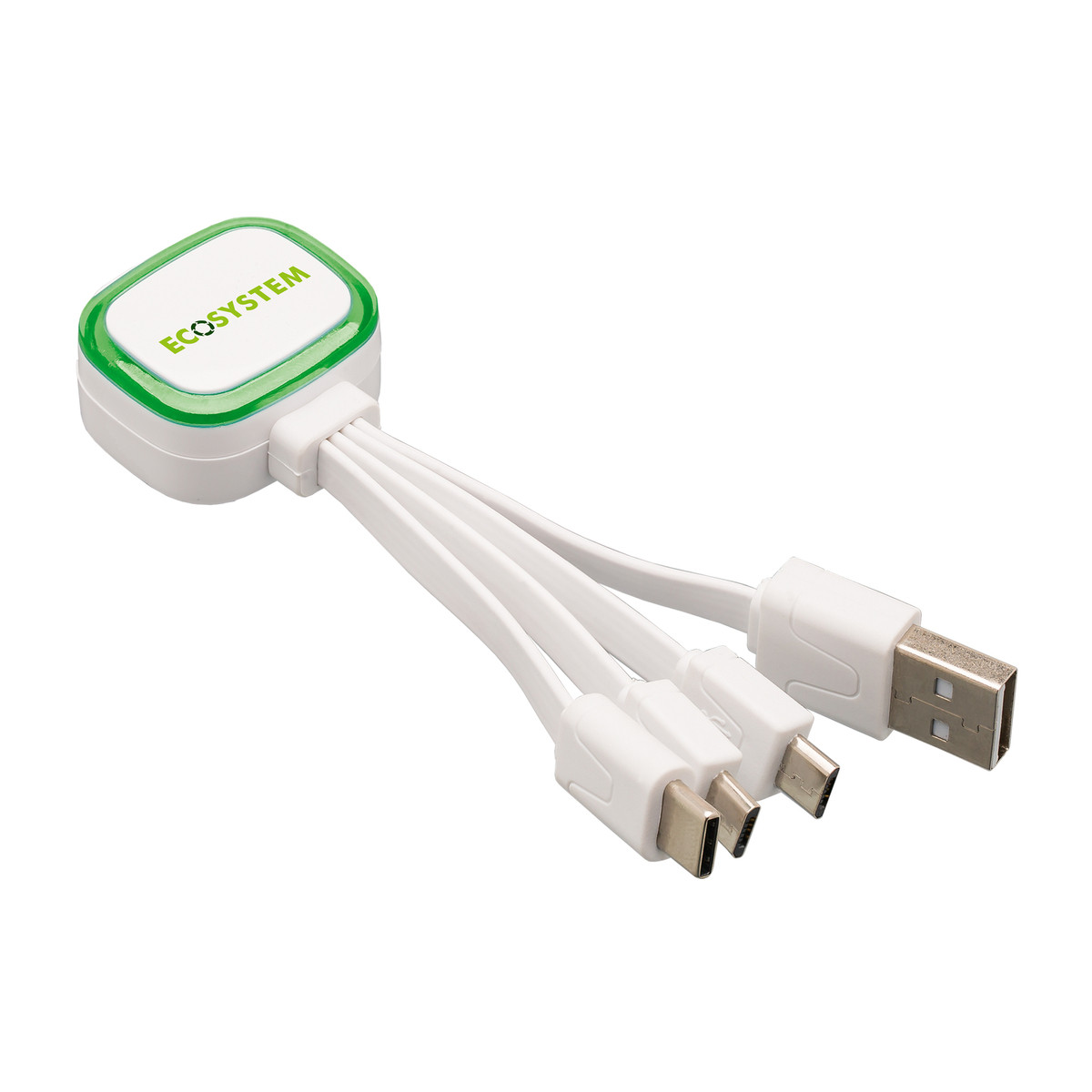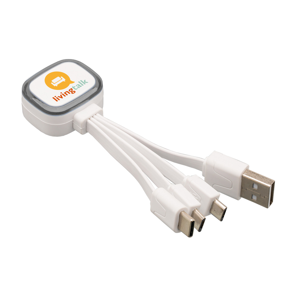 Mit dem 3-in-1 USB-Ladekabel können Sie mehrere Geräte von einer einzigen Stromquelle aus gleichzeitig laden. Es hat einen USB-Anschluss, 2x Mikro-USB-Anschlüsse und einen USB-C-Anschluss. Der umlaufende Farbring an der Werbefläche wird per LED hinterleuchtet.
