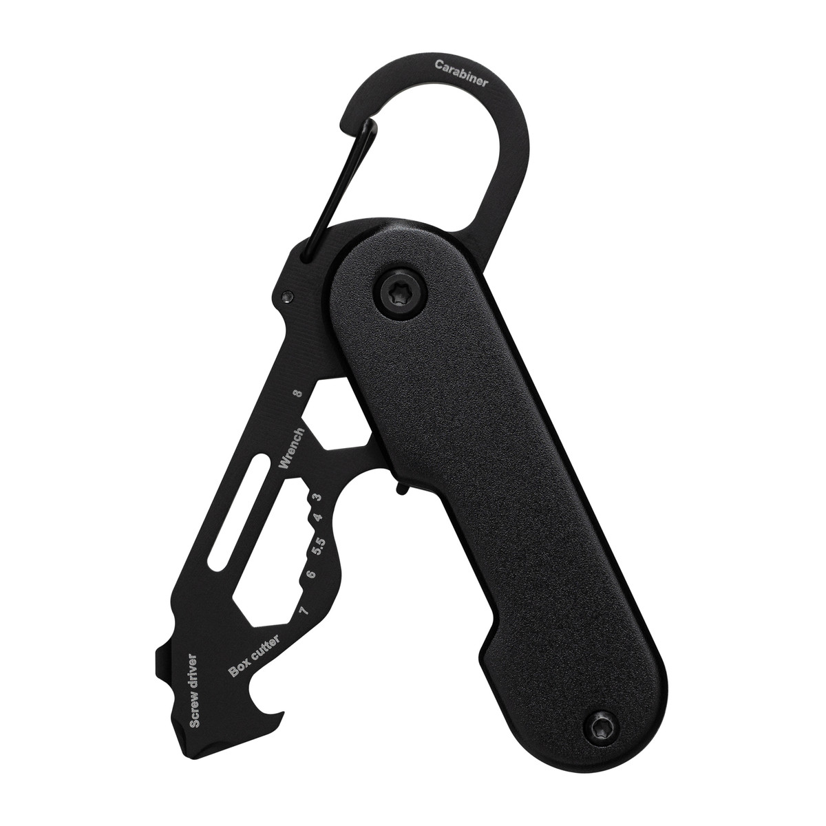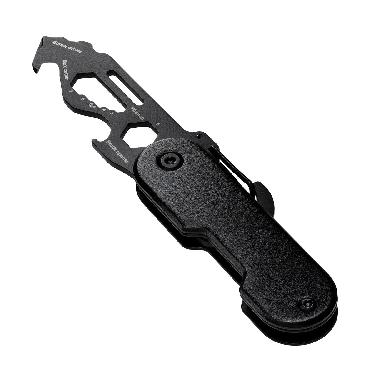 Ob unterwegs oder zu Hause – kleine Reparaturen und Anpassungen lassen sich nicht immer vermeiden. Mit diesem handlichen Multifunktionswerkzeug sind Sie für jede Eventualität bestens gerüstet!Das mattschwarze Werkzeug vereint 6 nützliche Tools in einem Taschenformat: Paketöffner, Sechskantschlüssel, Kreuzschlitz-Schraubendreher, Schlitzschraubendreher, Flügelmutter-Dreher und Flaschenöffner. Die Besonderheit des Paketöffners ist seine rückwärtige Schneide. Diese sorgt dafür, dass die scharfe Klinge nicht mit dem Paketinhalt in Kontakt kommt und der Inhalt vor Beschädigungen geschützt wird.