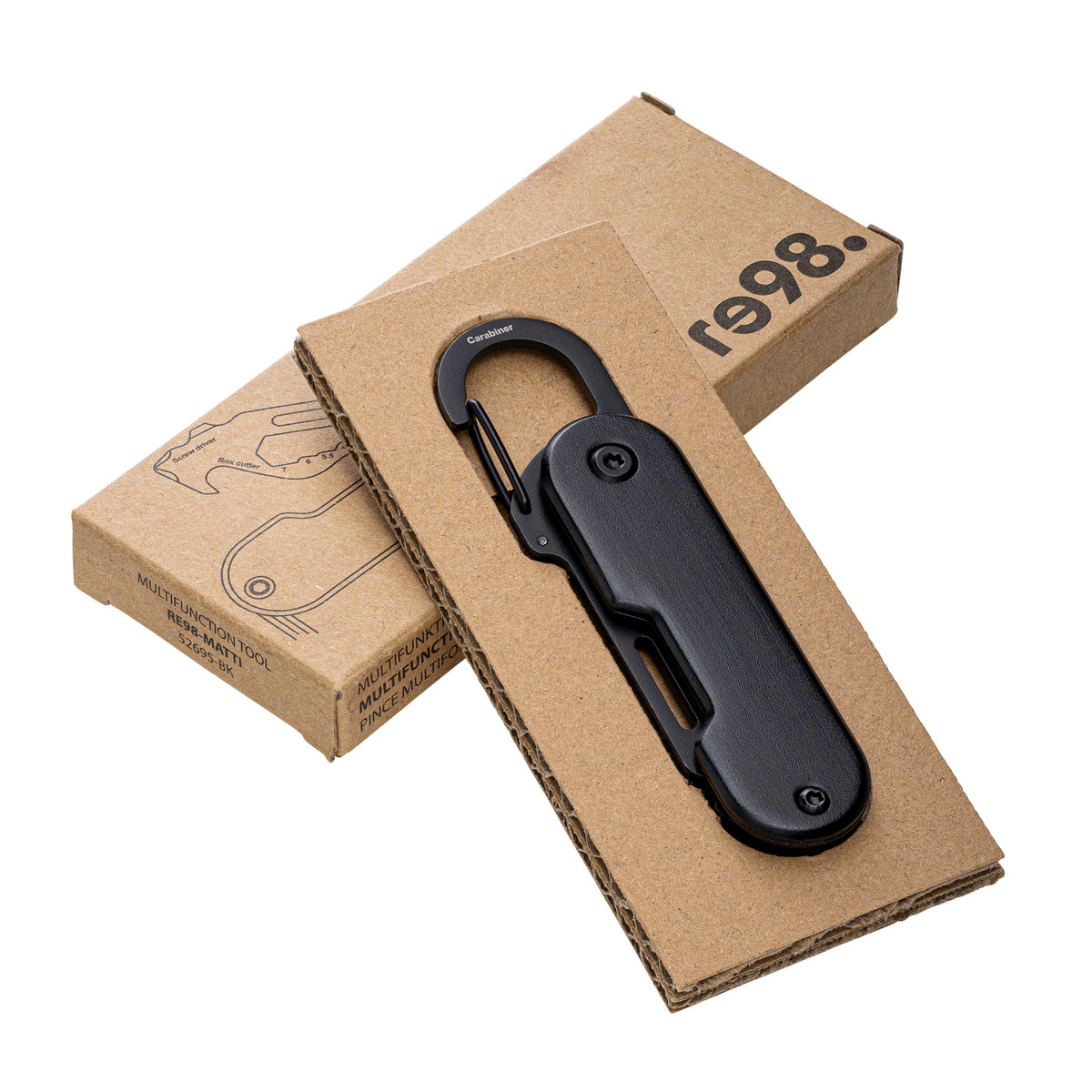 Das Werkzeug aus robustem Edelstahl lässt sich durch Drehen leicht aus- oder einklappen. Dank des praktischen Clip-Karabiners können Sie das Tool an Taschen, Gürtelschlaufen oder dem Schlüsselbund befestigen – immer zur Hand und ideal für unterwegs! Der schwarz eloxierte Werkzeugschutz aus Aluminium bietet eine angenehme Haptik und stellt eine präsente Werbefläche zur Verfügung. Ihre Werbung kann mittels Lasergravur aufgebracht werden. Geliefert wird RE98-Matti in einer braunen 1C-Geschenkverpackung.