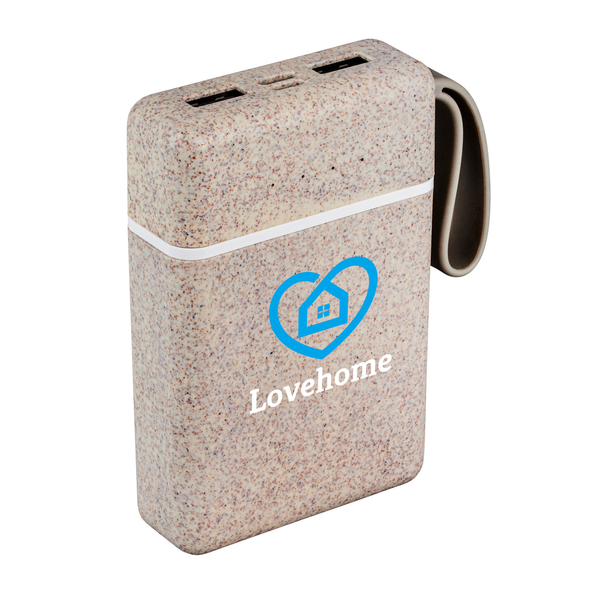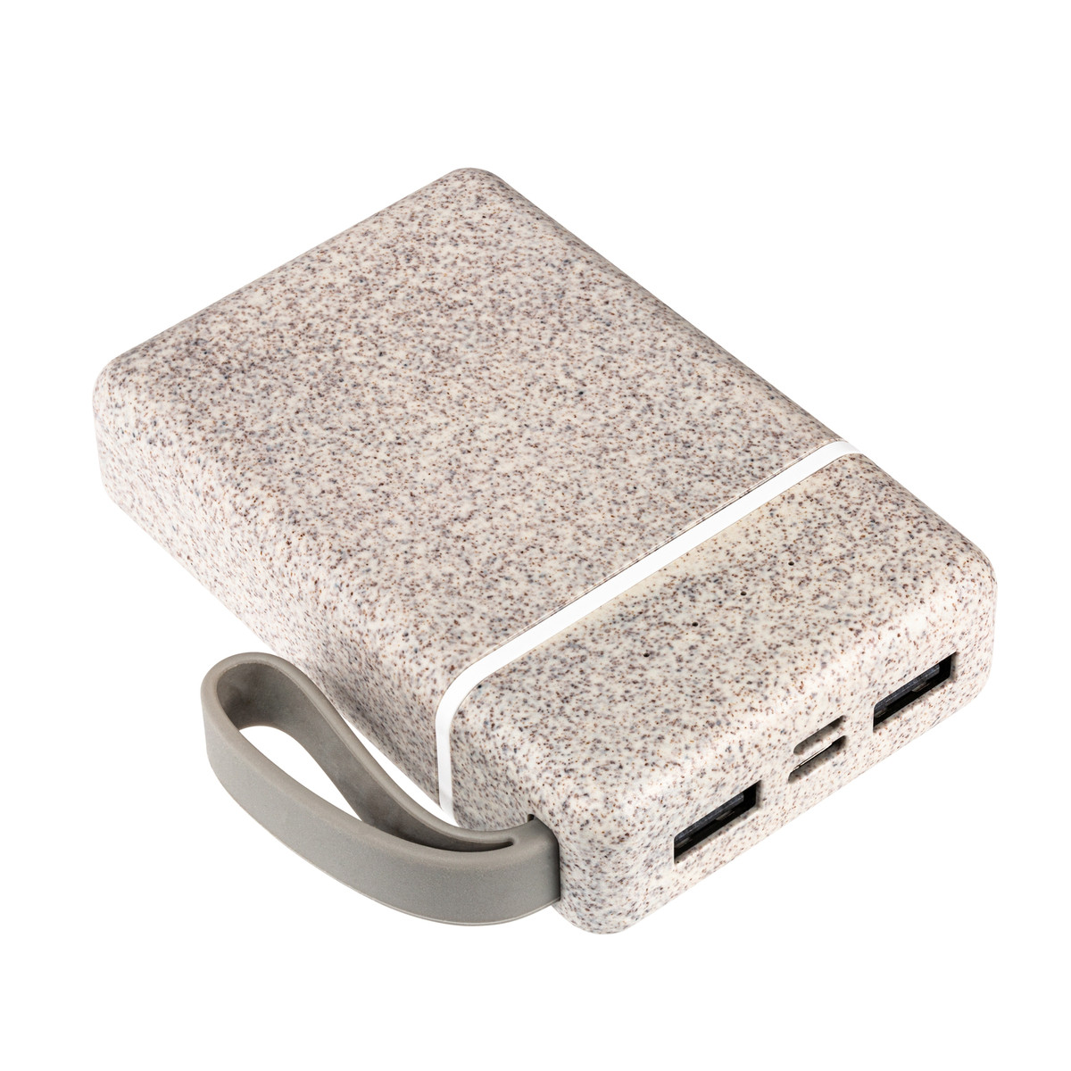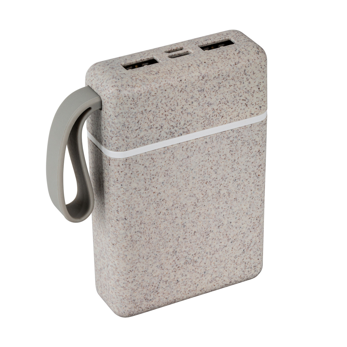 Diese handliche Powerbank gehört zu unserer WHEATSTRAW-Serie aus nachhaltigem Kunststoff. Das Produktcase ist aus einem ressourcenschonenden Kunststoff aus sichtbaren Weizenstroh und ABS hergestellt. Das weiche Silikonband kann als Transport- oder Griffschlaufe benutzt werden. Die Kapazität beträgt 10.000mAh und sorgt für ausreichende Energie um Ihr Smartphone oder andere elektronische Geräte unterwegs zu laden. Ein USB-Ladekabel ist im Lieferumfang enthalten. Das Gerät verfügt über einen Überhitzungs-, Überspannungs-, Tiefenentlade- und Kurzschlussschutz und ist somit bedenkenlos verwendbar.