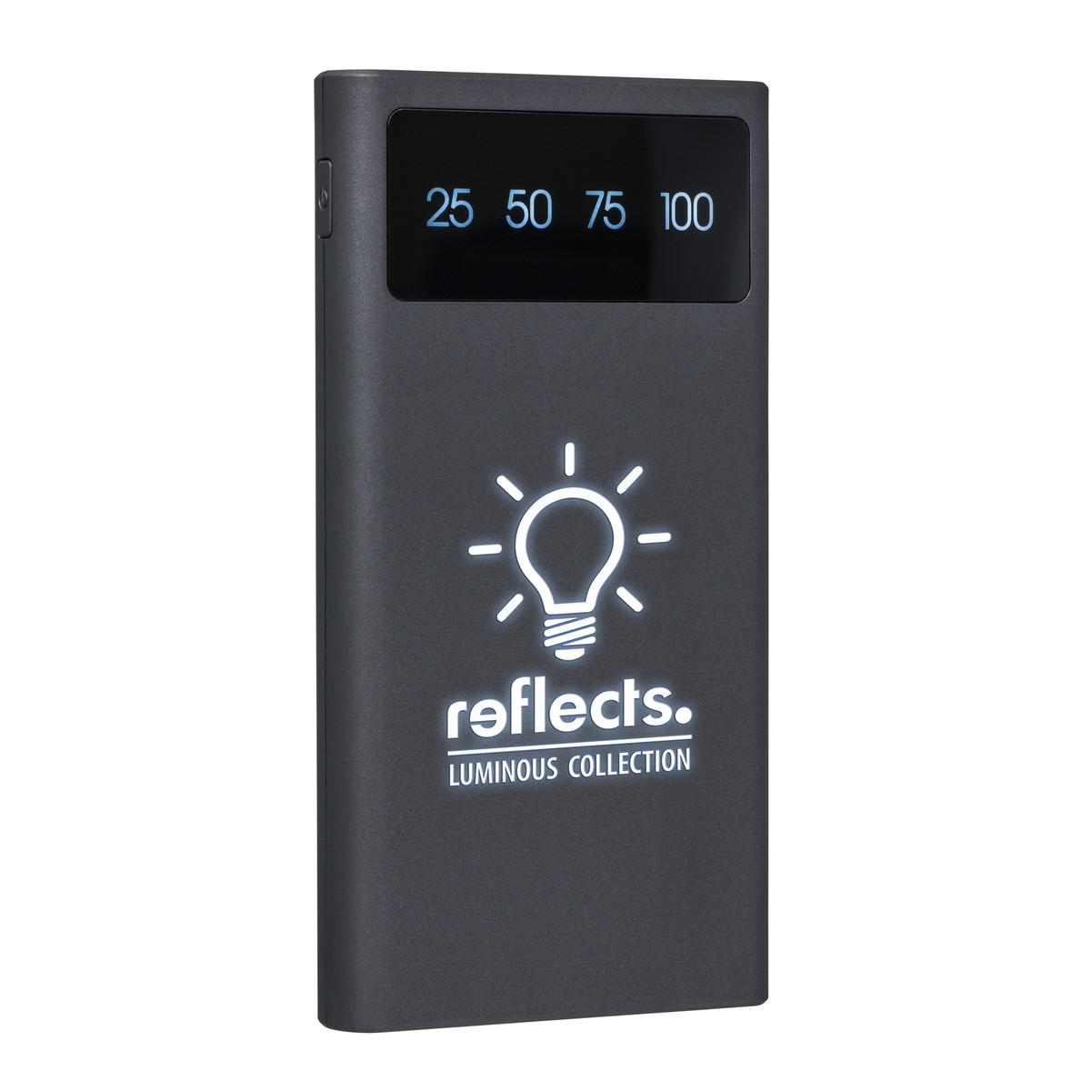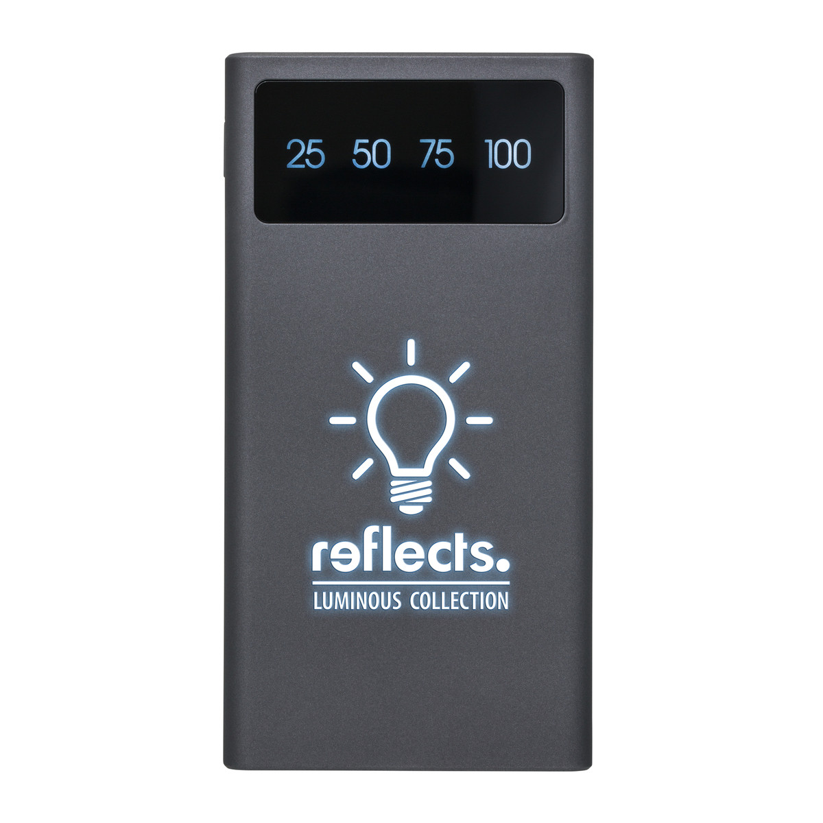 Ausgesprochen leuchtstark erscheint Ihr Logo auf der Werbefläche dieser Powerbank, auf der genau der ausgelaserte Bereich Ihres Motivs bei Knopfdruck für 30 Sekunden oder aber während des Ladeprozesses Licht bekommt. In der Digitalanzeige können Sie ihren Ladestand in vier Stufen (25, 50, 75 oder 100 Prozent) ablesen. Eingebaut ist außerdem eine LED-Taschenlampe. Das Ladegerät hat eine Kapazität von 6000 mA. Eingangsstrom: 5V/2A (max.). Ausgangsstrom: 5V/1A und 5V/2A. Batterietyp Lithium/Polymere. Überlade-, Überhitzungs-, und Überspannungsschutz.