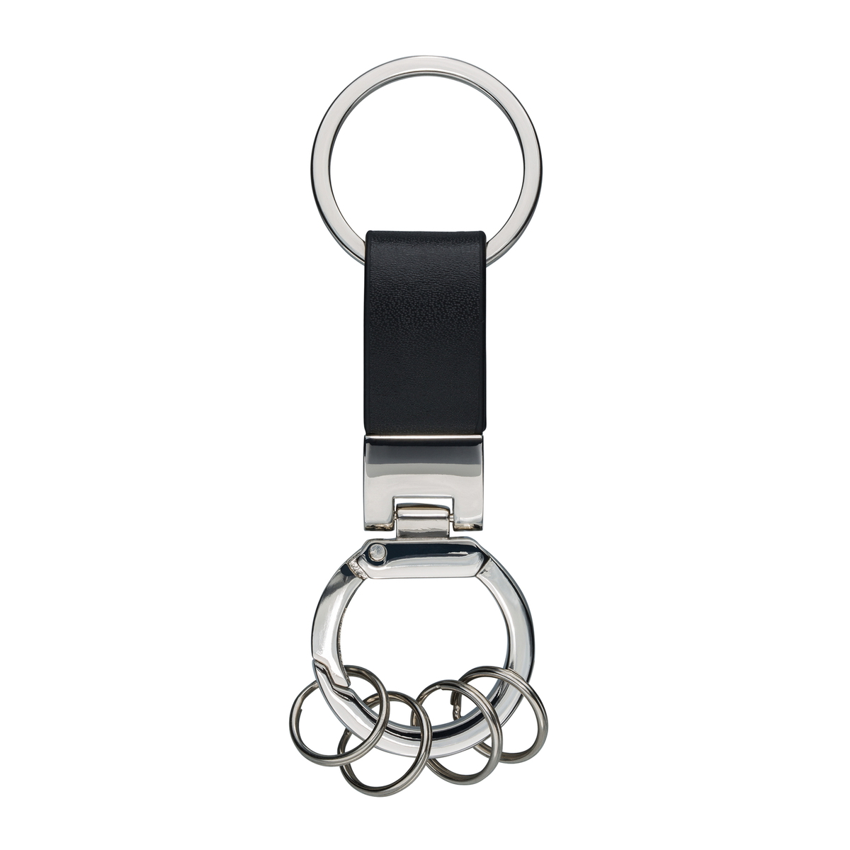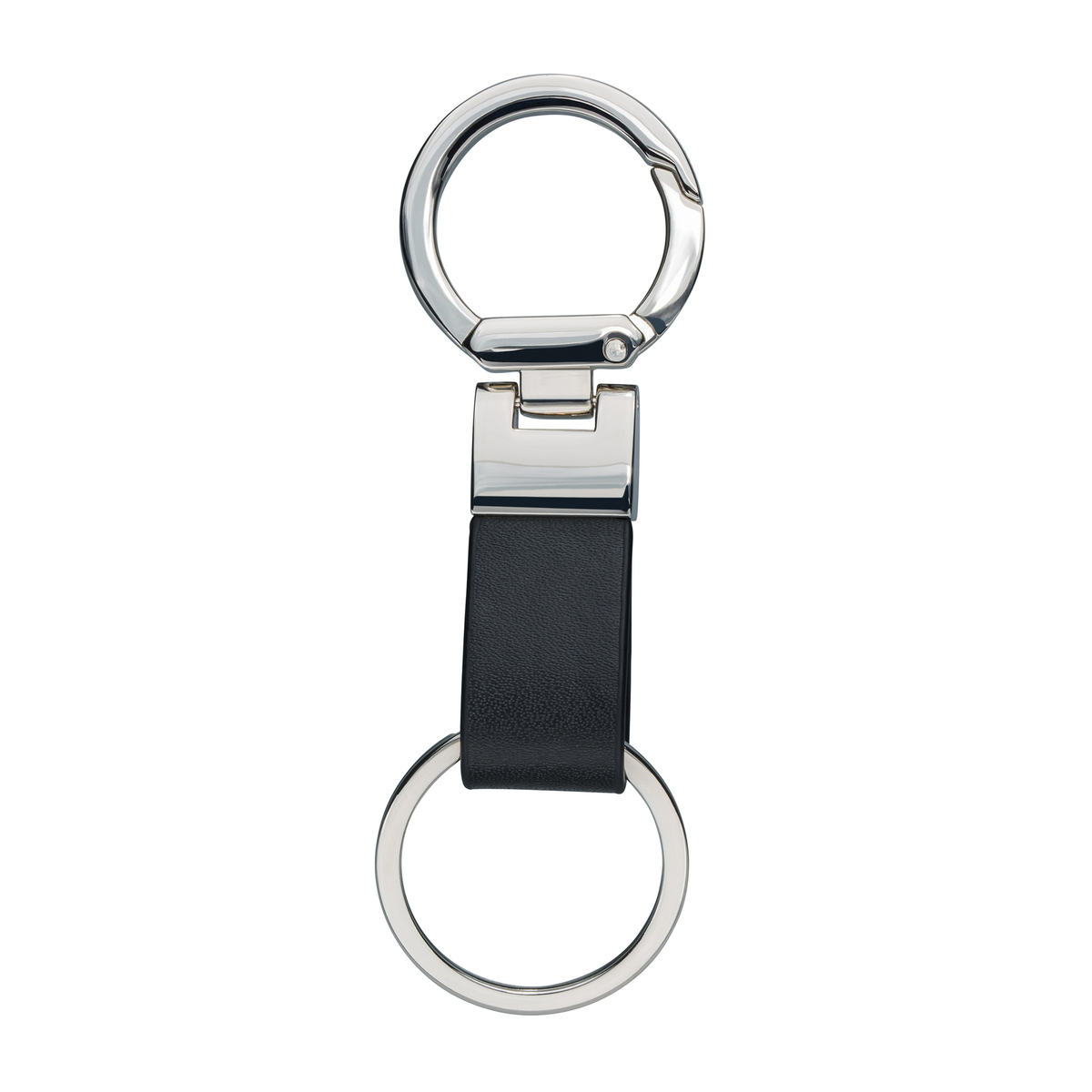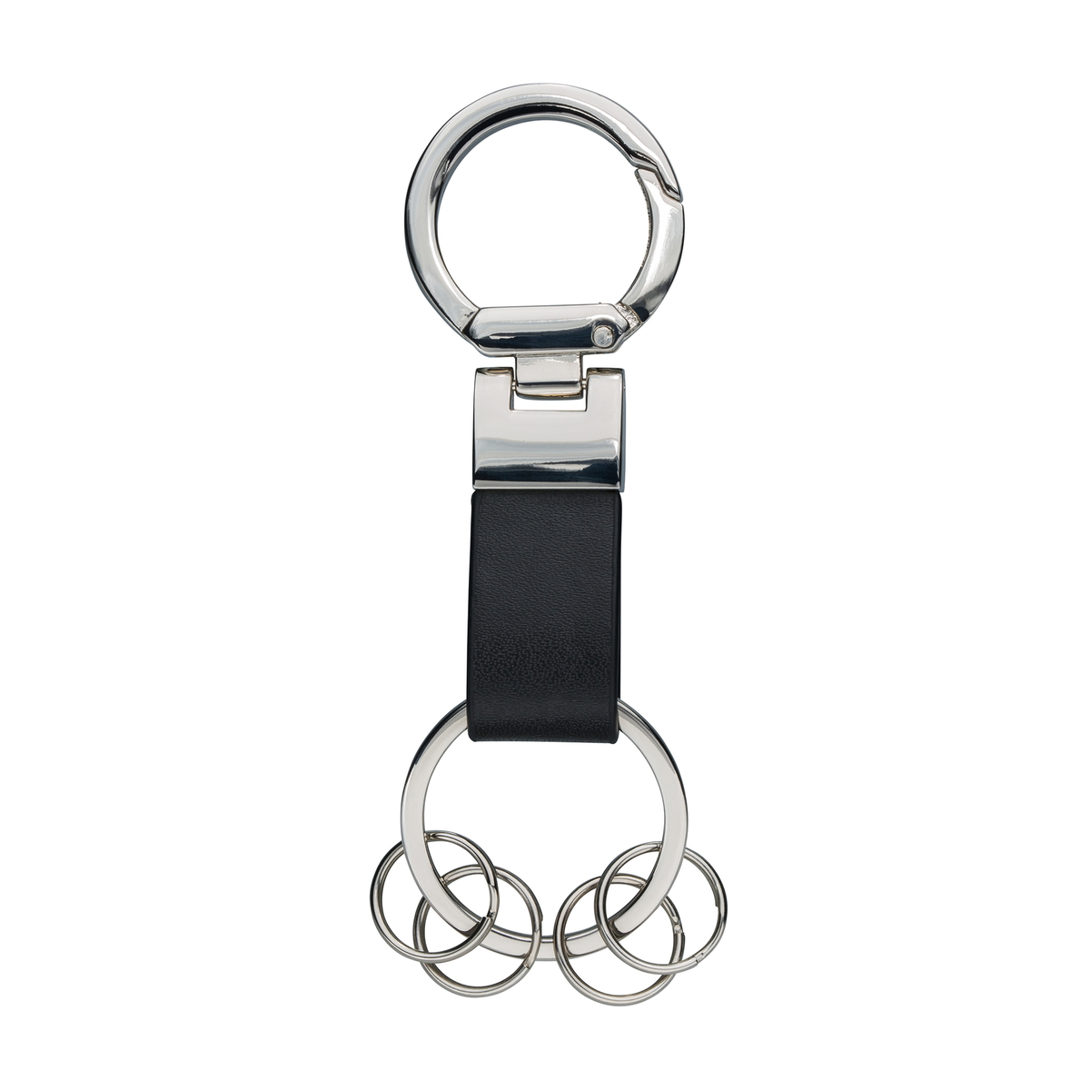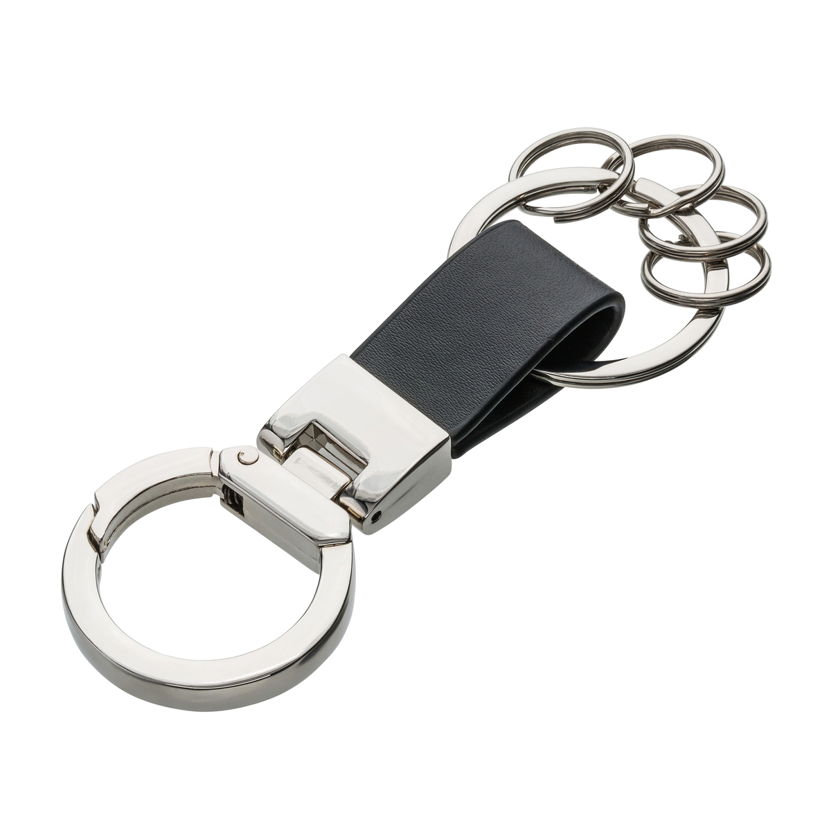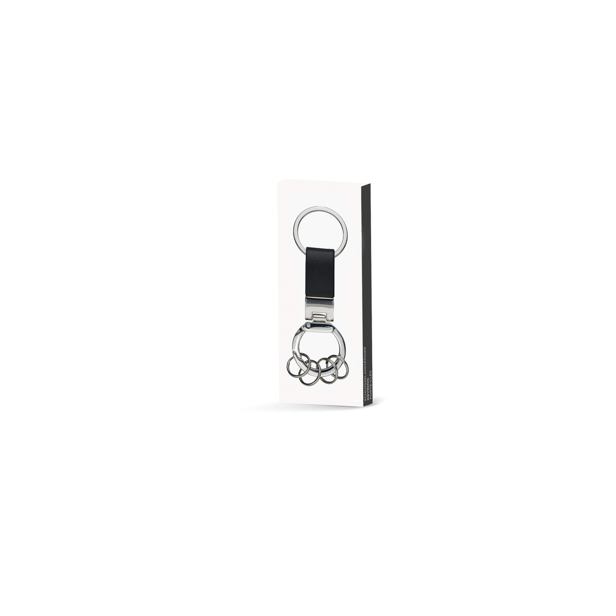 Schlüsselanhänger aus Kunstleder: Edle Anmutung durch ansprechende Kombination der Materialkomponenten und hochwertige Geschenkverpackung, inklusive vier kleiner, am Karabiner befestigter Schlüsselringe.