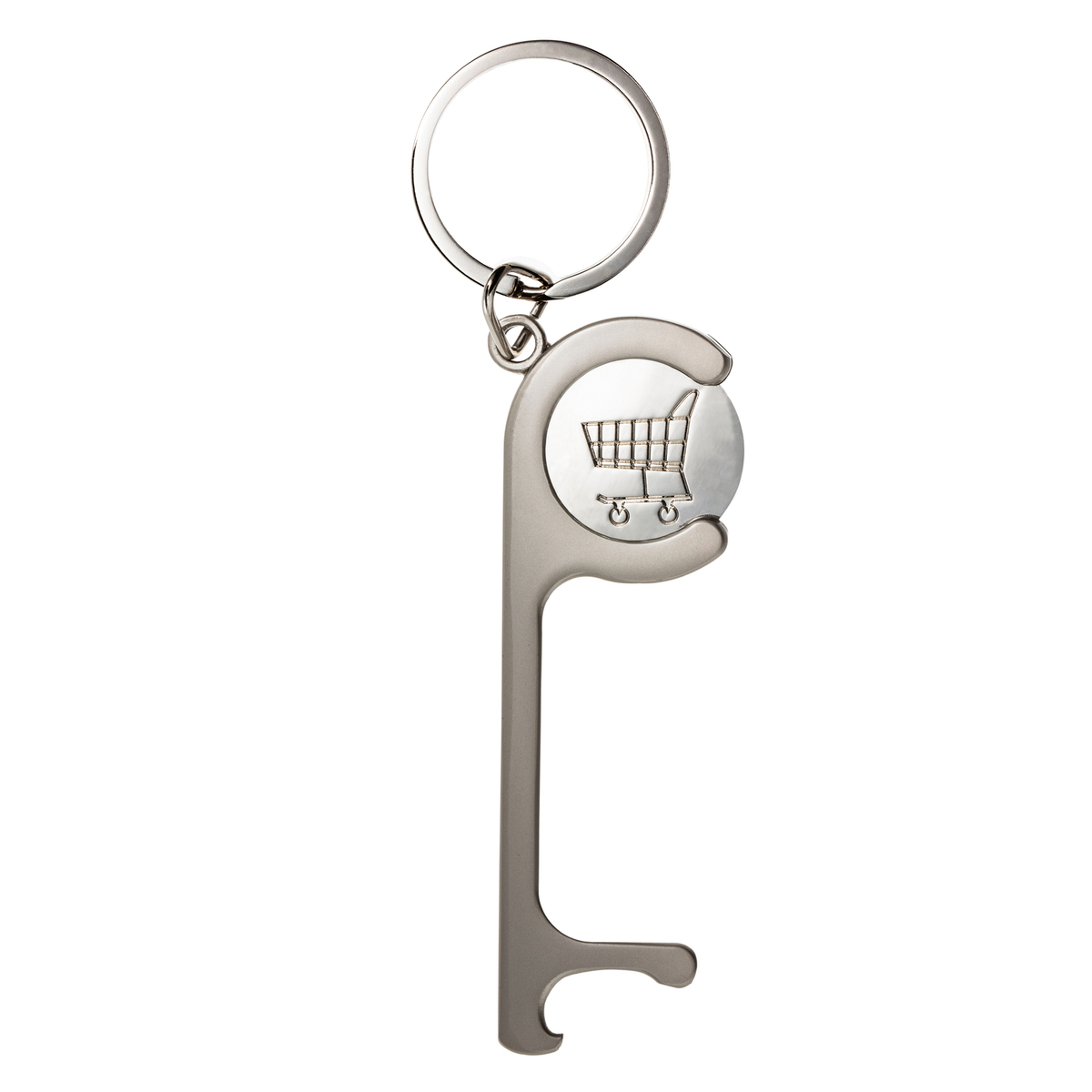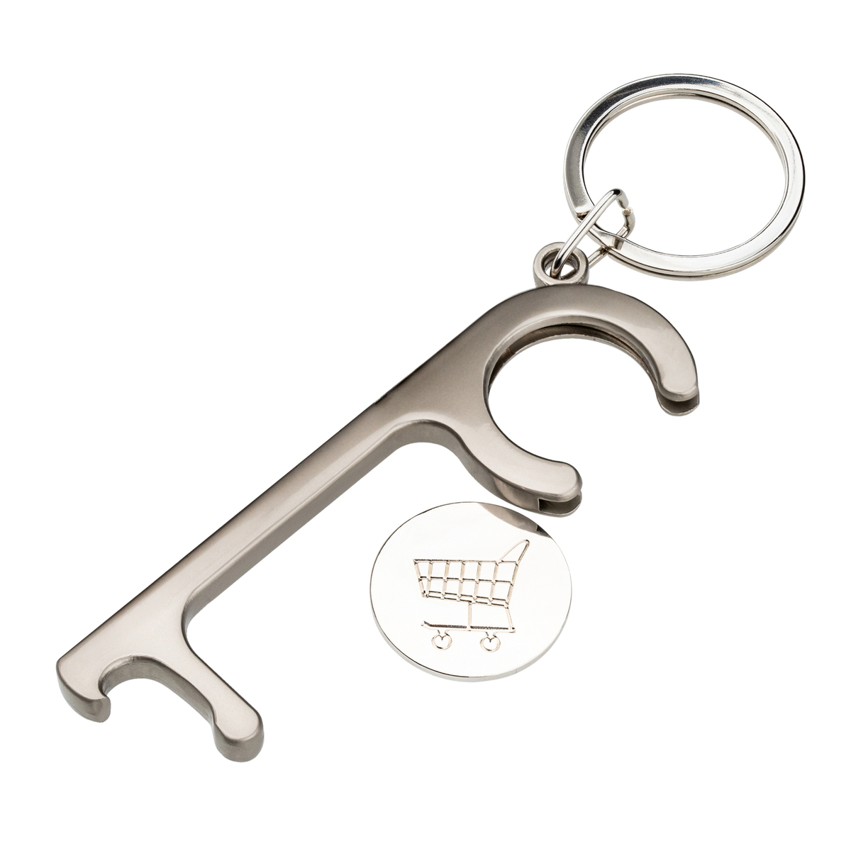 Mit dem Schlüsselanhänger MY-CADDY-DISTANCE ist das Berühren von stark frequentierten Oberflächen vermeidbar. Ob Aufzugstasten, Pin-Eingabetasten oder Türklinken - durch die Nutzung des Hygiene-Schlüsselanhängers müssen keine dieser Oberflächen mit den Händen berührt werden. Ebenso verfügt MY-CADDY-DISTANCE über einen Flaschenöffner und einen Einkaufswagenchip. So sind viele praktische Funktionen an einem Schlüsselanhänger vereint.Als Lagerartikel ist er verfügbar in matt silber mit silberglänzendem Chip aus vernickeltem Eisen. Der 1,5 – 1,6mm starke Chip (nach dt. Münzgesetz) ist einseitig mit einer Prägung veredelt. Für eine Individualisierung des Schlüsselanhängers und besonders des Chips kontaktieren Sie unseren Vertrieb.