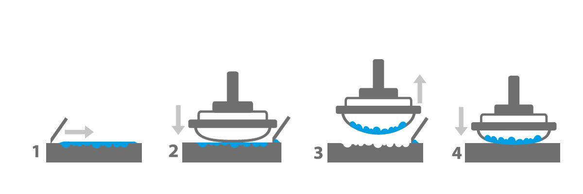 Der Tampondruck ist ein indirektes Druckverfahren. Das bedeutet, dass die Elemente, die später auf dem Werbeartikel abgebildet werden sollen, in der Druckform als Vertiefung sichtbar sind. Das Prinzip: Das Logo, der Slogan oder die Grafik werden auf einen Positivfilm übertragen und auf ein Klischee (plus Druckplatte) belichtet. Nach dem Auswaschen bleibt auf dem Klischee eine Vertiefung zurück. Mit einer Rakel wird die Farbe über das Klischee gebracht und wieder abgezogen, sodass die Farbe in der Vertiefung zurückbleibt. Anschließend setzt der Tampon auf. Er nimmt den Aufdruck mit Farbe auf und druckt ihn auf das Produkt. Der flexible Silikontampon passt sich auch komplexen Formen an. So wird das Motiv optimal übertragen.
