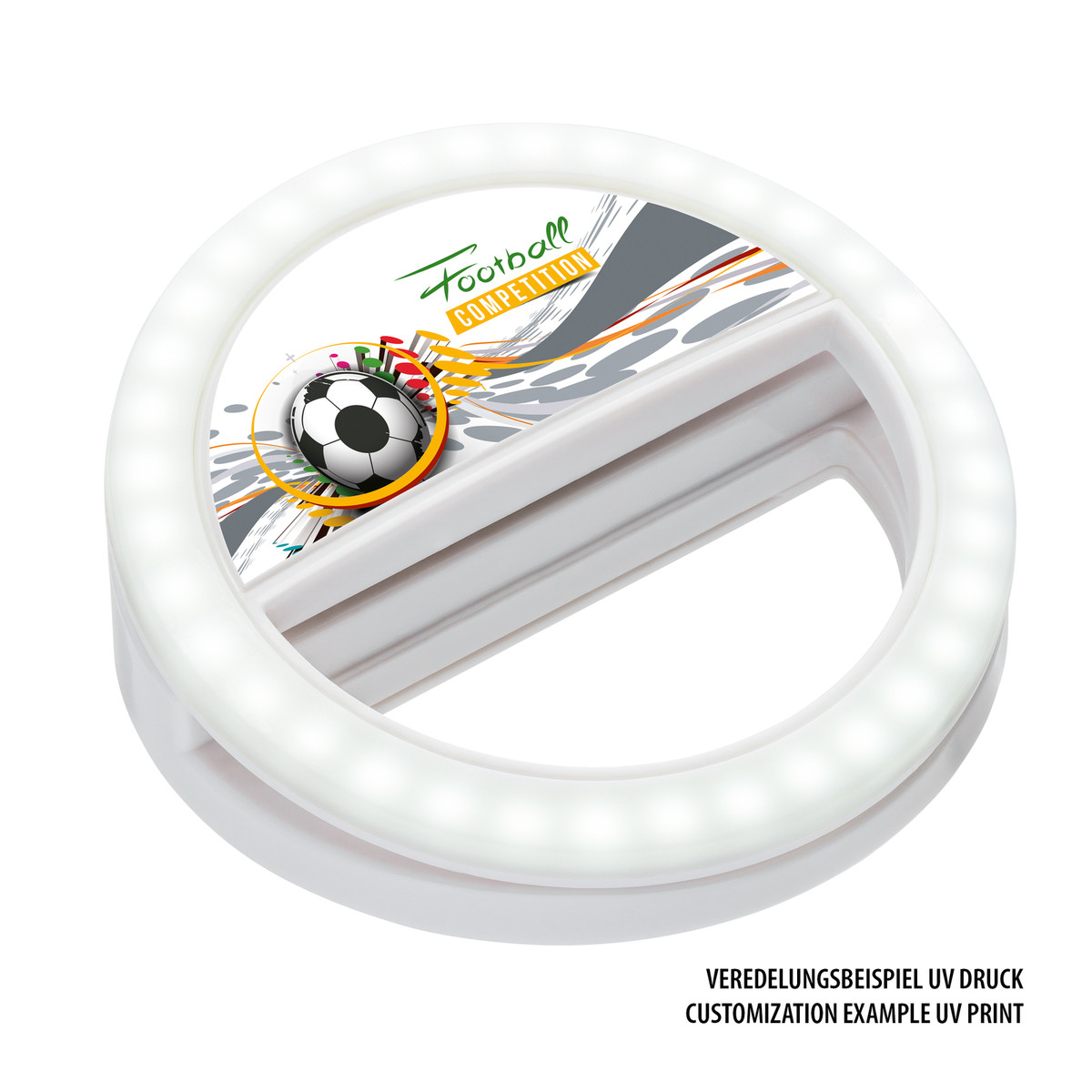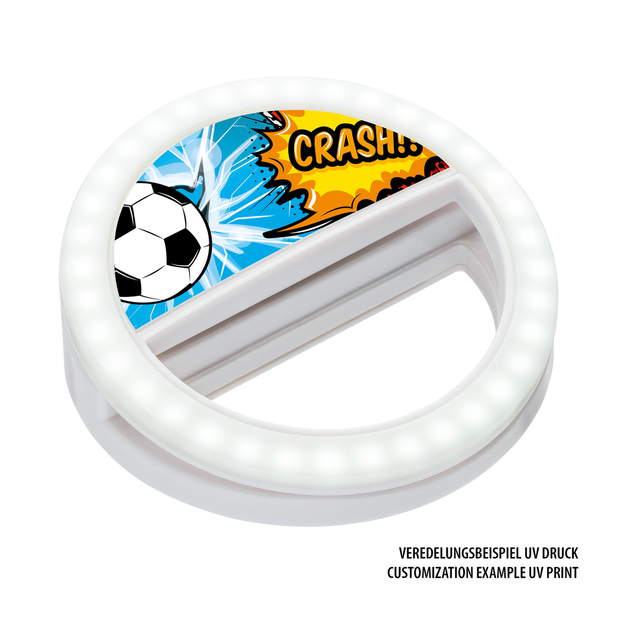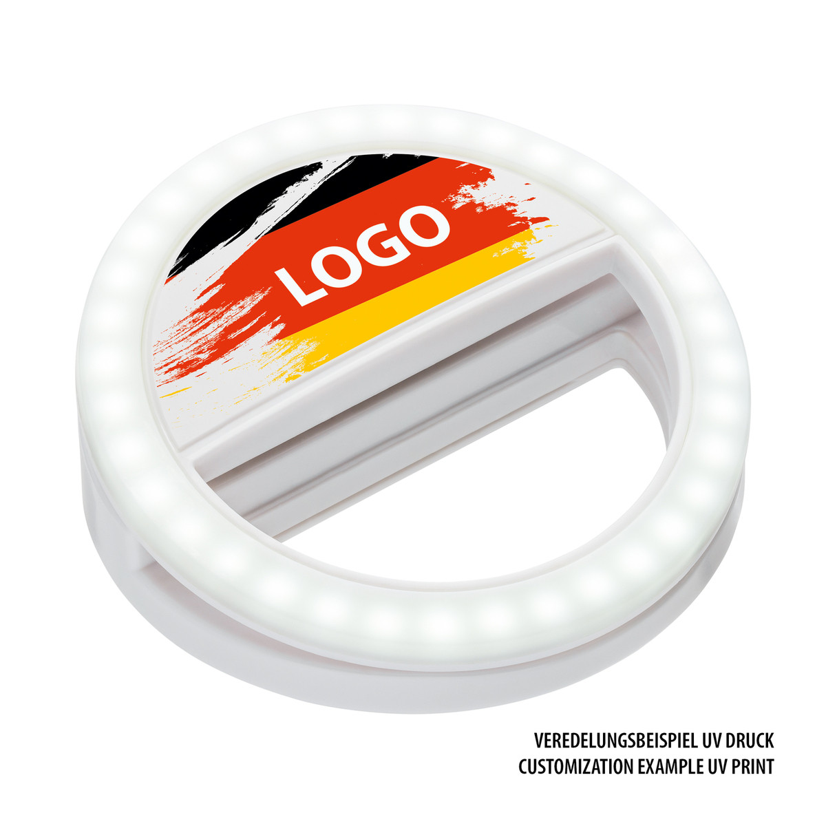 Das Smartphone Ringlicht besteht aus Kunststoff. Ohne Verpackung liegt das Artikelmaß bei 85 x 85 x 30 mm. Die maximale Werbefläche beträgt 40 x 20 mm. Das Logo findet auf einer sehr prominenten Werbefläche seinen unübersehbaren Platz. Für die Veredelung werden der Tampondruck und der UV Druck angeboten.