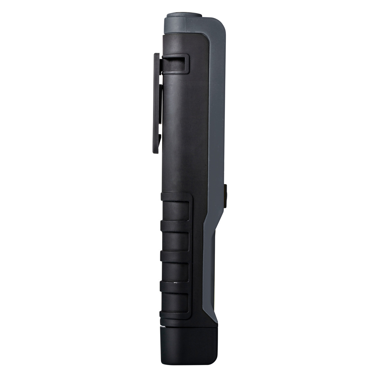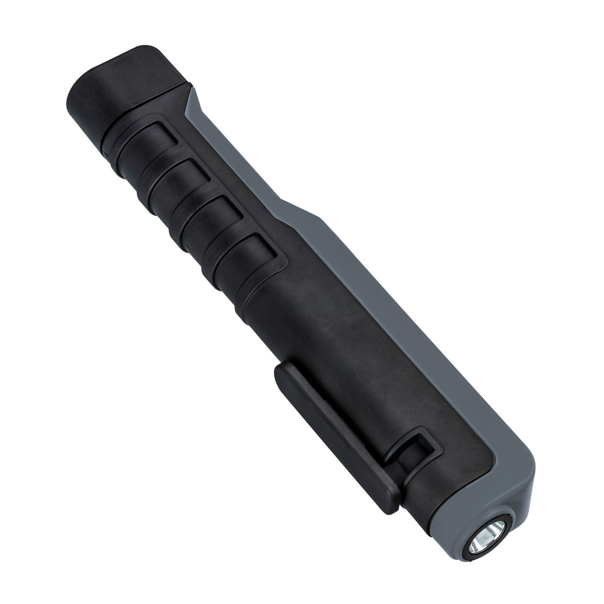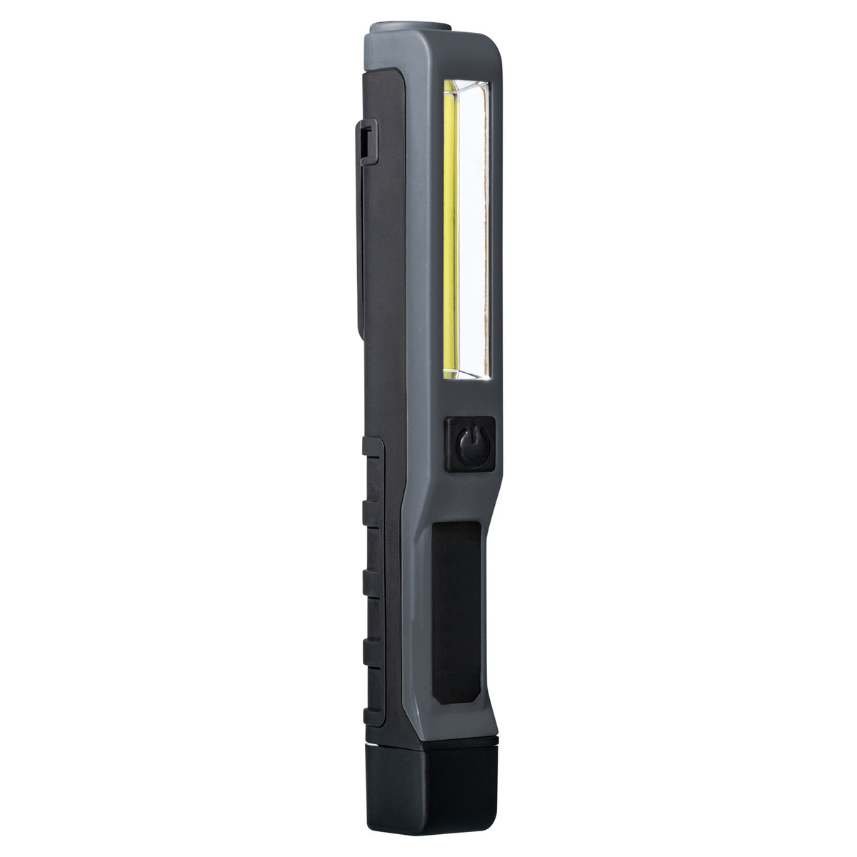 Die Taschenlampe mit LED- und COB-Technologie leuchtet seitlich in zwei einstellbaren Lichtstärken. (max. 150 Lumen, 3 Watt). Der Clip lässt sich verschieben und ist magnetisch.