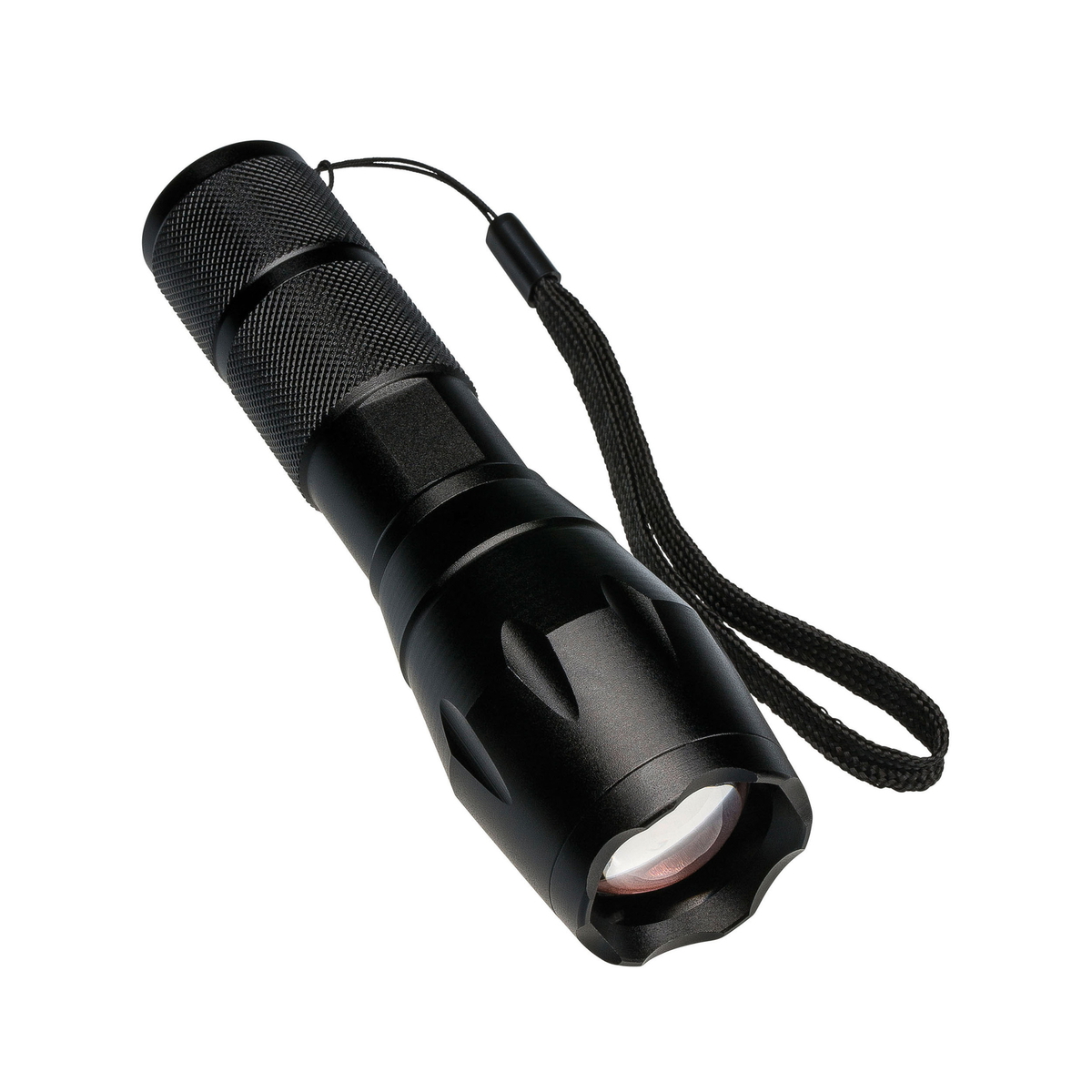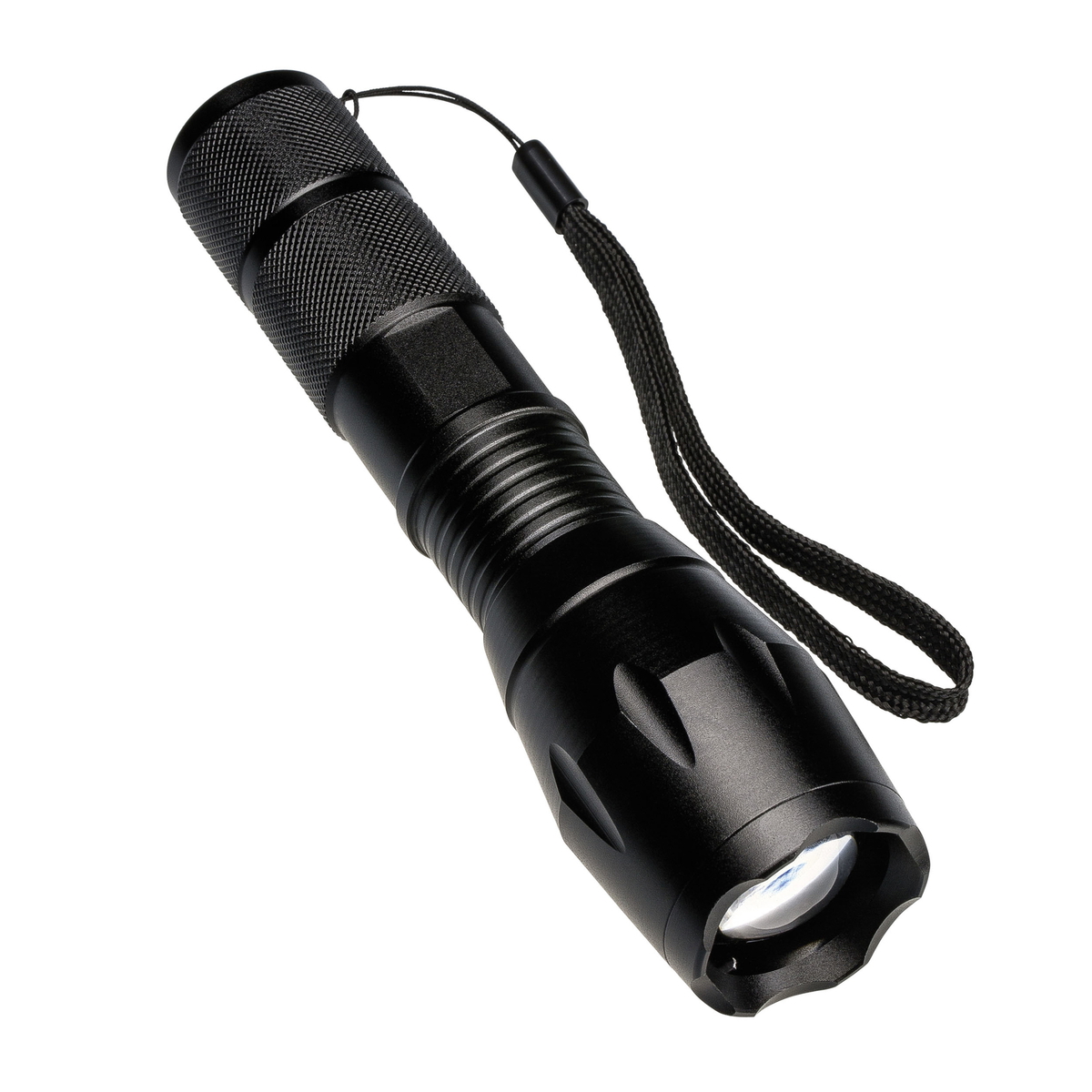 Die schlichte LED-Taschenlampe mit COB-Technologie (max. 200 Lumen, 5 Watt) verfügt über drei verschiedene Lichtstärken, hat eine Stroboskopfunktion und ein SOS-Blinklicht.
