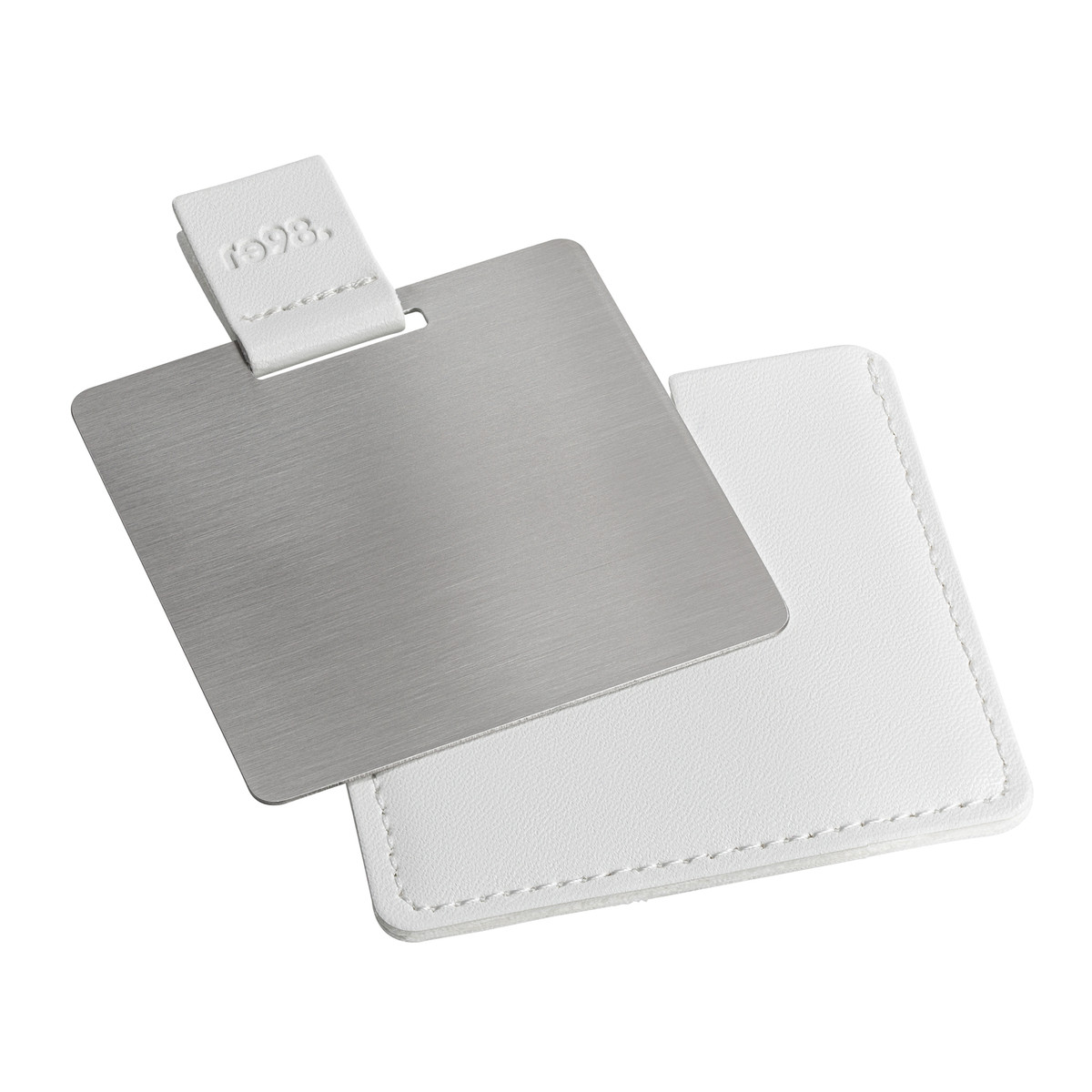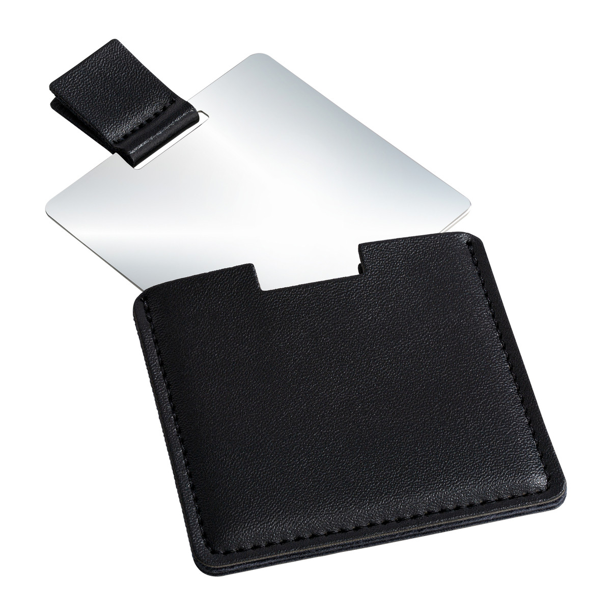 Ein Must-Have für alle, die Wert auf ein gepflegtes Äußeres legen. Mit dem handlich leichten Taschenspiegel können Sie unterwegs jederzeit Ihre Frisur überprüfen, Make-Up kontrollieren oder Lippenstift schnell auffrischen. Der bruchsichere Edelstahl-Spiegel bietet auf der einen Seite eine hochglanzpolierte, auf der anderen eine gebürstete Oberfläche. In einer Kunstleder-Hülle ist der Spiegel sicher aufbewahrt und lässt sich dank der Grifflasche mühelos herausziehen. Die Hülle mit Ziernaht ist in edlem Schwarz oder Weiß erhältlich und überzeugt durch ihre angenehme Haptik.Die Veredelung kann entweder durch Tampondruck oder Lasergravur auf der gebürsteten Werbefläche, oder per Tampon- oder UV-Druck auf dem Etui erfolgen. Geliefert wird der Artikel in einem hochwertigen Design-Etui.
