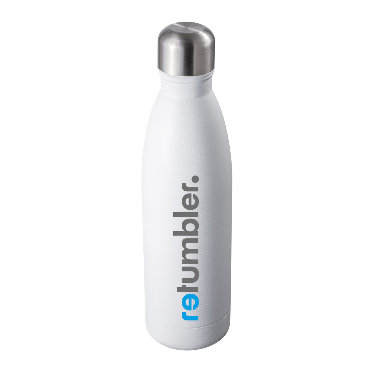 Für Heiß- oder Kaltgetränke, unsere doppelwandige Edelstahlflasche überzeugt durch trendiges und funktionales Design. Durch die Doppelwandigkeit bleiben ihre Getränke lange kalt bzw. heiß. Die Trinkflasche kann mit edler mattschwarzer, weißer Pulverbeschichtung oder natürlich silberglänzend bestellt werden. 500 ml Fassungsvermögen stehen zur Verfügung. Setzen Sie ihr Logo stilvoll in Szene auf der Trend Trinkflasche schlechthin.