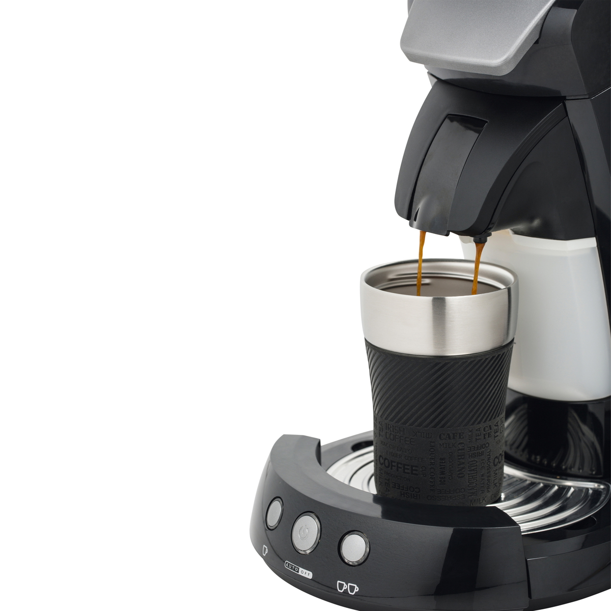 Dank geringer Höhe passt der doppelwandige Becher mit Silikonmanschette unter den Auslass vieler gängiger Kaffeepad- und Kapselmaschinen. Fassungsvermögen 230 ml.