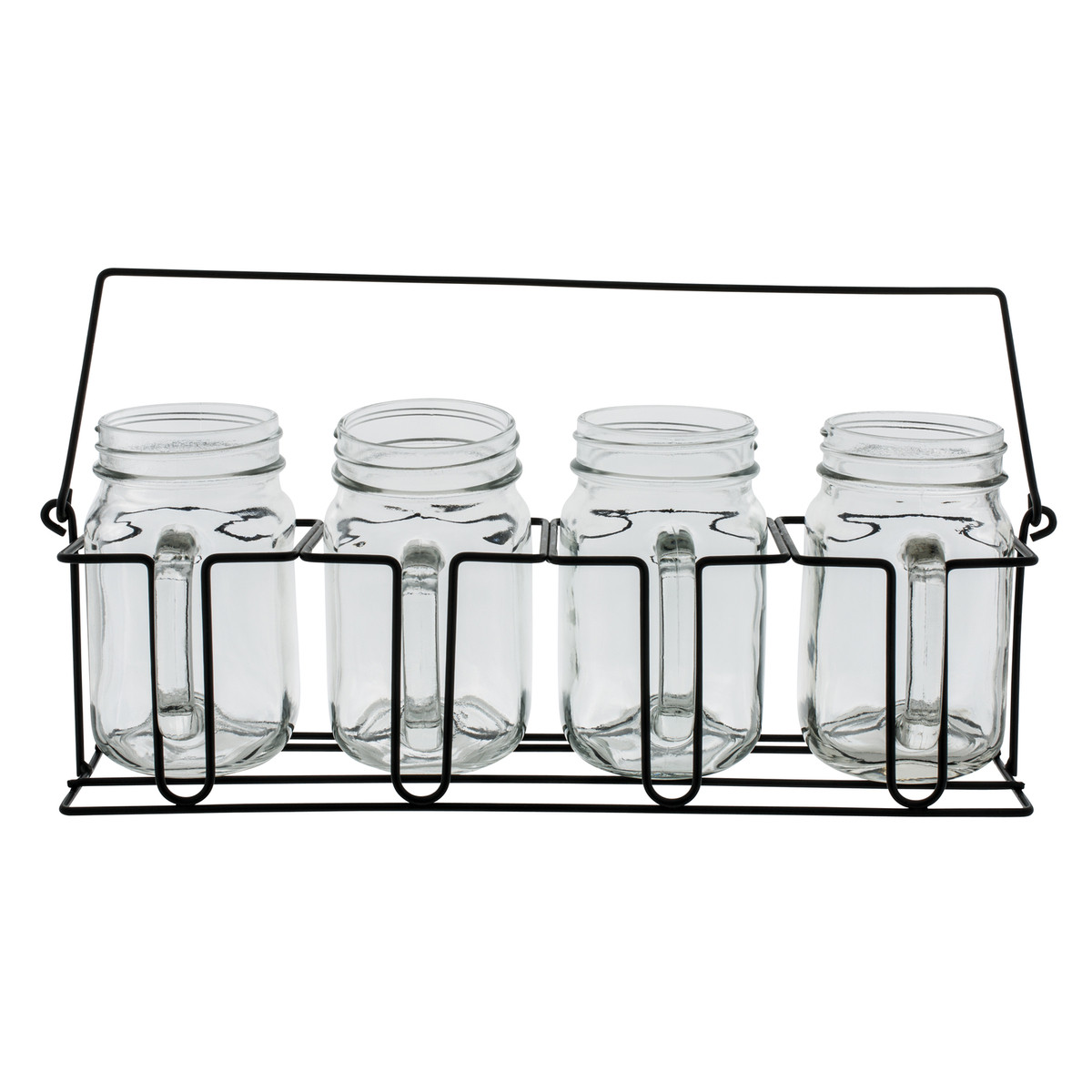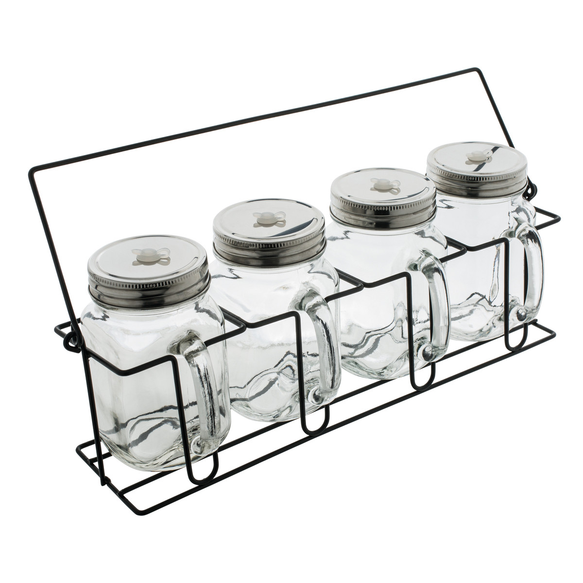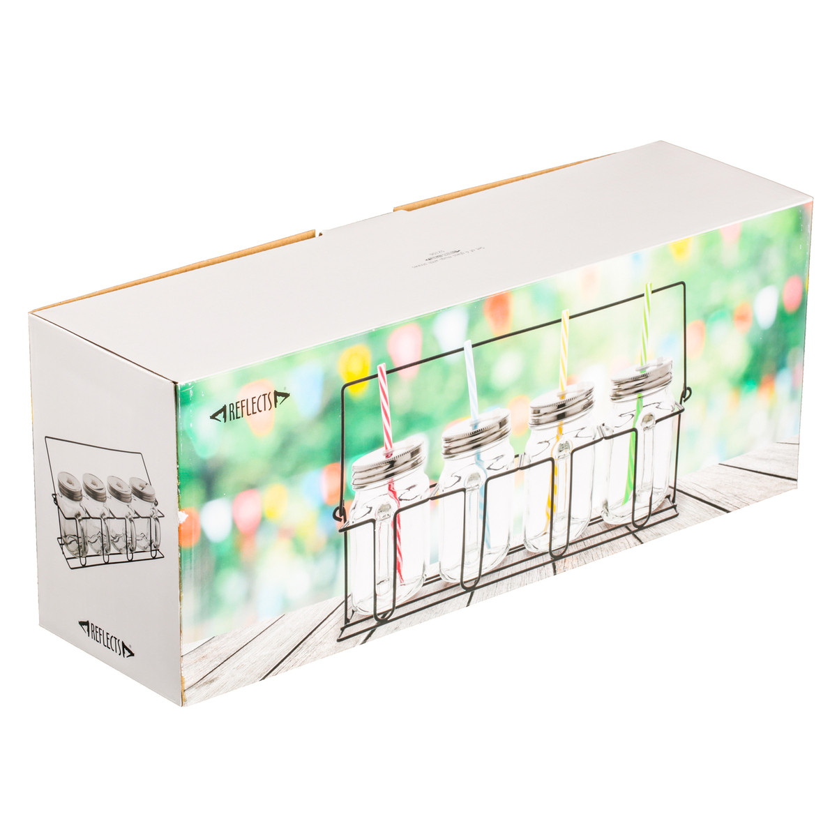 Sommerzeit ist Picknickzeit. Hier gibt es die Limonade oder den Cocktail für heiße Tage gleich im Viererpack: Der Ständer fasst vier Gläser mit Edelstahldeckel. Vier bunte, wieder verwendbare Strohhalme sind inklusive. In die Silikonöffnung passt handelsüblicher Nachschub. Die Öffnung kann verschlossen werden und verhindert das Eindringen unliebsamer Insekten. 450 ml.