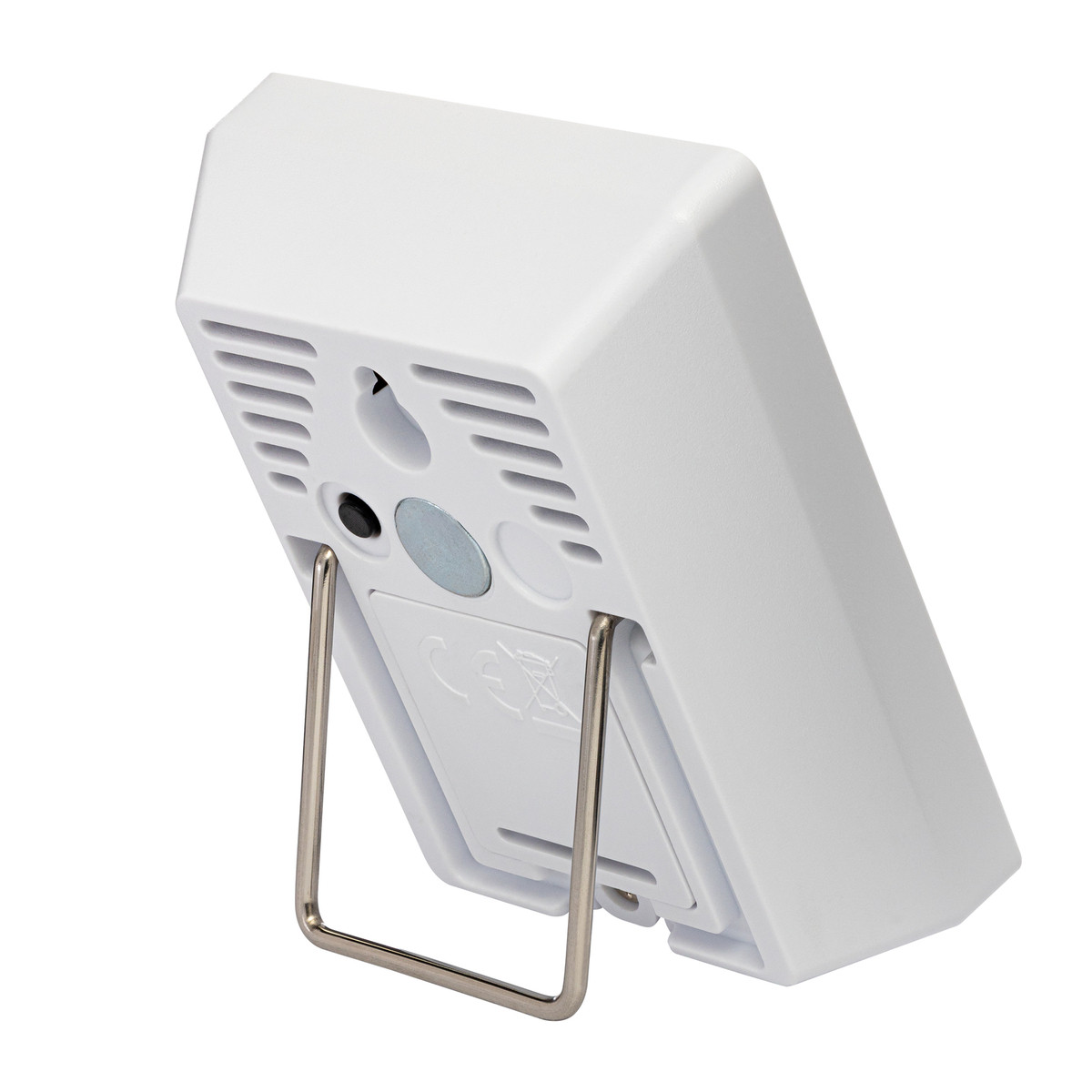 Die batterie-betriebene Wetterstation dient gleichzeitig als Thermometer und Hygrometer für Innenräume. Das Thermometer bietet einen Messbereich zwischen 0 °C und 50 °C, während das Hygrometer die Luftfeuchtigkeit zwischen 20%-95% RH misst (RH: relative Luftfeuchte, eng. „relative humidity“).Auf dem leicht ablesbaren Bildschirm werden die gemessene Temperatur und Luftfeuchte mit einem Smiley-Symbol bewertet. Wenn die Luftfeuchtigkeit unter 40% (zu trocken) oder über 70% (zu feucht) liegt, wird der Smiley unzufrieden angezeigt. Ansonsten erscheint ein lächelndes Gesicht. Die Temperaturanzeige kann zwischen Fahrenheit und Celsius umgeschaltet werden, indem man den schwarzen Knopf auf der Rückseite drückt.