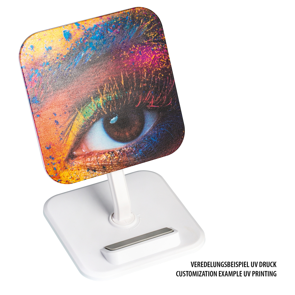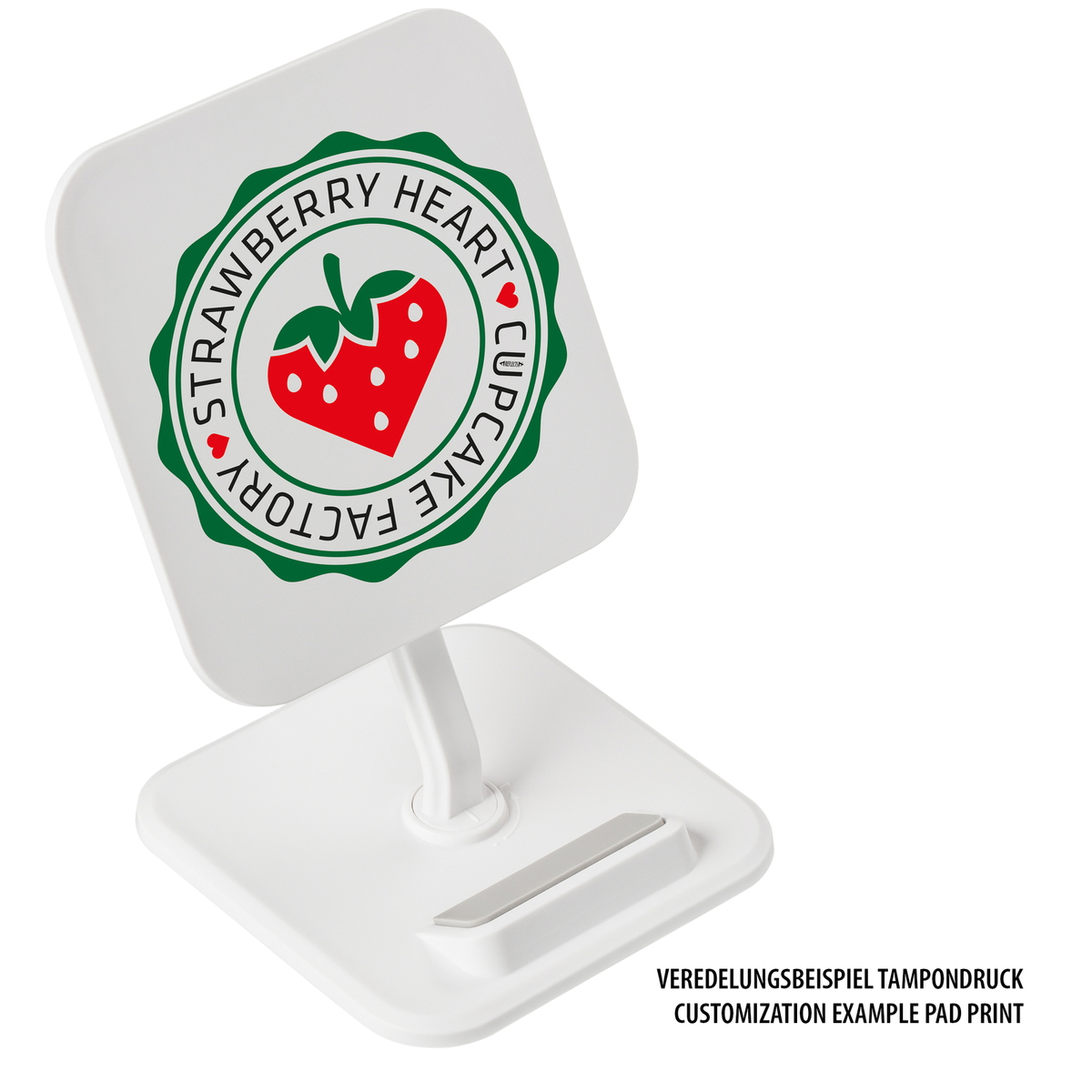 Die formschöne Ladestation für den Schreibtisch lässt sich per Klickmechanismus ganz leicht auseinandernehmen und verstauen. Sie ist höhenverstellbar und kann ihr Gerät im Hoch- oder Querformat mit neuem Strom versorgen. Ein 1,00 m langes Mini-USB/USB-Kabel versorgt die Ladestation mit Energie und ist im Lieferumfang enthalten. Die großzügige Werbefläche kann per REFLECTS-UV-Print flächendeckend veredelt werden. Überhitzungs- Kurzschluss- und Überspannungsschutz.