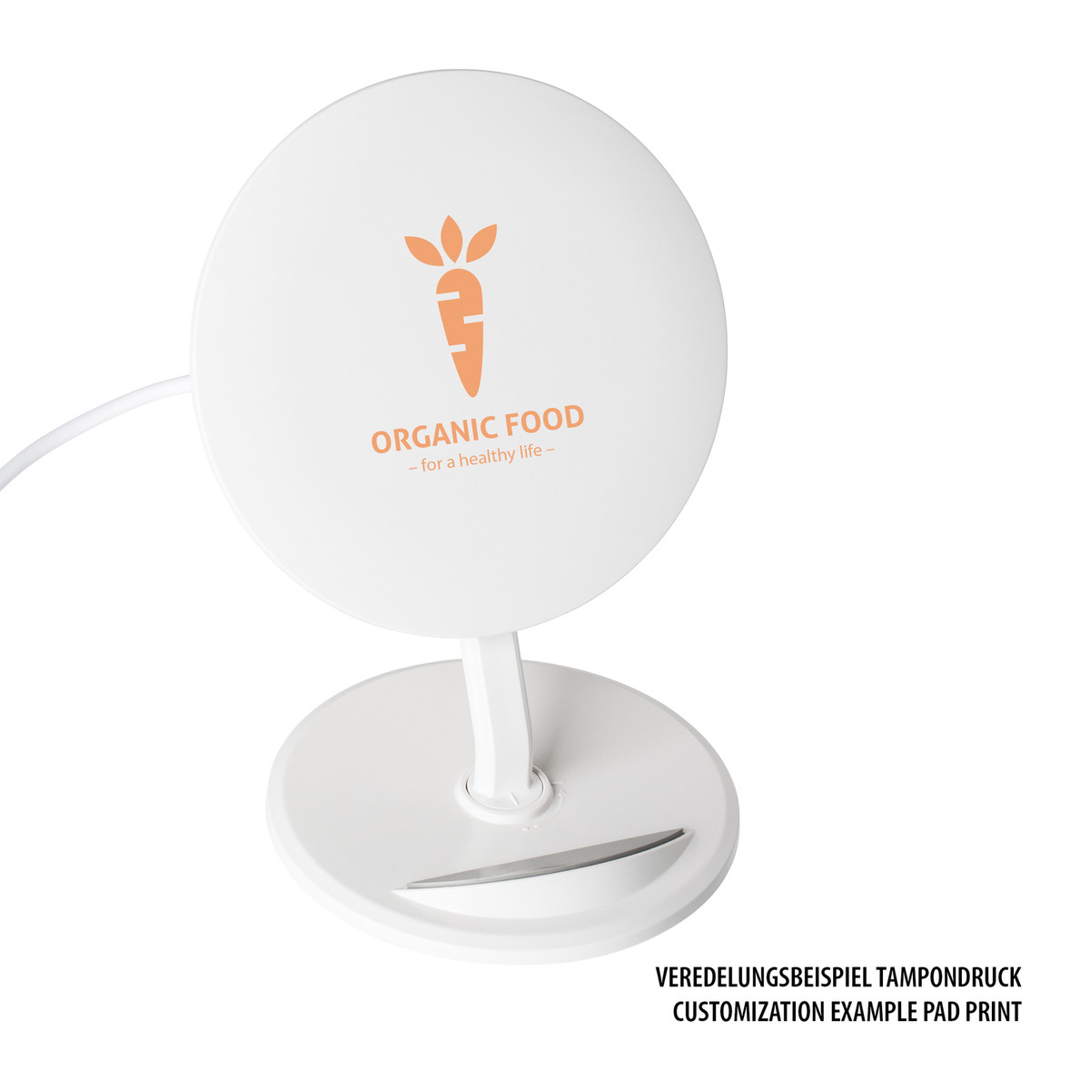 Das Wireless Handy Ladegerät REEVES-VENICE ermöglicht im Alltag ein unkompliziertes und kabelloses Aufladen des Handyakkus und ist zudem ein moderner CI-Träger. Die passende Technologie ist in der Regel in Mobiltelefonen der neueren Generation bereits verbaut. Per Klickmechanismus lässt sich das Handy Ladegerät für den Schreibtisch auseinandernehmen und platzsparend verstauen. Stecken Sie Fuß und Sender ineinander. Drehen Sie den Sender um 90 Grad im Uhrzeigersinn, bis er einrastet. Betätigen Sie den Justierknopf, um eine Höhenverstellung des Senders vorzunehmen.