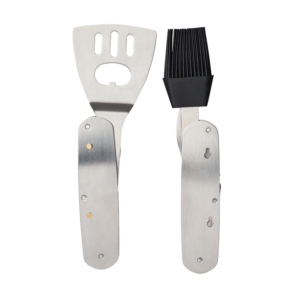 Who likes to carry their whole household in their backpack? Without big efforts, our BBQ talent saves your dinner during a barbecue in the public garden, when you are camping or taking a long journey. Hidden inside, you will find a corkscrew, a barbecue turner, a pickling brush, a bottle opener, a can opener, a knife and a fork. The brush and the turner or the knife and the fork can also be removed and be used separately. If the grill is not yet assembled, the integrated cross-headed screwdriver will be a great help to you.