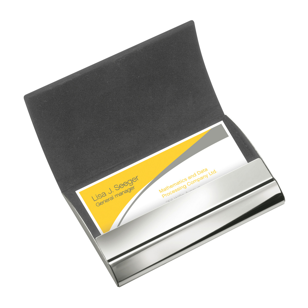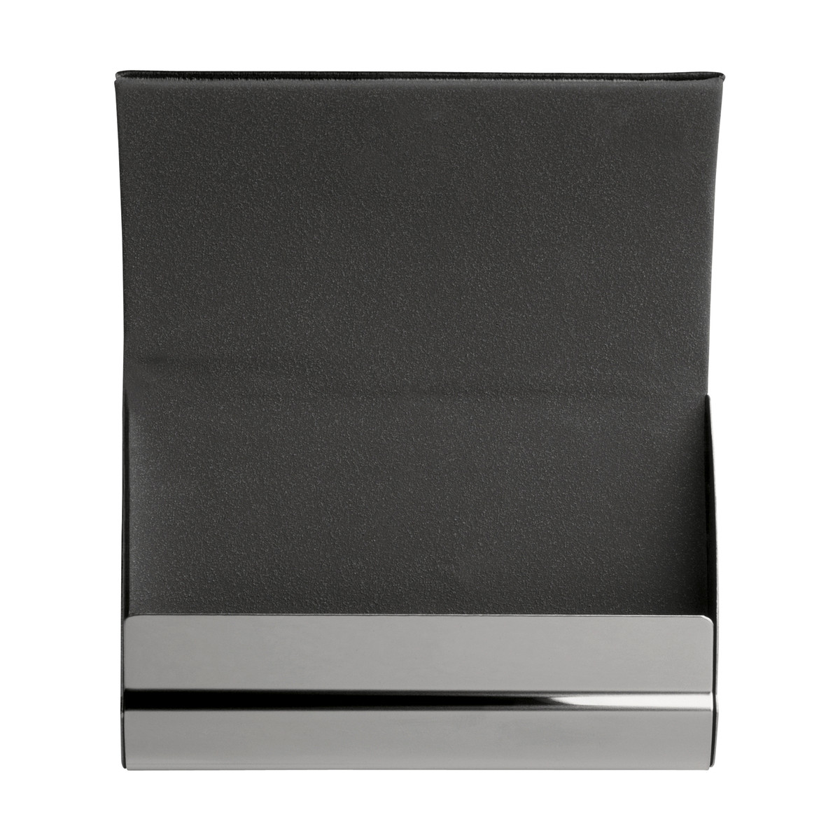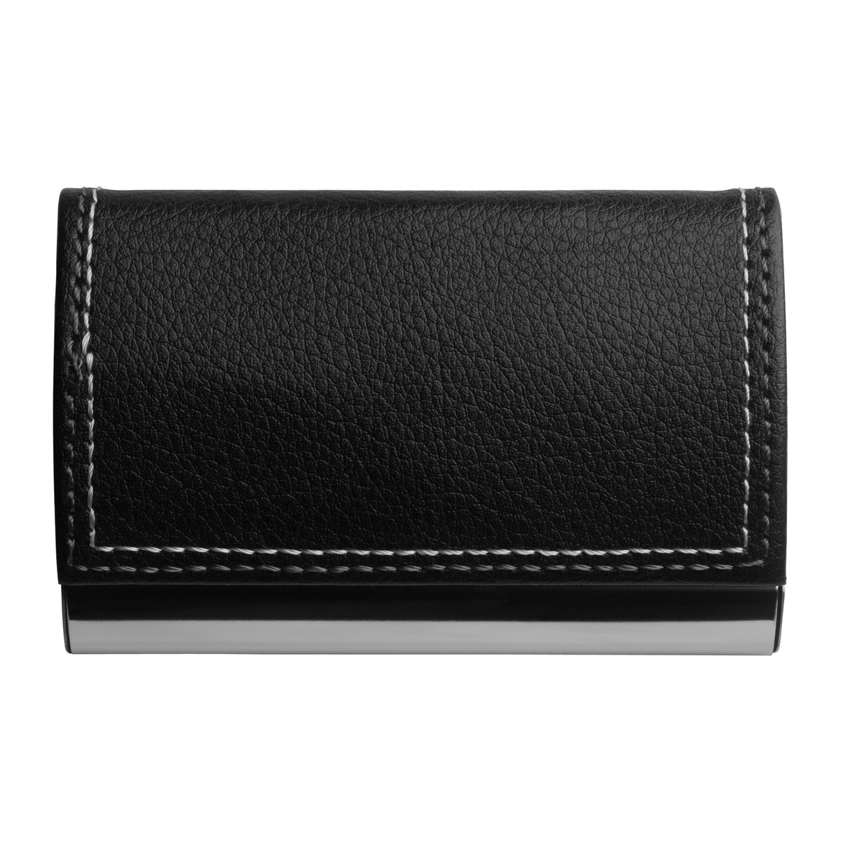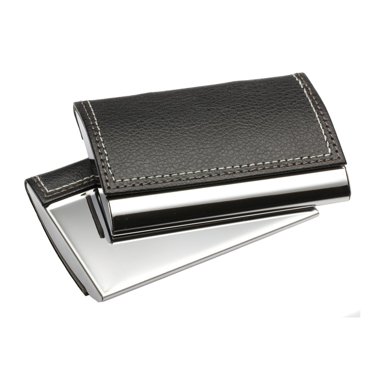 On its top this business card case is covered with black imitation leather. Fine decorative stitching completes the textile look. The chrome-coloured metal case can be opened with a high-class magnetic closure. The box holds approx. 15 business cards (depending on paper thickness). Can be customised with a laser engraving.Do you have any questions concerning this Credit and business card box RE98-ELVERSUM?