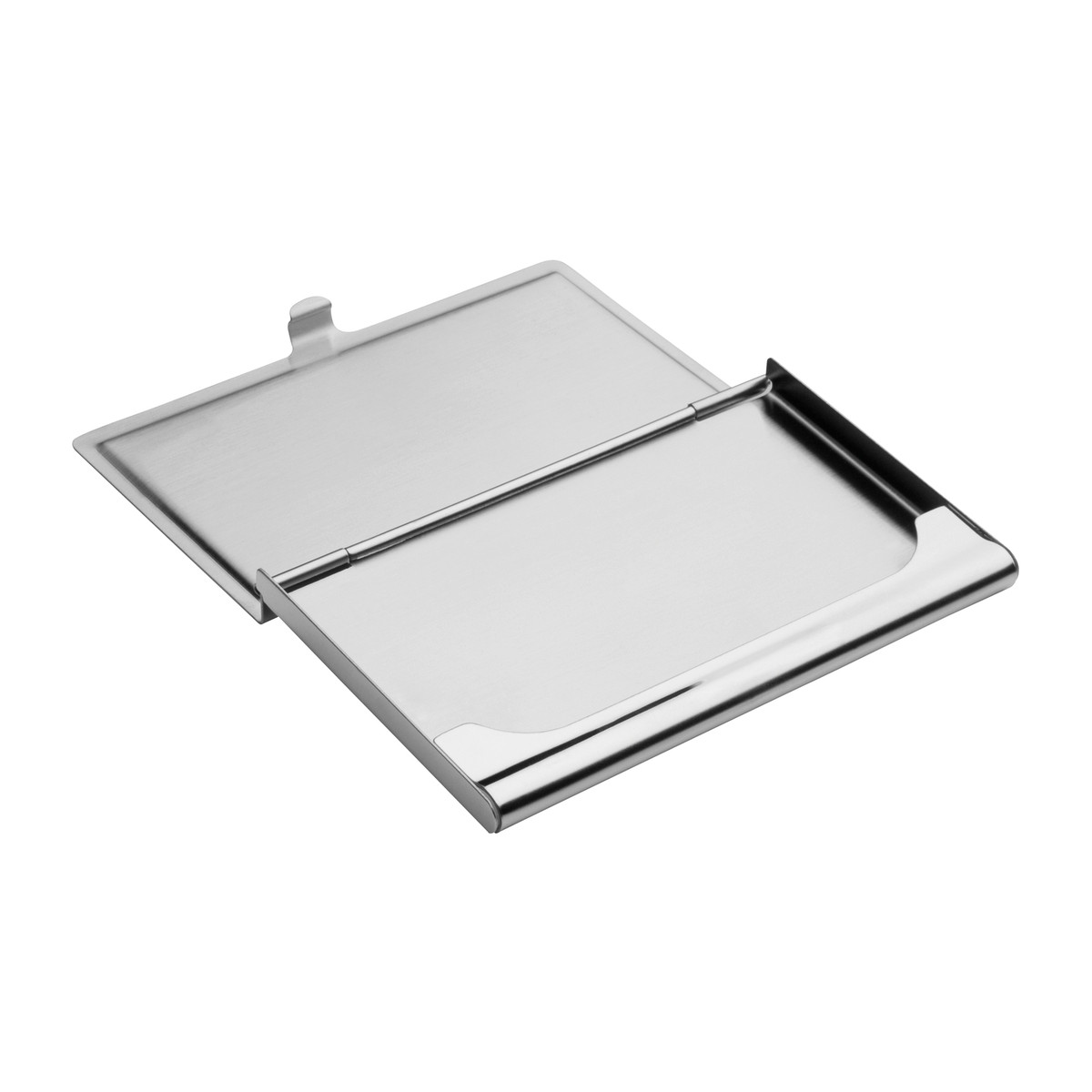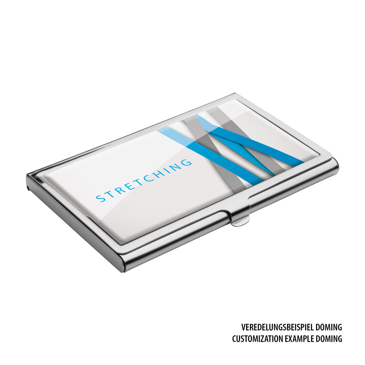 With a large-scale doming this thin metal business card holder becomes a brilliant and convincing promotional item. The rectangular, slightly recessed surface of the top offers the optimal location for the impressive doming. Alternatively, the case can be customised with a laser engraving. Depending on the thickness of the paper, the business card case has room for about 10 business cards.Do you have any questions concerning this Credit and business card box RE98-MONTEVIDEO?