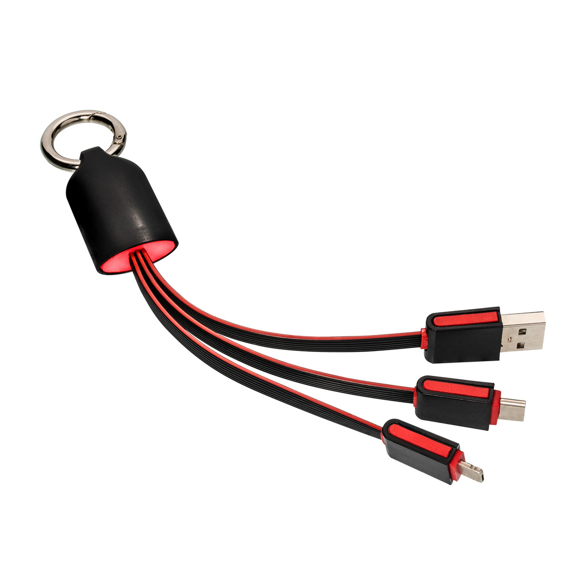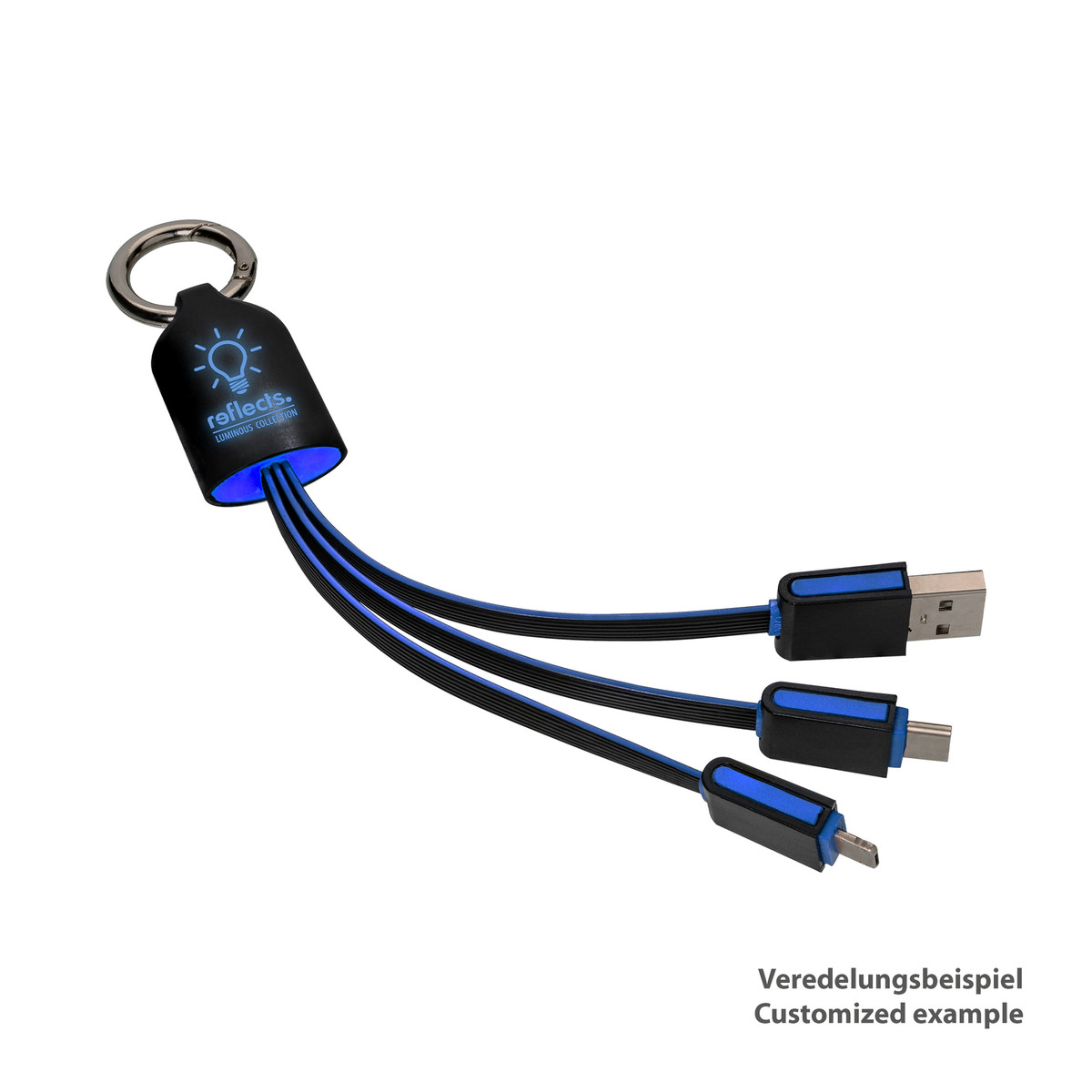 A multi charging cable with a 5-pin connection for Apple® devices, micro USB and USB-C port. The cut-out in the area of your slogan or logo refined by laser printing is backlit in red, blue or white depending on the model. Apple® is a registered trademark of Apple Inc. Registered in the US and other countries.