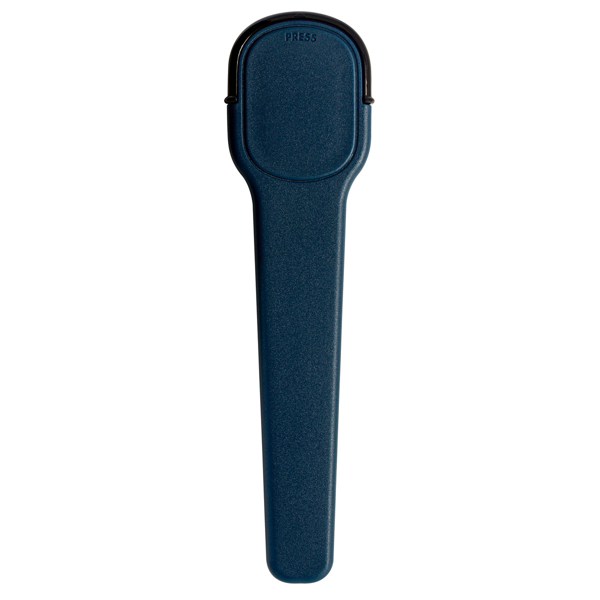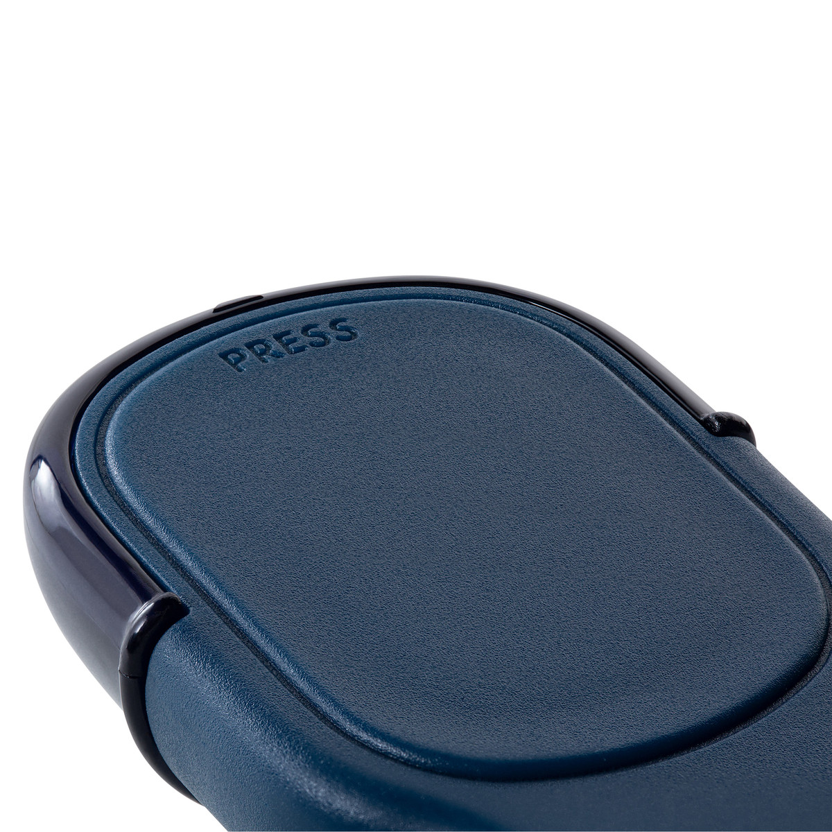 After use, the set can be stored back in its handy box. The box is made from recycled polypropylene and recycled polycarbonate and is available in black, dark blue, red, or white. Sealed with a transparent polycarbonate cap, the box can be easily opened and removed with light pressure on the flat back (indicated by "Press"). As an added feature, the box can be used as a knife rest, protecting the cutlery heads from contact with surfaces. This allows you to use the cutlery hygienically in any environment. For cleaning, all components are dishwashersafe.