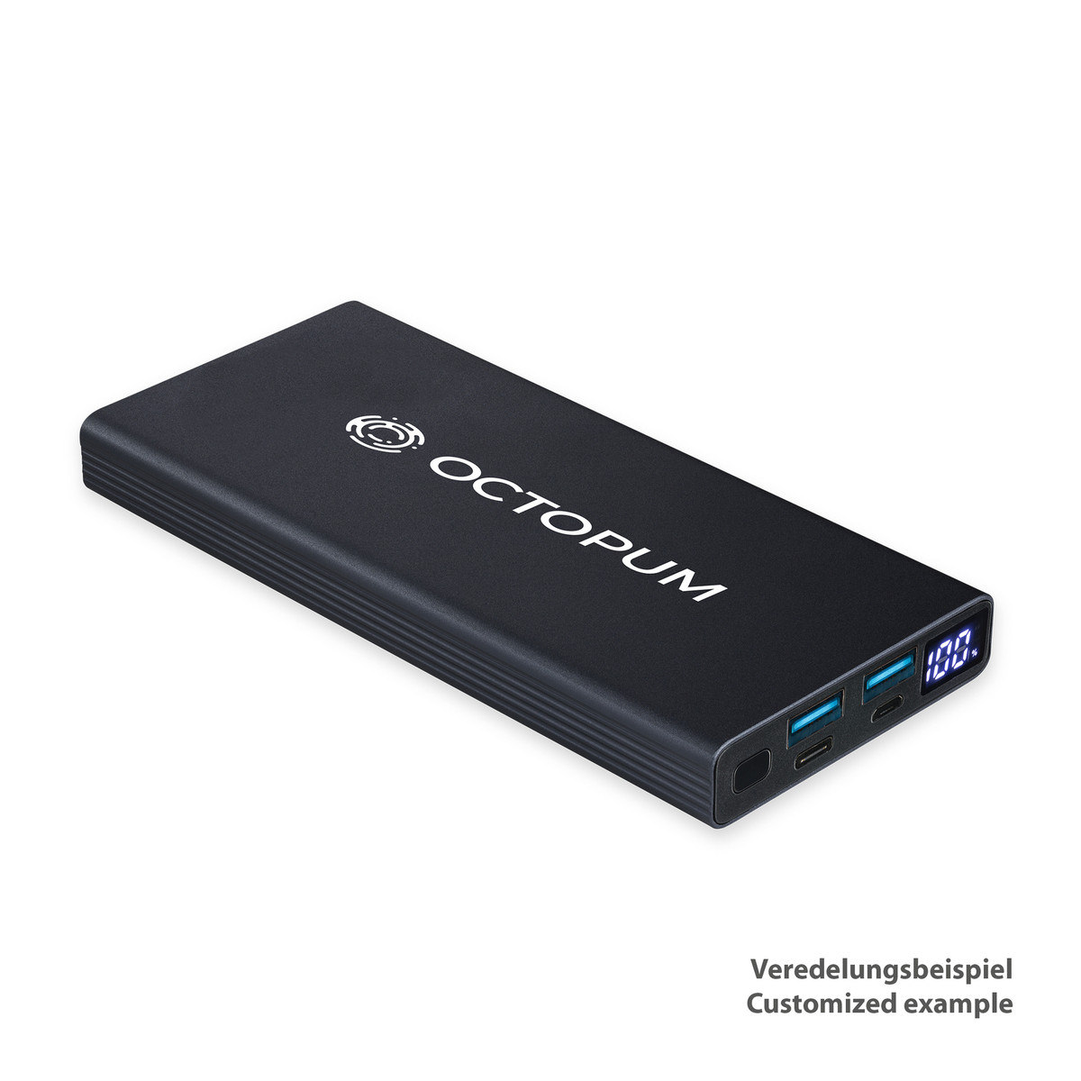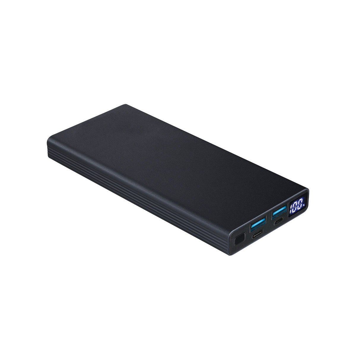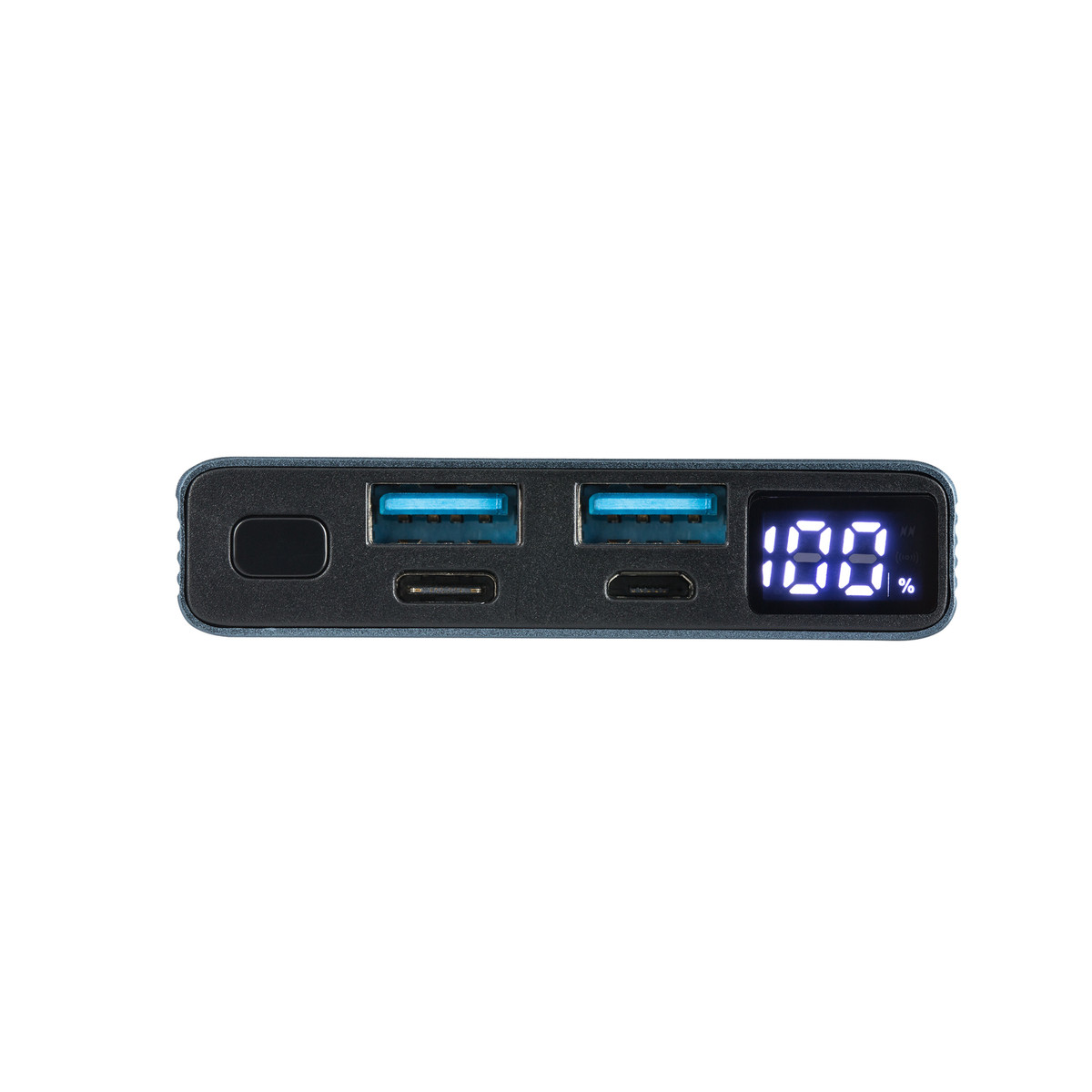 The high-class fast charge powerbank with a capacity of 10000 mAh is a real eye-catcher. Its matt aluminium housing in a warm anthracite colour not only complements the pleasant look, but also has a pleasant feel. The narrow, ribbed sides of the powerbank ensure a secure grip.The powerbank provides fast charge. Power delivery is supported via the USB type C port. The item also provides an on/off button, two USB-A ports and a micro USB input. A USB-C cable is included.
