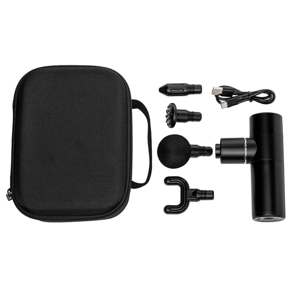 The massage gun cannot be used while charging. The massage gun, interchangeable heads, and charging cable are housed in a sturdy black soft case. Both the device and the case can be customized. We offer pad printing for the device and heat transfer for the case upon request. We are here to advise you!