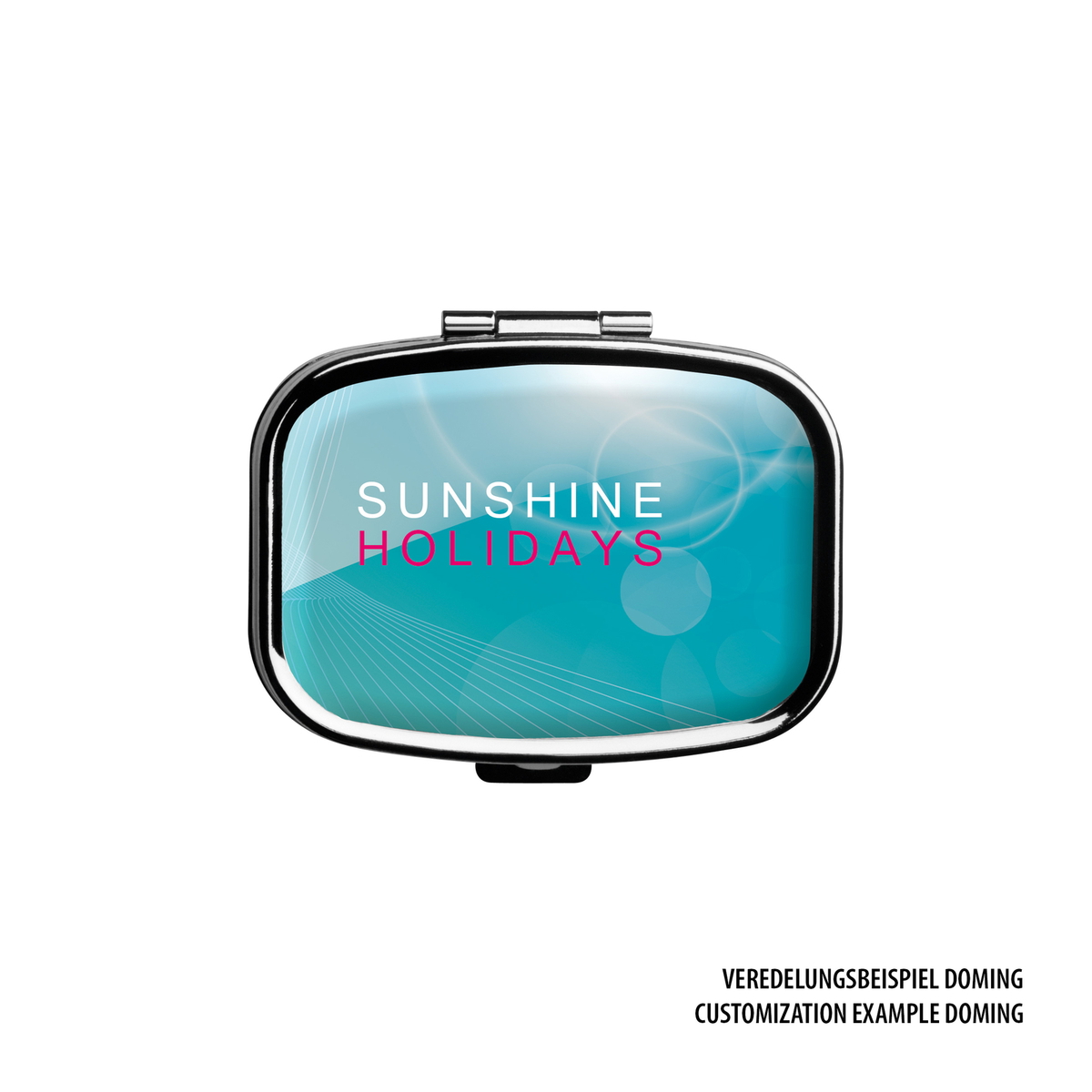 Small, handy and practical, that is what distinguishes the RE98-POSADAS pillbox. The small box made of shiny metal contains of two compartments for pills. The lid of the box can be customised with a laser engraving or a brilliant, full-surface doming.Do you have any questions concerning this Pillbox RE98-POSADAS?