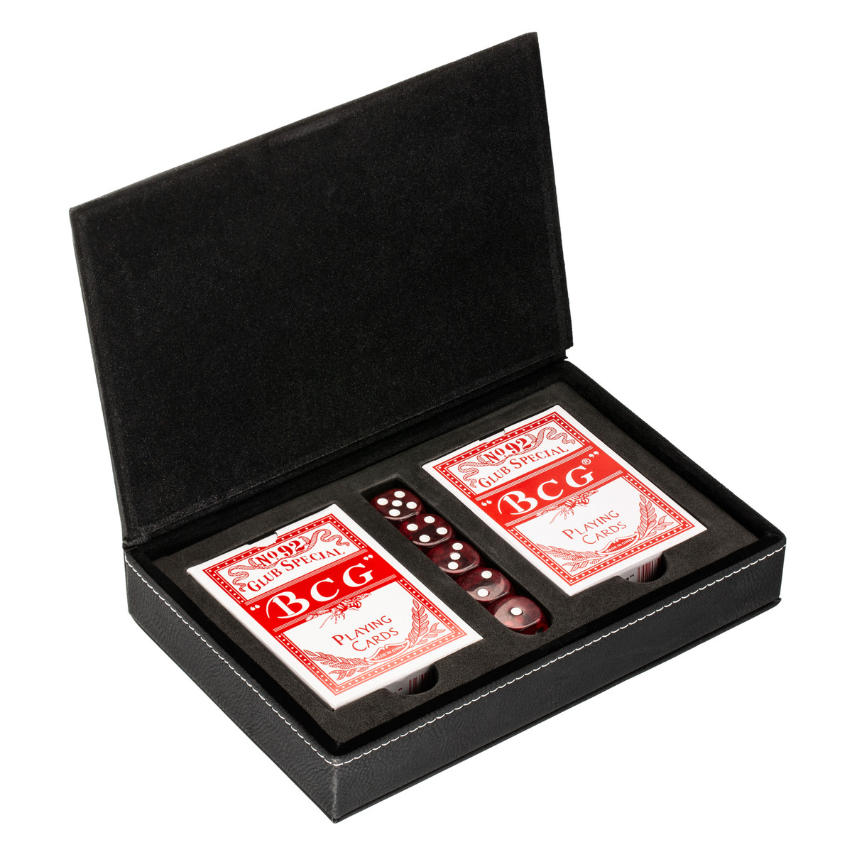 Hold all the trump cards in your hand and use this classic playing card set in a beautiful box with a large finishing area for your advertising. 110 cards with six jokers (French leaf) and a set of dice are included.