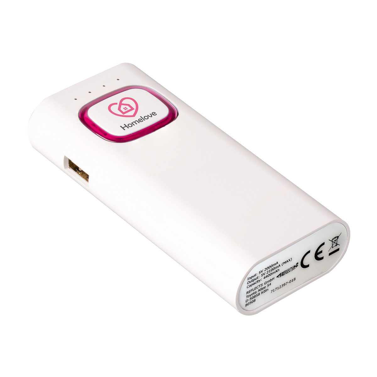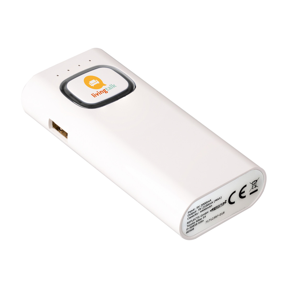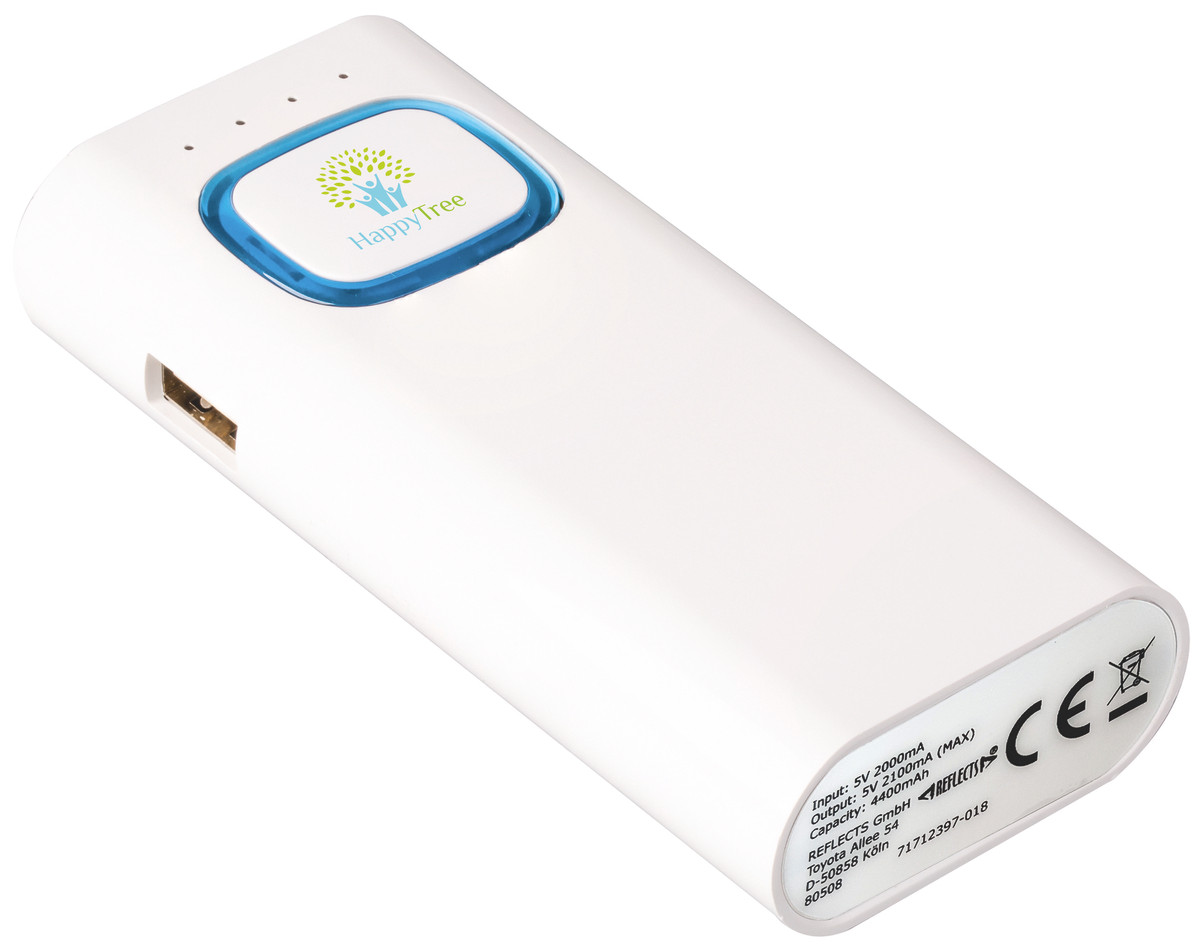 The power bank with 4400 mAh capacity has an input of 5 V/2 A and an output of 5 V/2.1 A. The built-in safety system protects against overvoltage, overheating and short circuit. The integrated torch has an SOS light function as well as the normal torch function. The LEDs have 1.2 watts power and a light intensity of 150 lumens. The colour ring around the logo plate is illuminated by LED backlight.