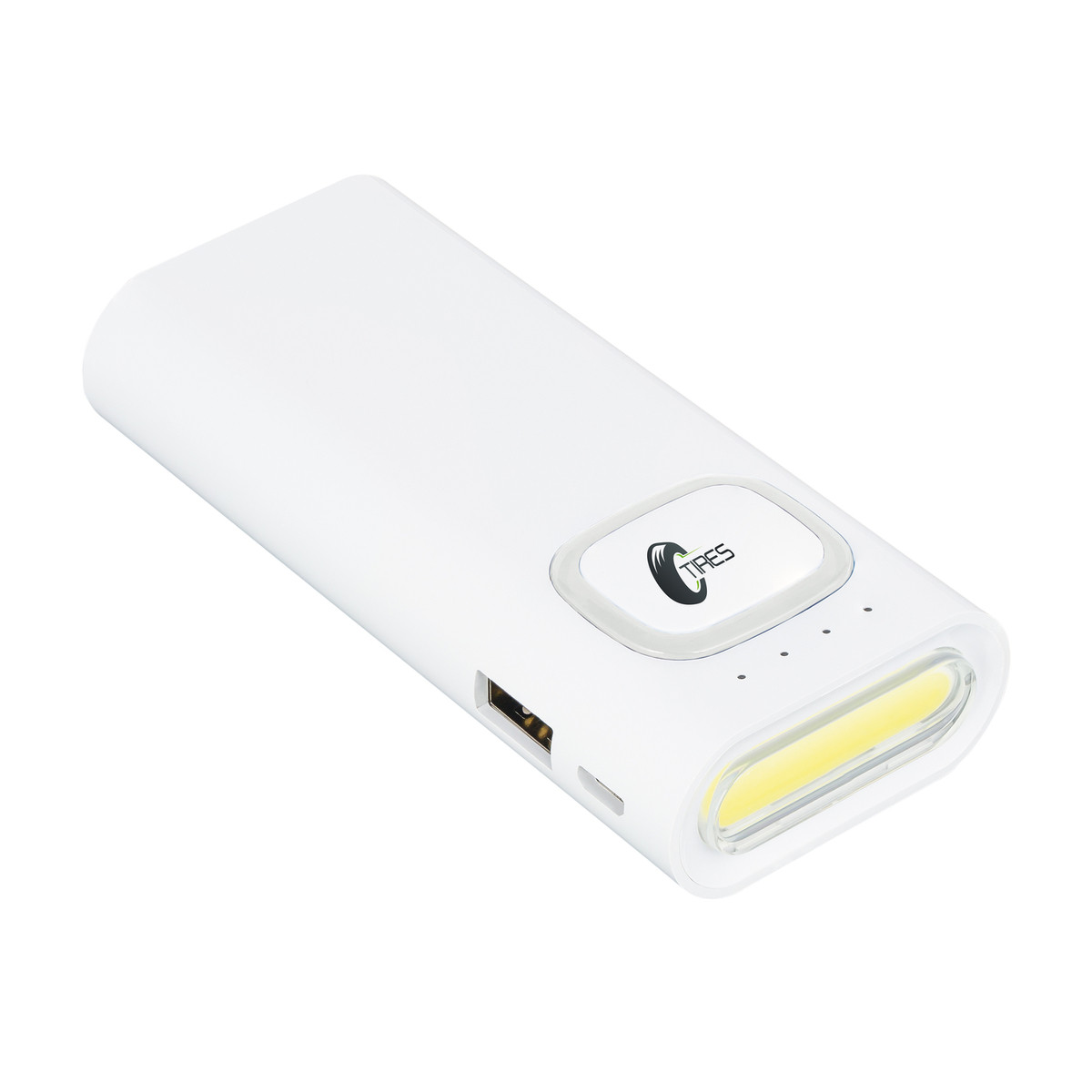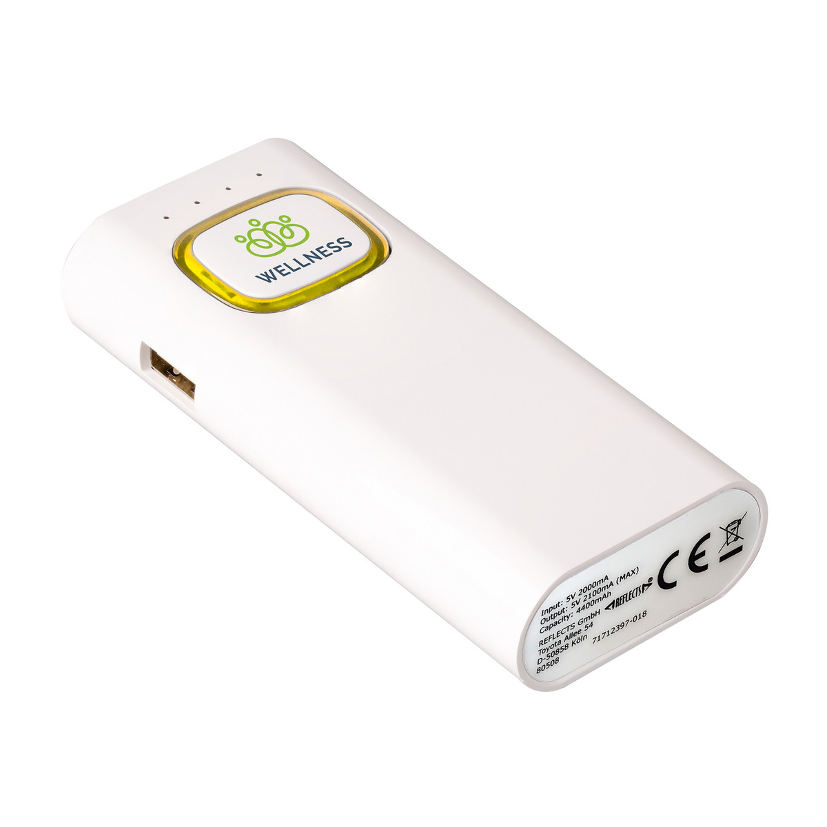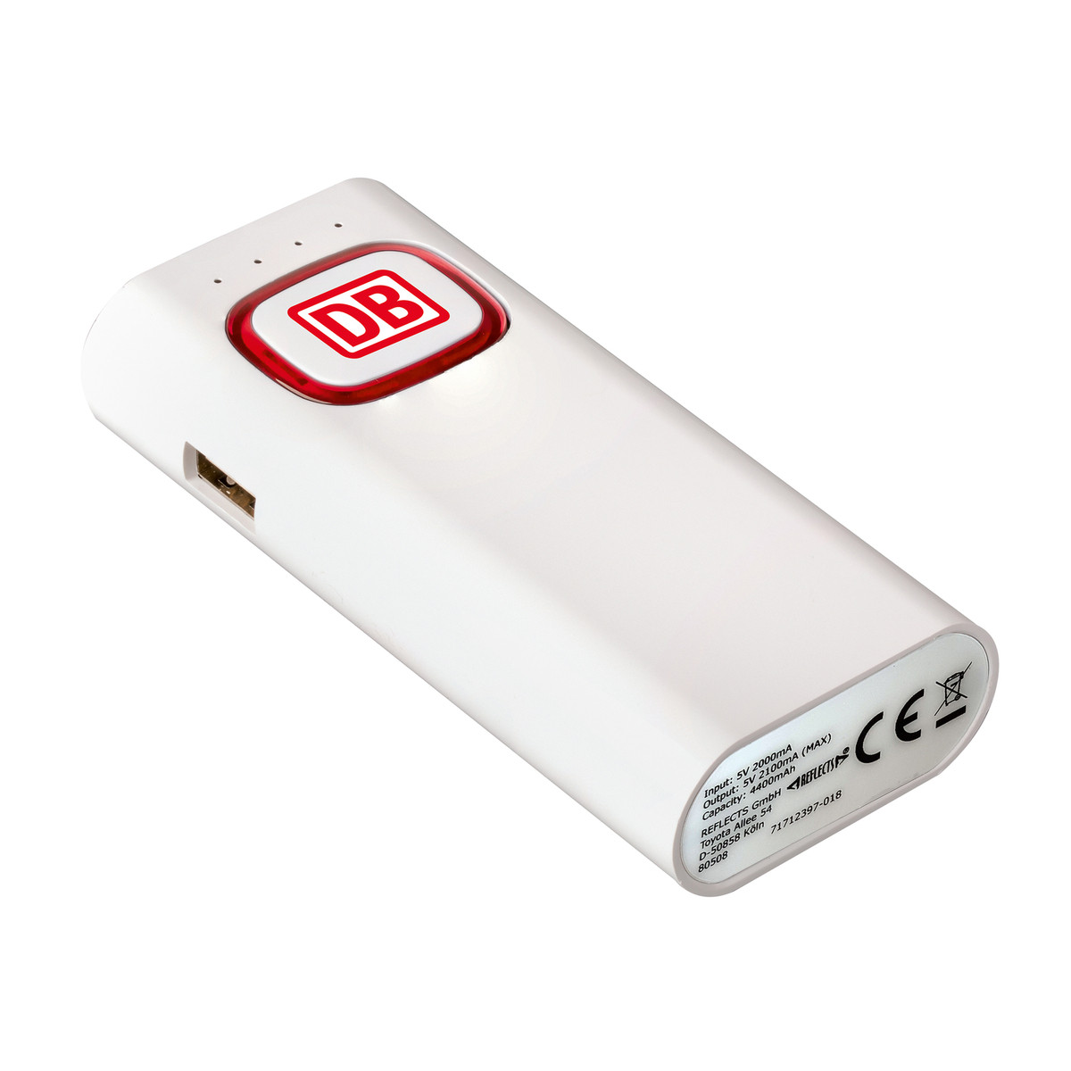 The power bank with 4400 mAh capacity has an input of 5 V/2 A and an output of 5 V/2.1 A. The built-in safety system protects against overvoltage, overheating and short circuit. The integrated torch has an SOS light function as well as the normal torch function. The LEDs have 1.2 watts power and a light intensity of 150 lumens. The colour ring around the logo plate is illuminated by LED backlight.