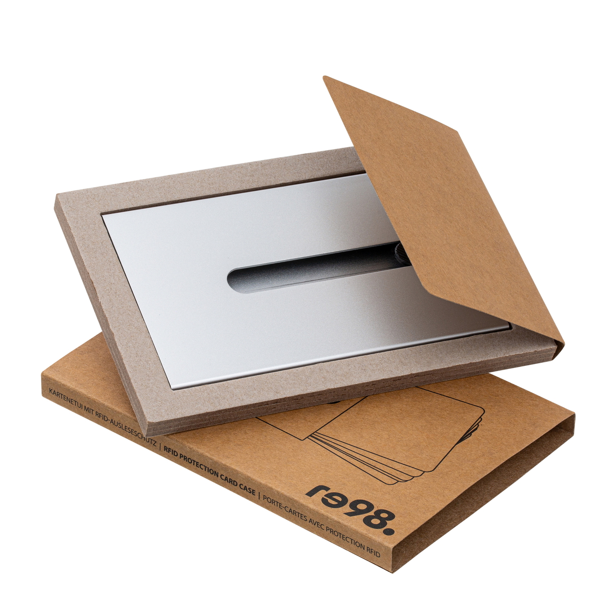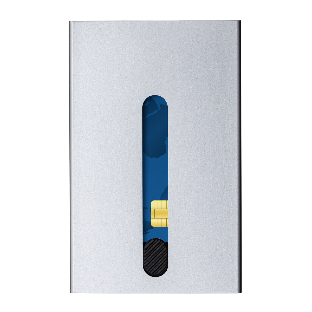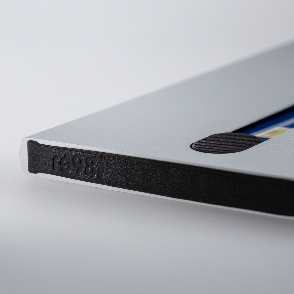 The credit card holder RE98-Grand Ouvert is a REFLECTS® in-house development. With its compact size, the case fits into any bag and feels light and comfortable in hand. Up to 5 credit cards can be stored in the case. Thanks to an intuitive sliding mechanism, the cards can be smoothly pushed up and fanned out, similar to a deck of cards. This allows for a quick overview and easy pick of individual cards.The credit card holder is made of high-quality aluminum and recycled ABS plastic. The aluminum ensures the lightweight and adds to the elegant look of the case. Additionally, the material provides reliable RFID shielding, combining style, functionality, and security perfectly. The RE98-Grand Ouvert can be beautifully customized through laser engraving, pad printing, or UV printing.