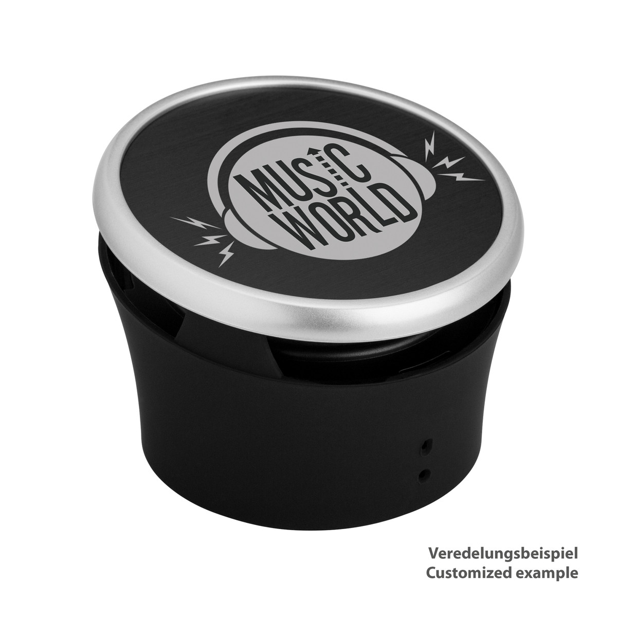 This bluetooth® speaker is an all-rounder for music fans. It has a range of up to 10 m. On the high-quality aluminum plate your logo has a prominent place. Battery performance 500 mAh. Including charger cable.
