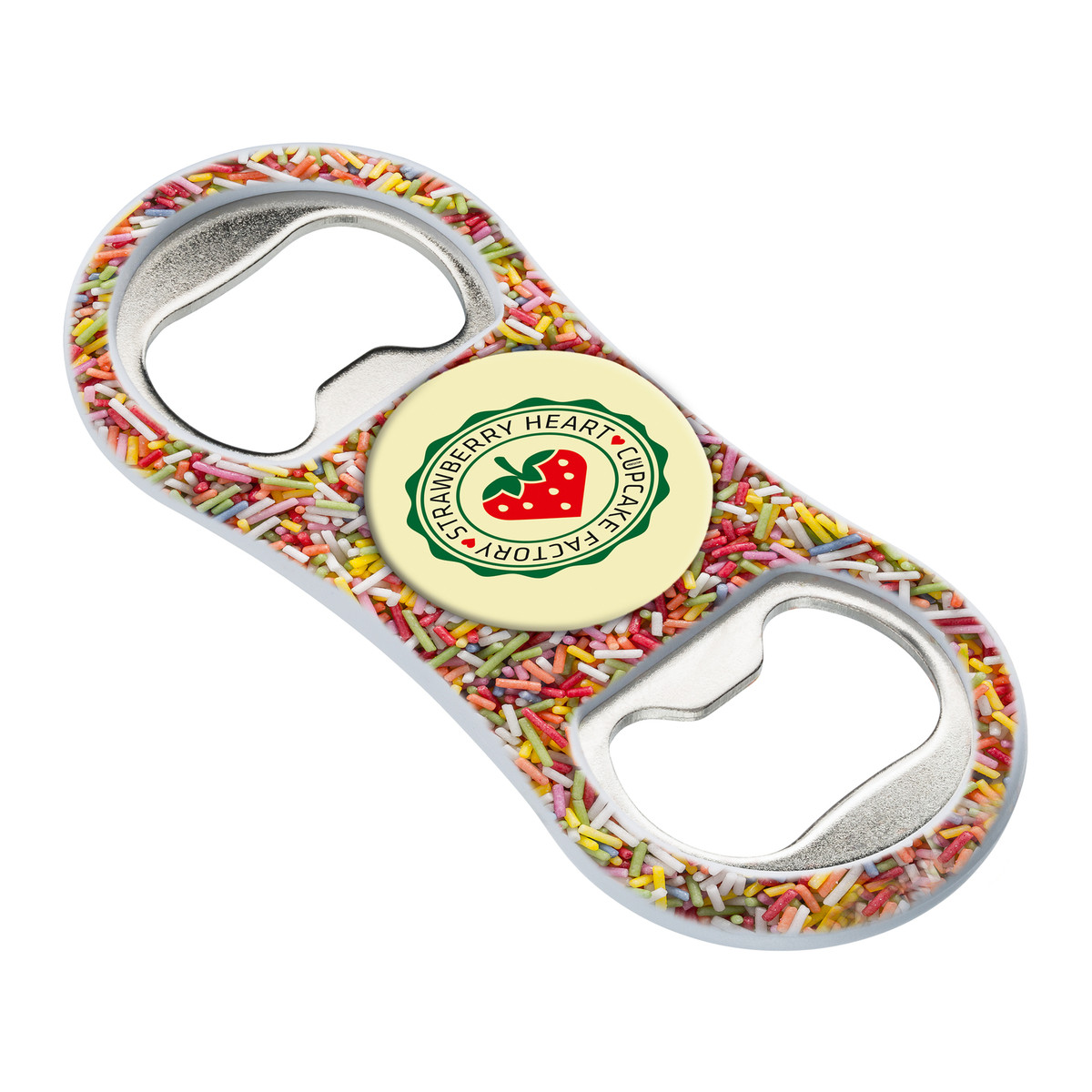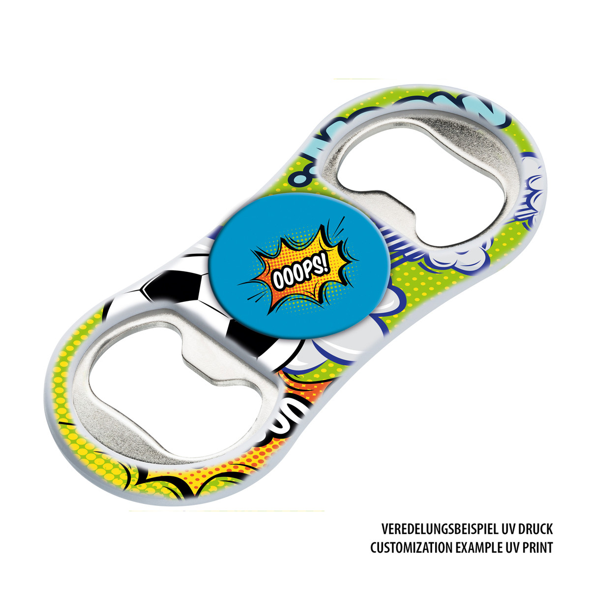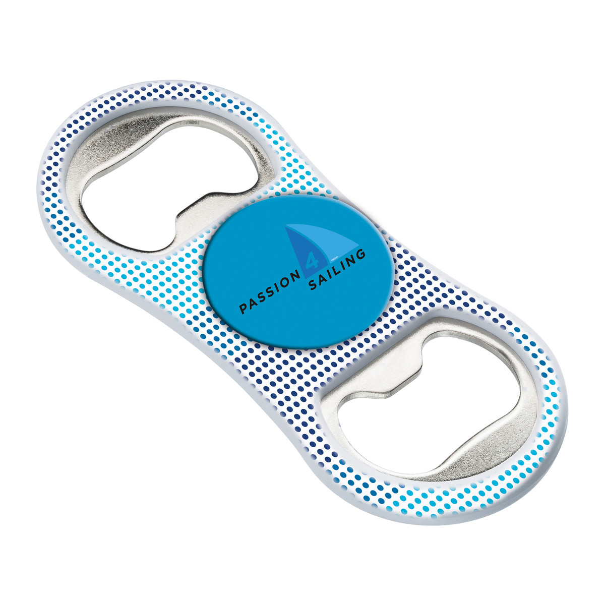 A dual bottle opener and toy. Like the popular REFLECTS-Spinner it can be kept in motion between thumb and forefinger to help while away the time when under stress or suffering from boredom. It's available in four attractive colours.