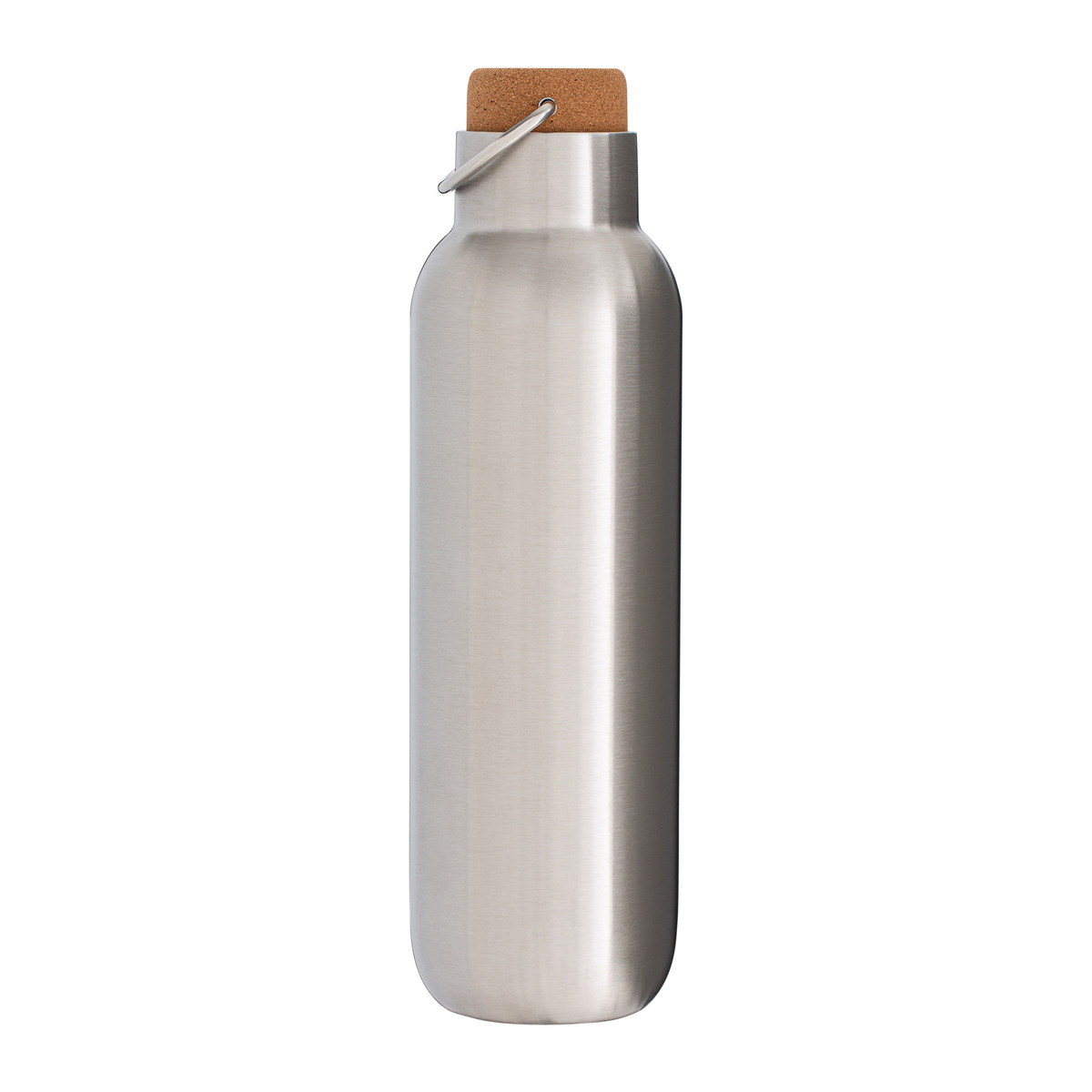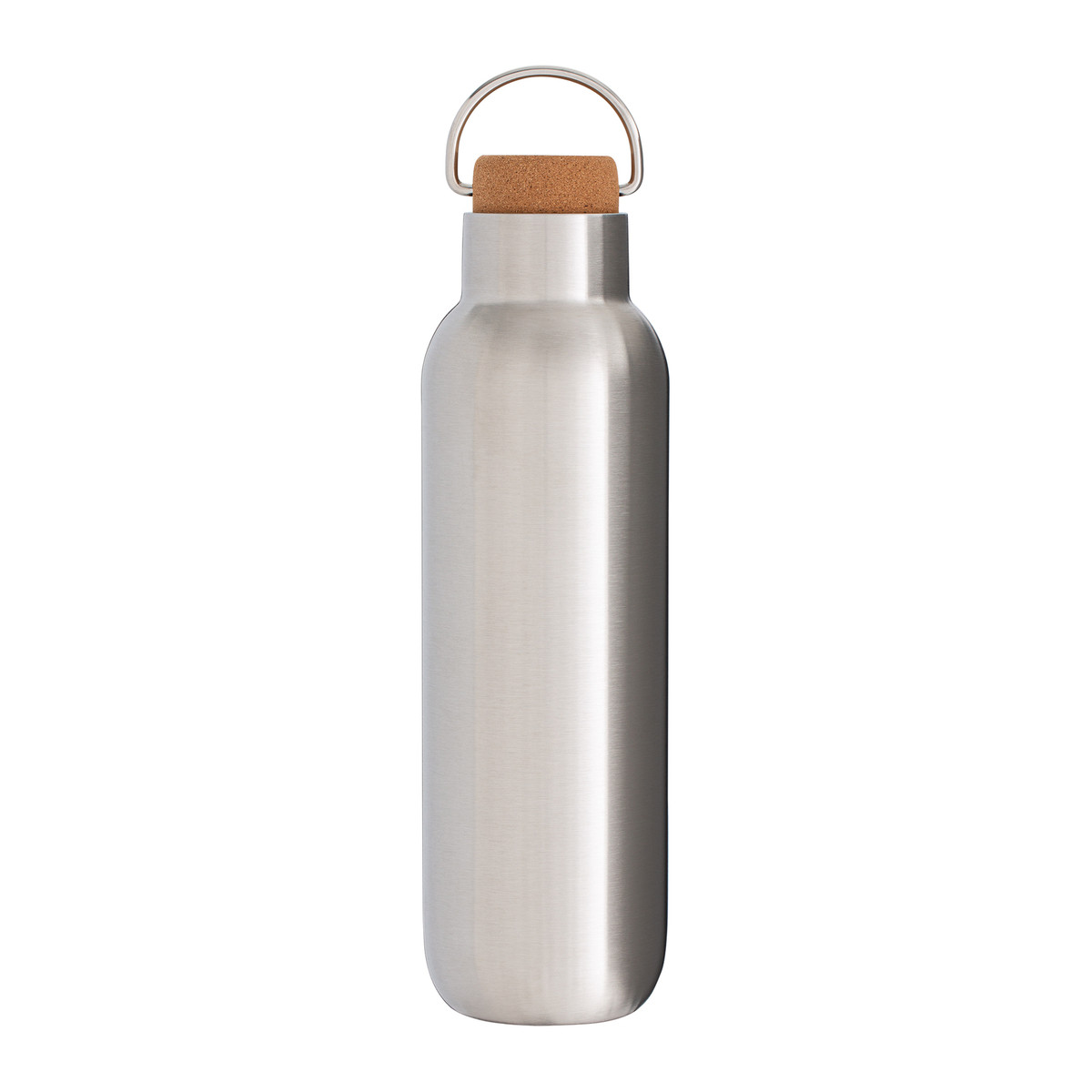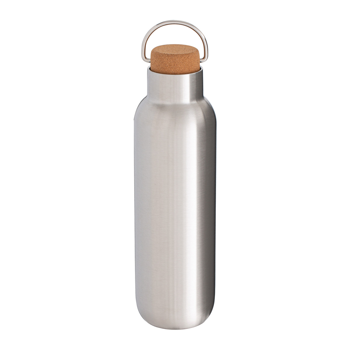The RETUMBLER-ORTADO-750 is a high-quality 750 ml thermo bottle made from recycled stainless steel and polypropylene plastic. It impresses with its attractive appearance, pleasant feel, and outstanding quality. The double-walled bottle with vacuum insulation provides optimal thermal performance: beverages stay warm for up to 11 hours and cold for up to 41 hours.An elegant cork lid with a metal loop ensures a harmonious design. Thanks to the silicone seal and screw cap, the bottle is securely closed and leakproof – making it suitable for carbonated beverages. The loop allows it to be carried comfortably or attached to a bag.