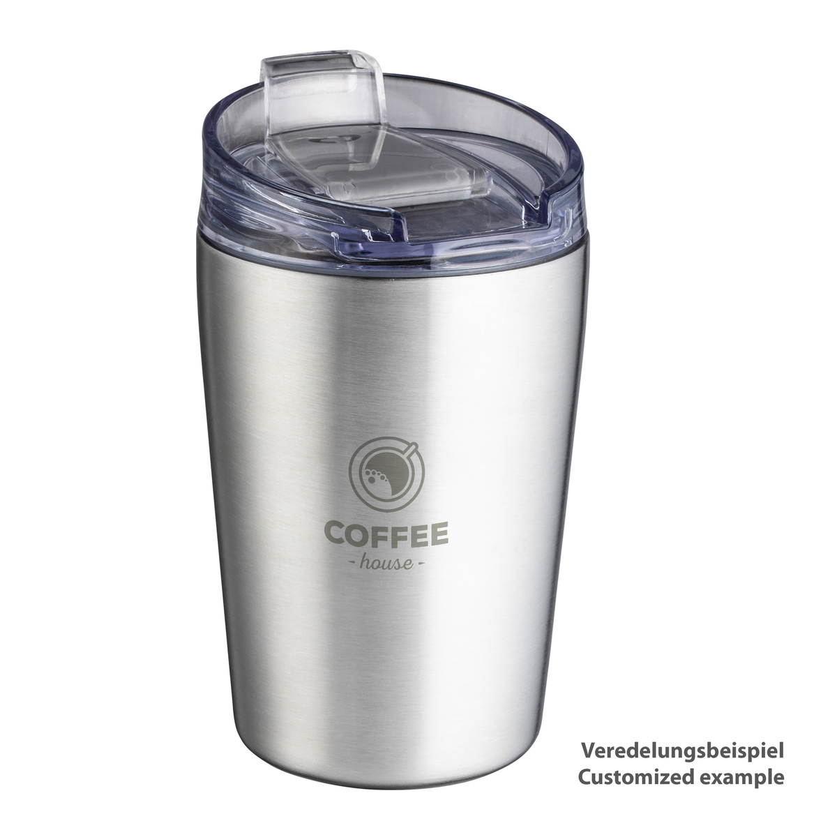 The double-walled vacuum mug with a 200 ml capacity is particularly suitable for narrow bases of coffee pad and capsule machines. Its transparent twist-on lid has a sealable drinking mouthpiece. Particularly striking with high-quality laser engraving.